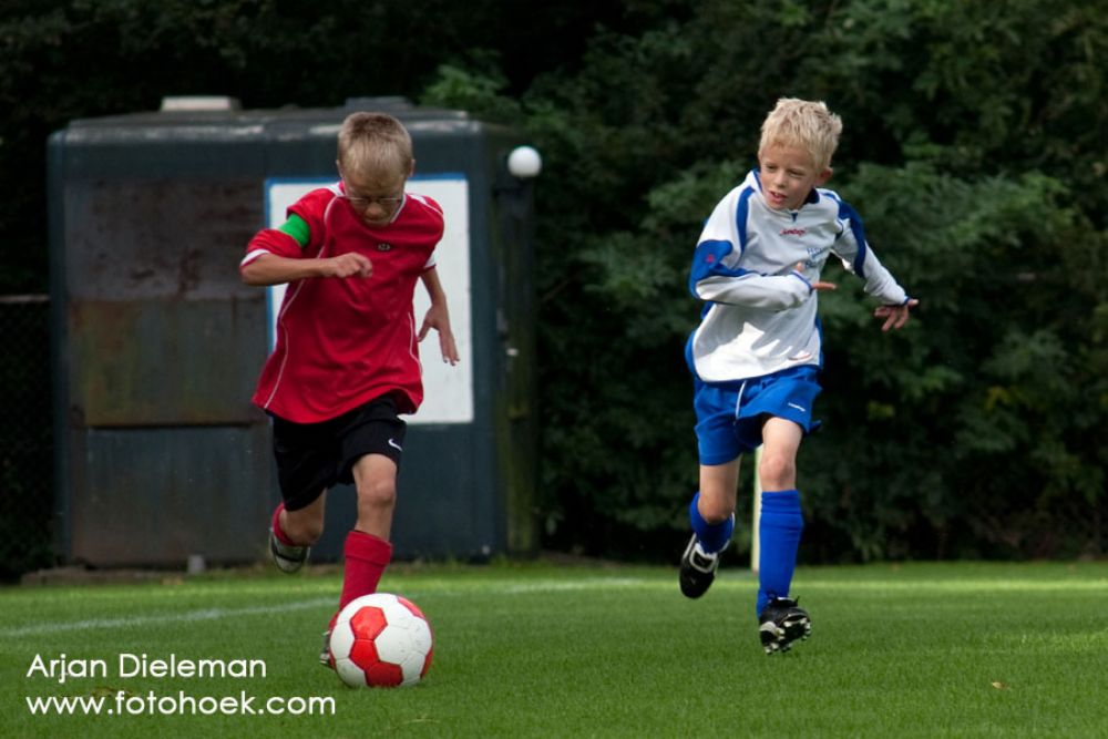 Voor onze wedstrijd van 15 september mogen we de eerste thuiswedstrijd gaan spelen tegen Ria uit Westdorpe. Het is in ieder geval duidelijk dat de mannen van E2 er zin in hebben want er wordt driftig opgewarmd waarbij de energie wat getemperd moet worden om niet al uitgeput aan de wedstrijd te moeten beginnen. We hebben vandaag ook een gastspeler, omdat bij F1 de competitie is omgegooid mag Michel Haak in plaats van te trainen met E2 meedoen, en hoe!! De trotse Michel blijkt een aanwinst in de verdediging en stopt samen met broer Daniel de nodige aanvallen van Ria. Geruchten over een nieuw broederlijk stel dat het ver gaat schoppen, zoals de broeders Koeman, doen al de ronde. Vader Ad droomt stiekem al van een nieuwe vrachtwagen of trekker. Nadat de opstelling door trainer Jaap is uitgelegd en een mini peptalk gaan we beginnen. Het blijkt al snel dat de twee teams goed aan elkaar gewaagd zijn en het spel gaat dan ook veel heen en weer. We zien een fel spelend E2 die heerlijk de duels aangaan en zich niet zomaar opzij laten zetten. Dit leidt na een tijdje tot een licht overwicht wat Imme bekroont door te laten zien dat hij het scoren nog niet verleert is, 1-0 voor! Niet heel veel later krijgt Imme de bal weer goed aangespeeld en jawel, ook de 2-0 ligt in het net! In tegenstelling tot vorige weken een heel luxe positie. Na de 2-0 laten we ons echter wat terugdrukken en kan de uitstekend keepende Thimo niet voorkomen dat het net voor rust toch nog 2-1 wordt door een hard schot van een Ria speler. Net voor tijd..........het blijkt de rode draad van deze wedstrijd te zijn........ In ieder geval zijn na een zeer korte rustpauze de spelers in de kleedkamer moeilijk te houden, spelen willen ze! En inderdaad, we beginnen fanatiek aan de tweede helft maar op een moment dat we even vergeten te verdedigen ligt helaas de 2-2 in het net, jammer. Ria is in deze fase toch wel wat beter en weet zo ook de 2-3 te scoren. Het lijkt wel of dit het sein is voor E2 om er eens flink tegenaan te gaan en dat gebeurd dan ook. Job, Daan, Michiel....iedereen gaat er eens goed voor staan en er wordt strijd geleverd. Deze strijd word terecht met een doelpunt beloont, Job weet de bal via binnenkant paal in het net te krijgen.