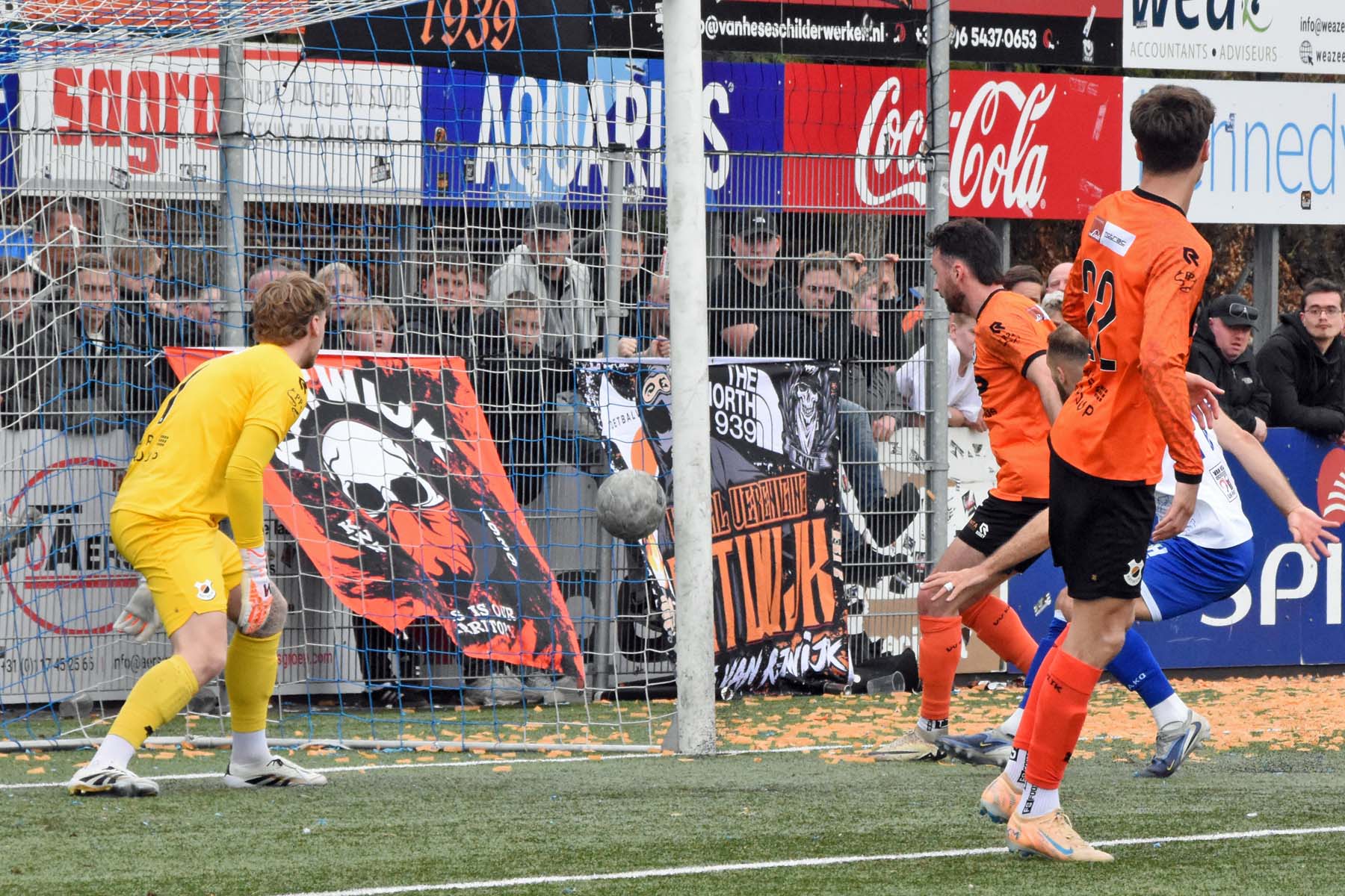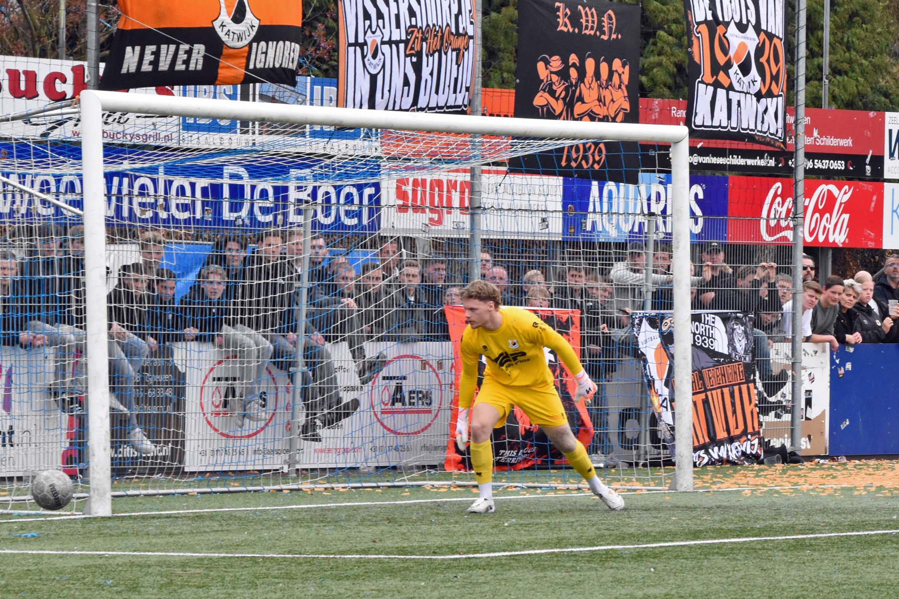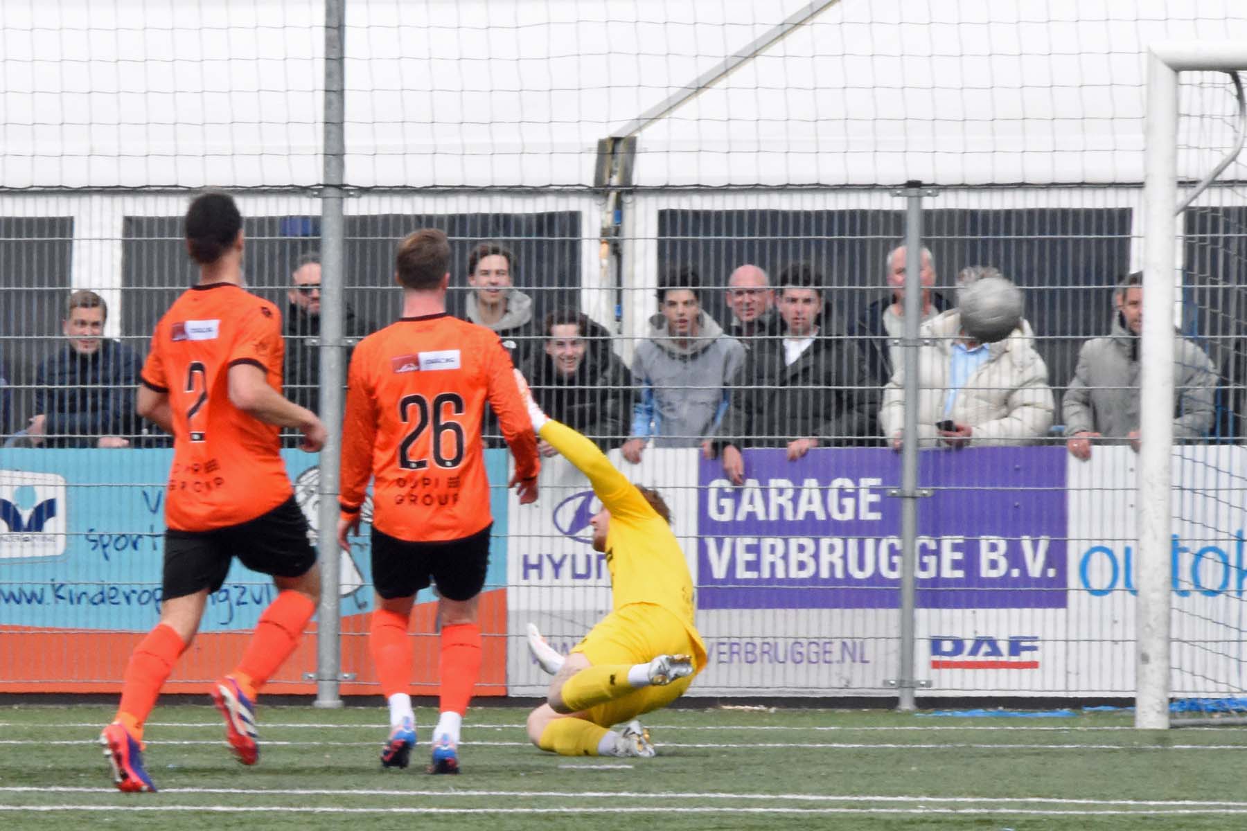 de keeper van VV Katwijk kan alleen nog naar de bal kijken. 1-0 Wout den Engelsman.