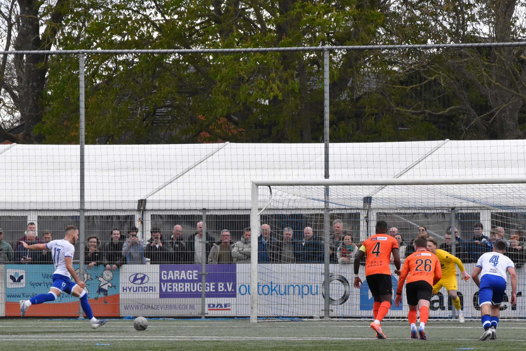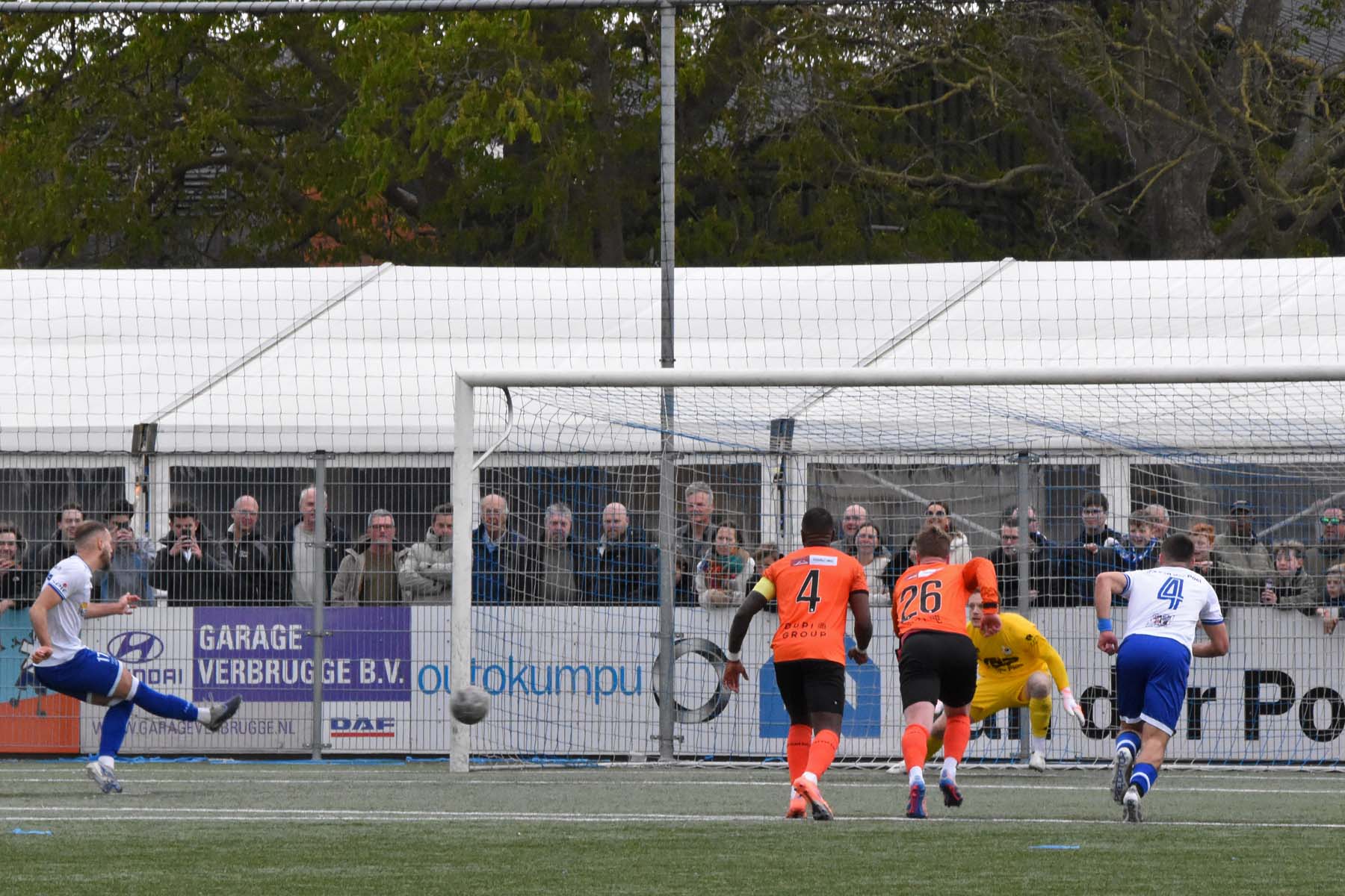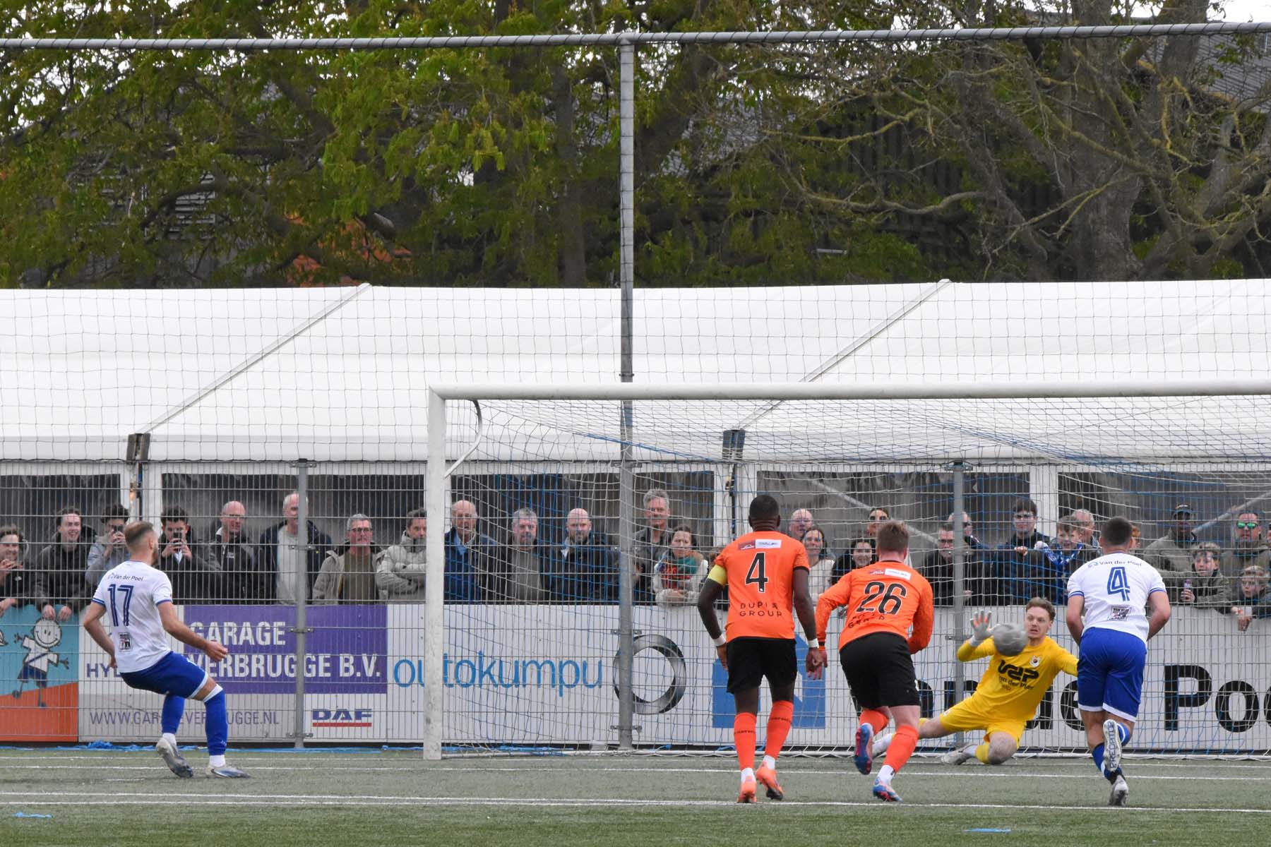 de keeper van VV Katwijk kan alleen nog naar de bal kijken. 1-0 Wout den Engelsman.