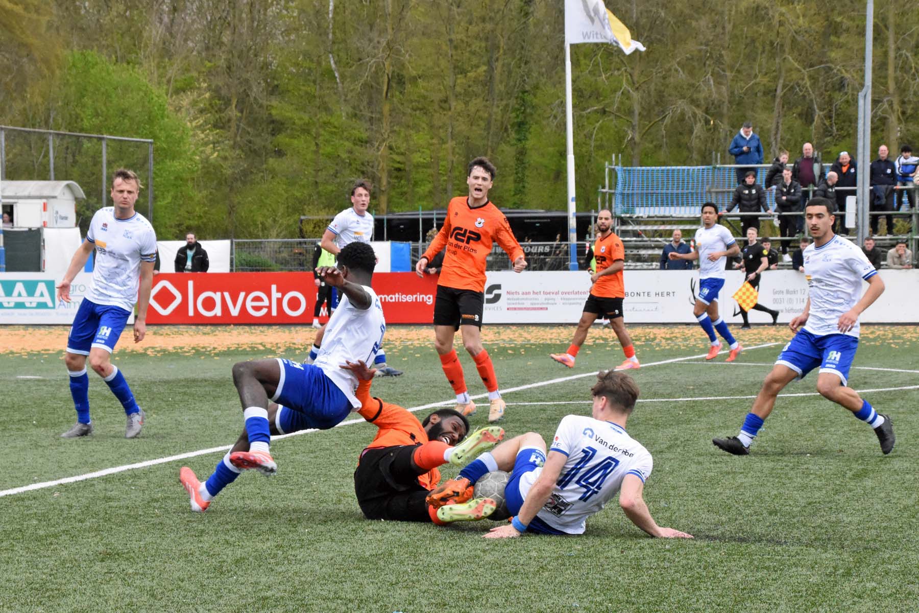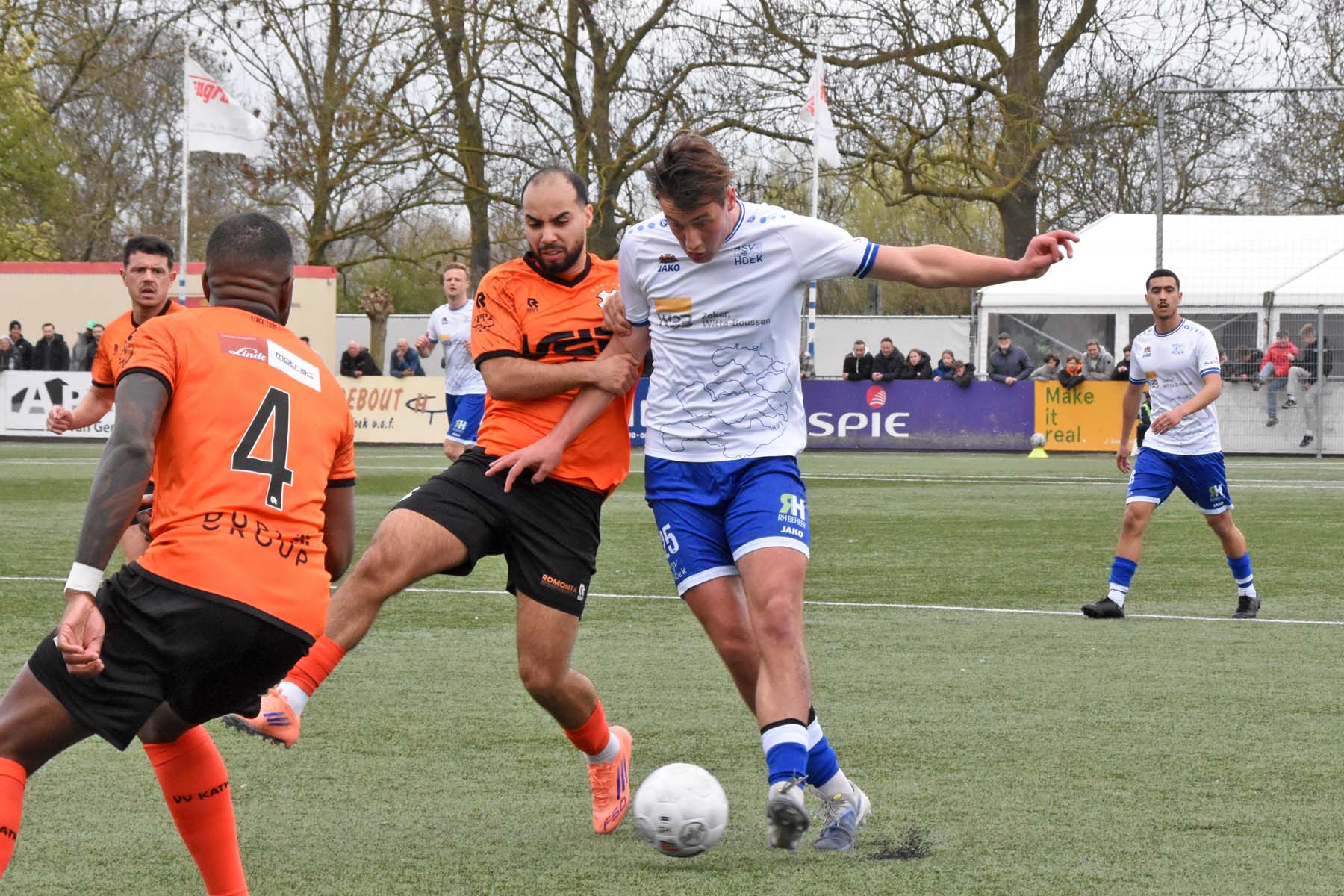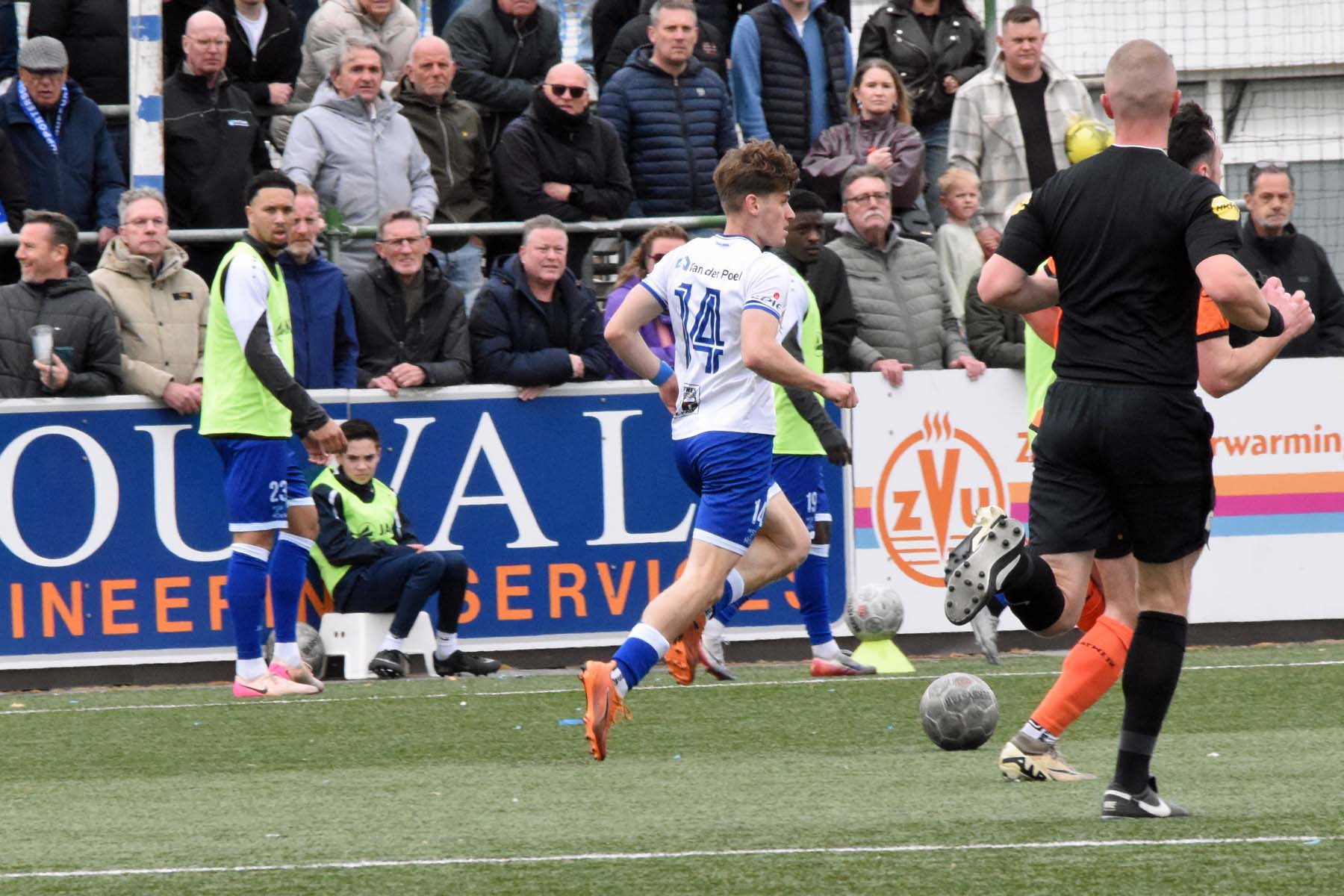 VV Katwijk blijft maar de aanval zoeken. Rousseau De Poorter stapt goed uit, geeft de bal een lel naar voren...