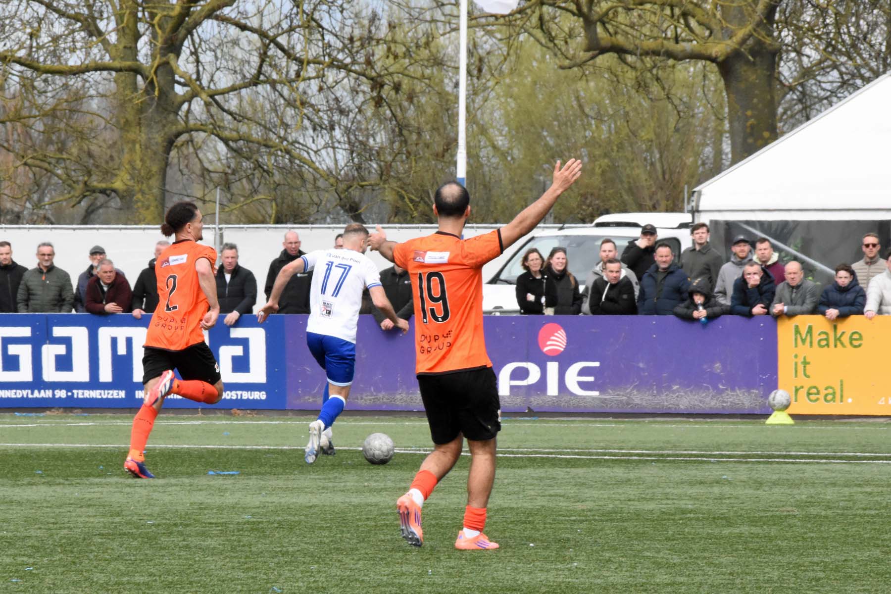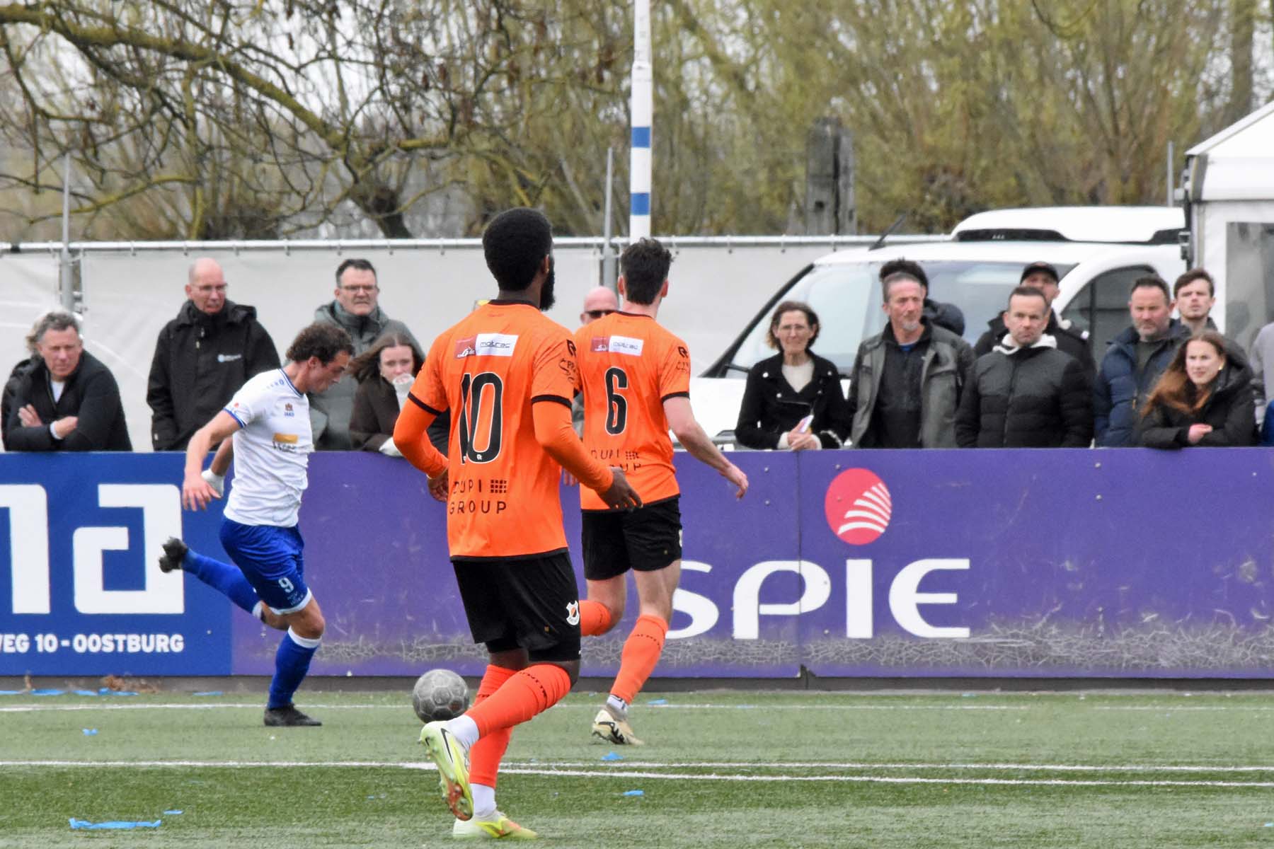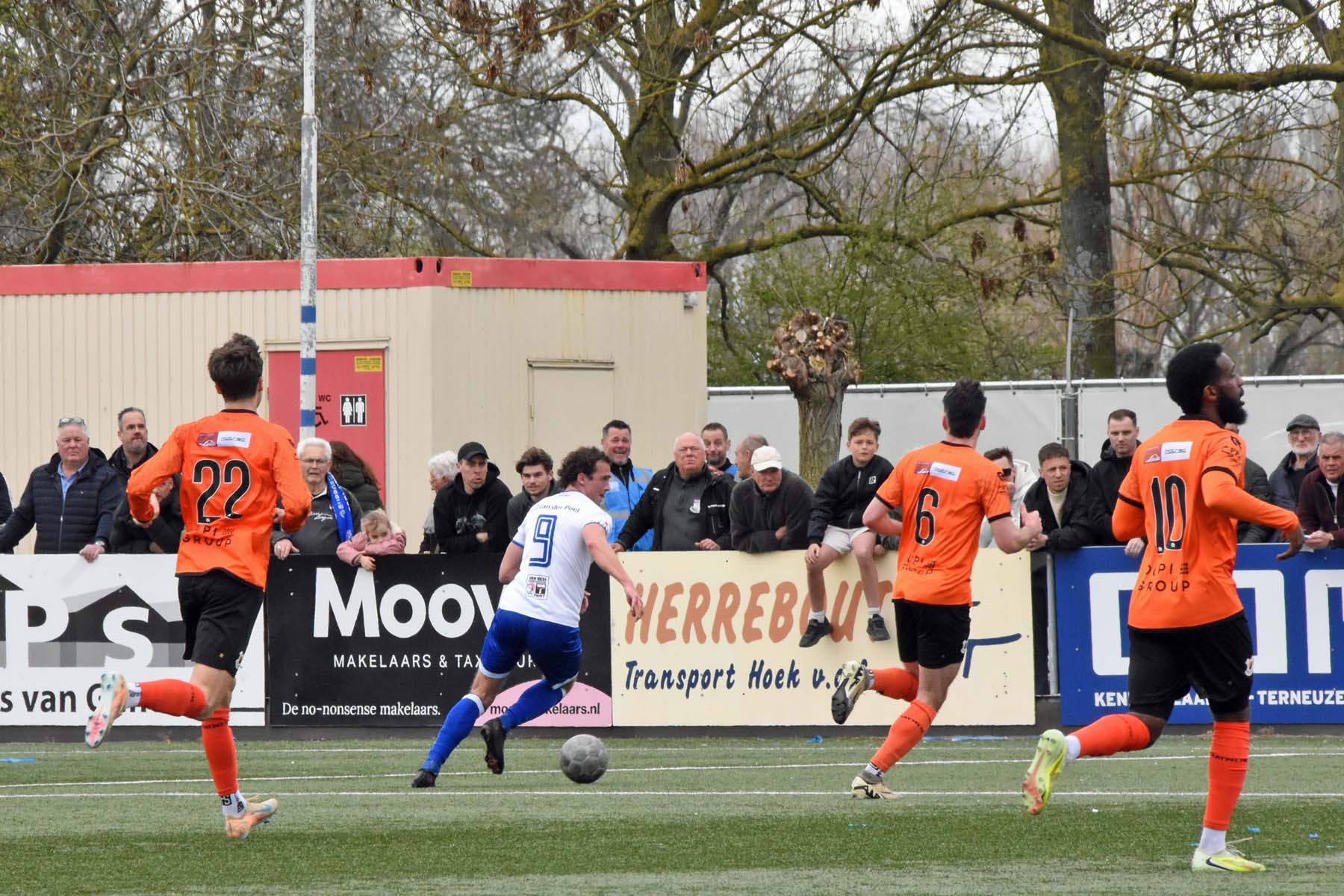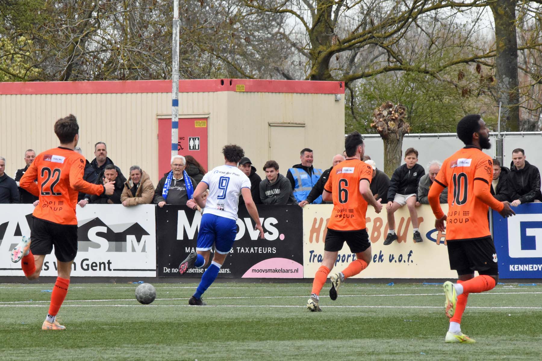 VV Katwijk blijft maar de aanval zoeken. Rousseau De Poorter stapt goed uit, geeft de bal een lel naar voren...