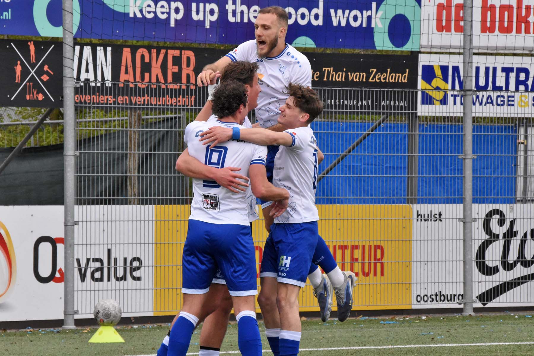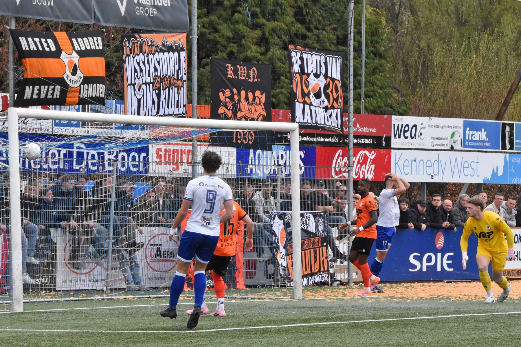 Paniek in de verdediging van VV Katwijk. Weg is weg.