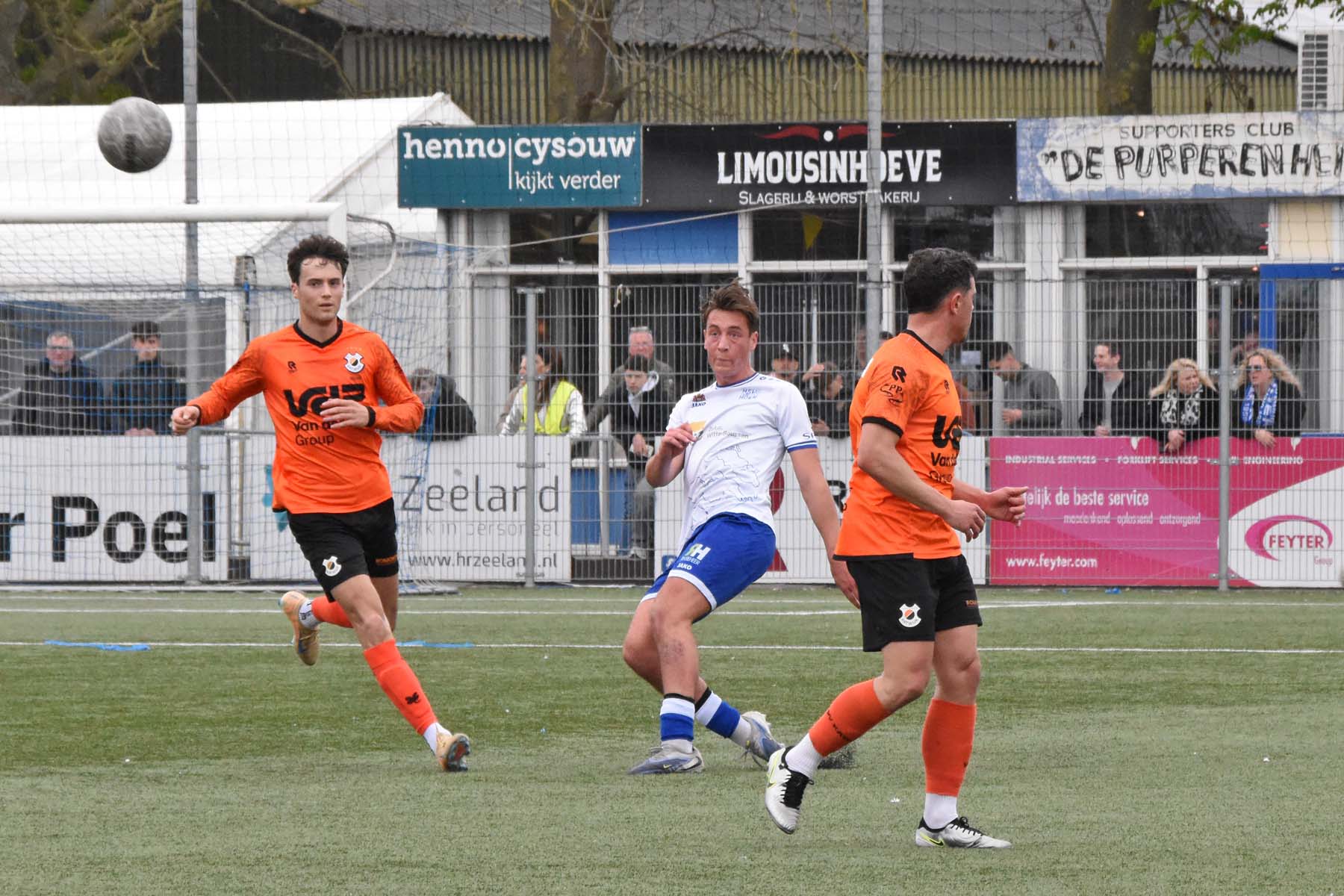Vrije trap voor HSV Hoek. Gertjan Martens gaat onder de bal door..