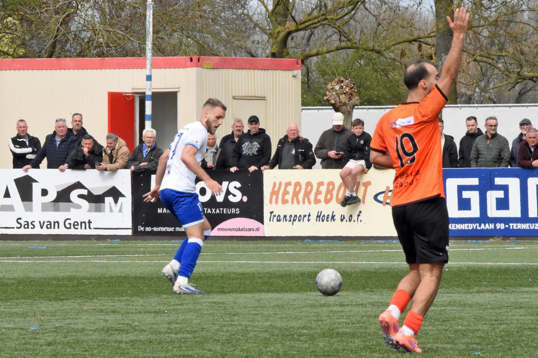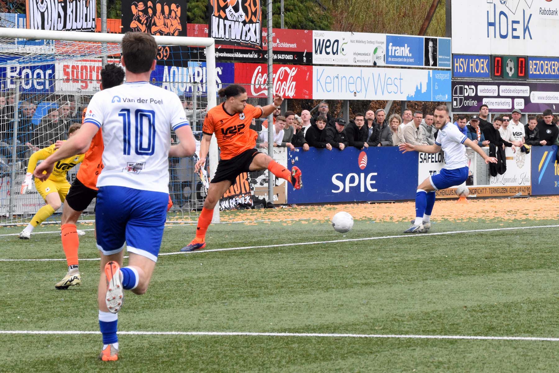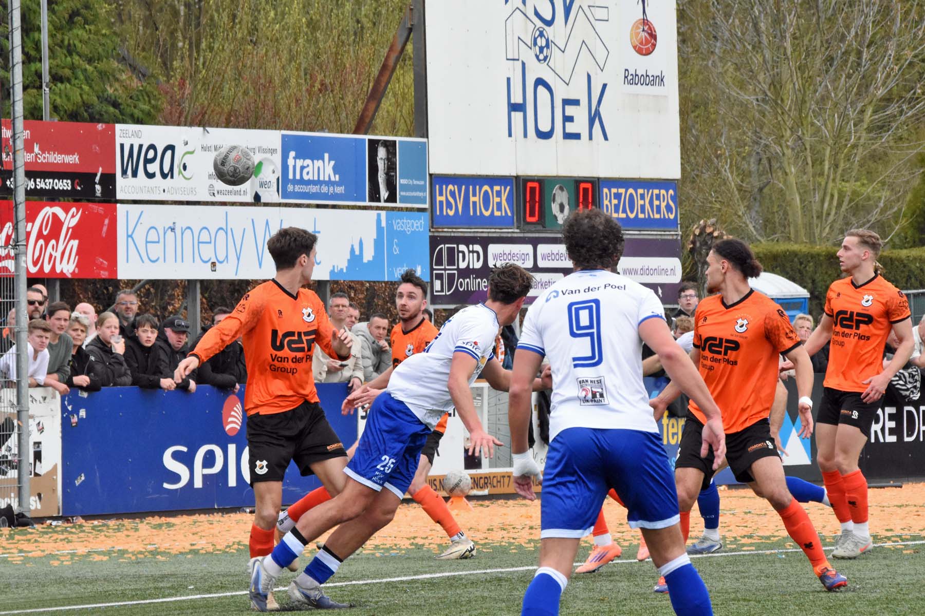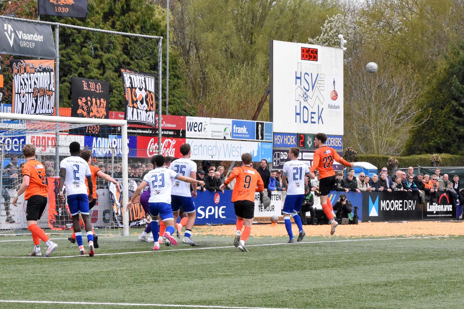 Vrije trap voor HSV Hoek. Wout den Engelsman mee naar voren, de lange verdediger toornt boven iedereen uit..