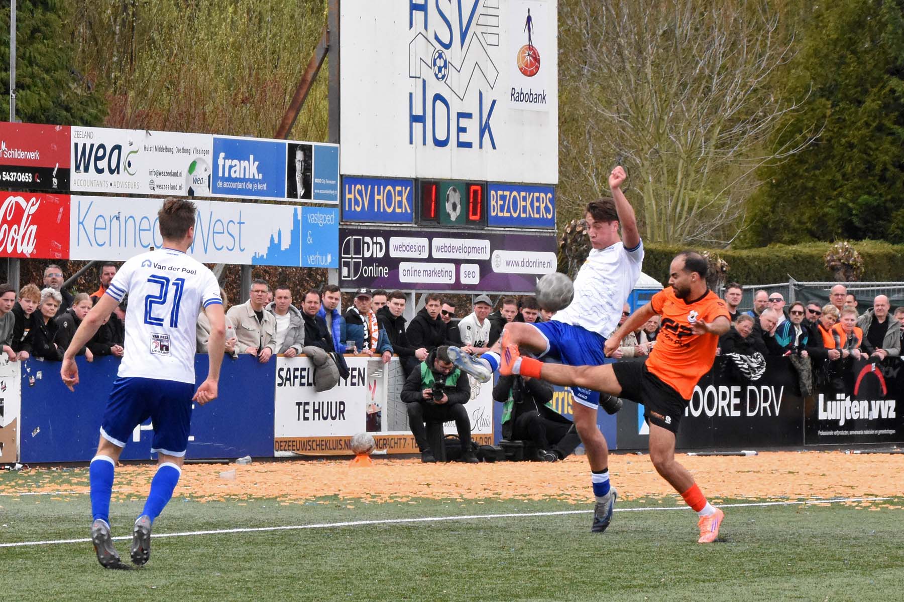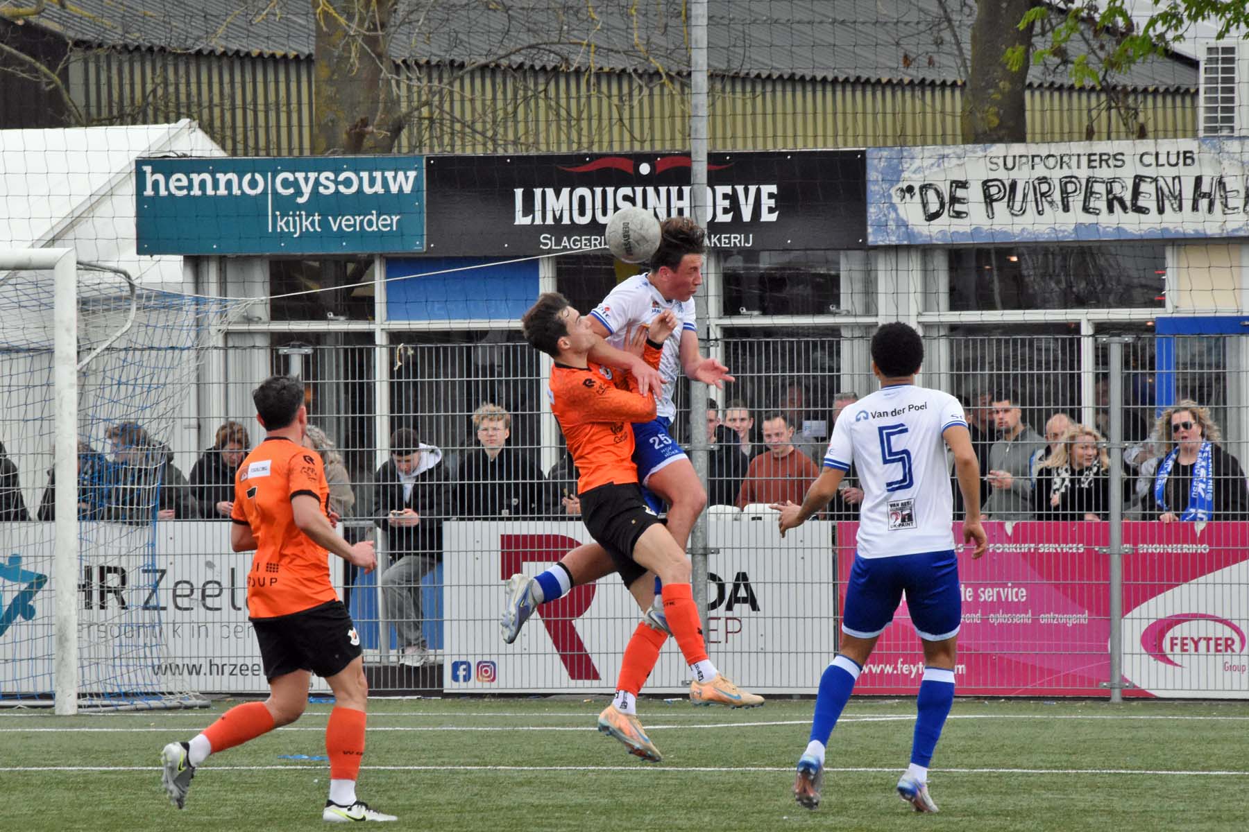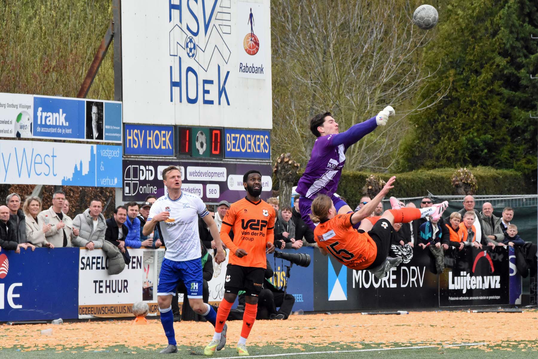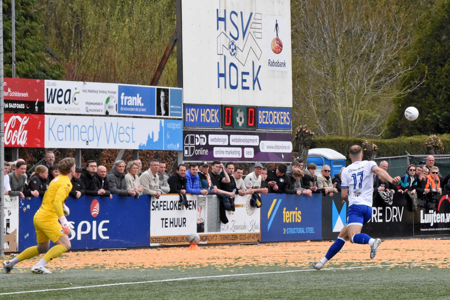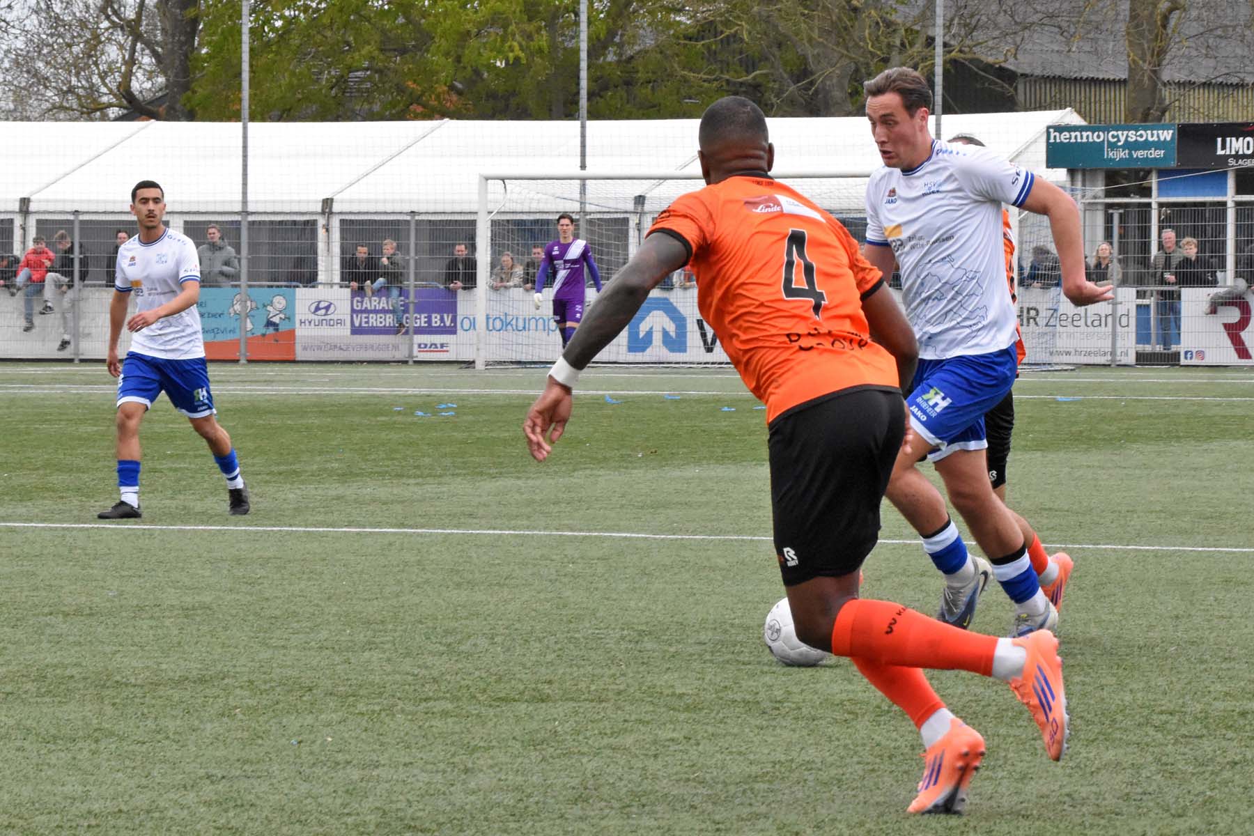 Vrije trap voor HSV Hoek. Wout den Engelsman mee naar voren, de lange verdediger toornt boven iedereen uit..