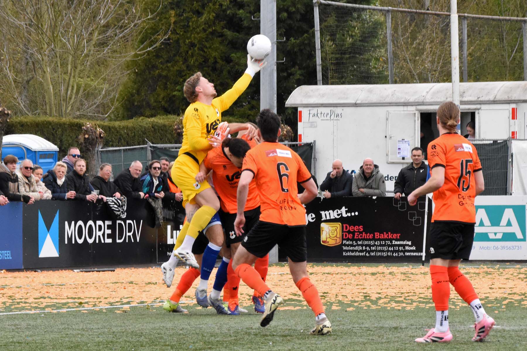 de keeper van VV Katwijk kan de bal wegboksen.