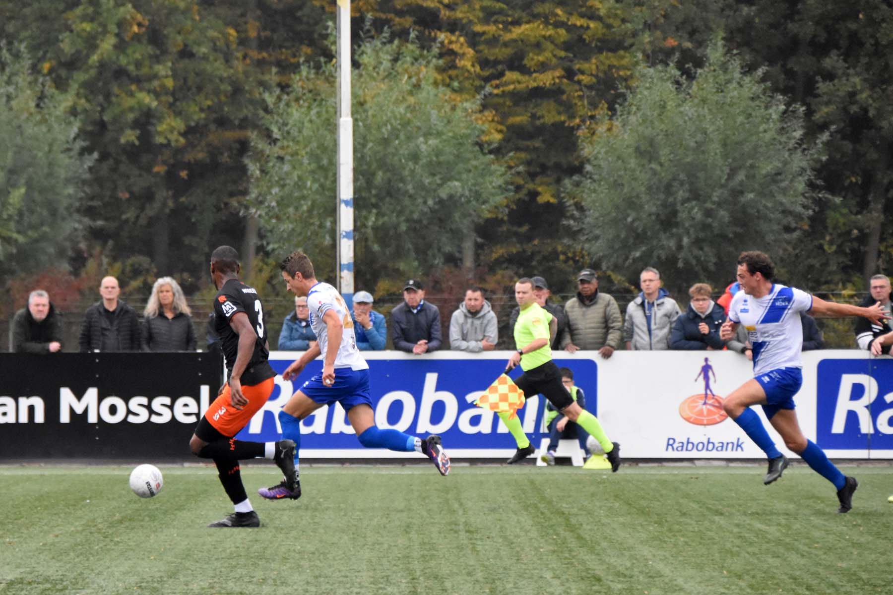 Sylvio Hage wordt vol geraakt, voordeel oordeelt de scheidsrechter. Sylvio Hage kan de bal nog net meegeven aan..