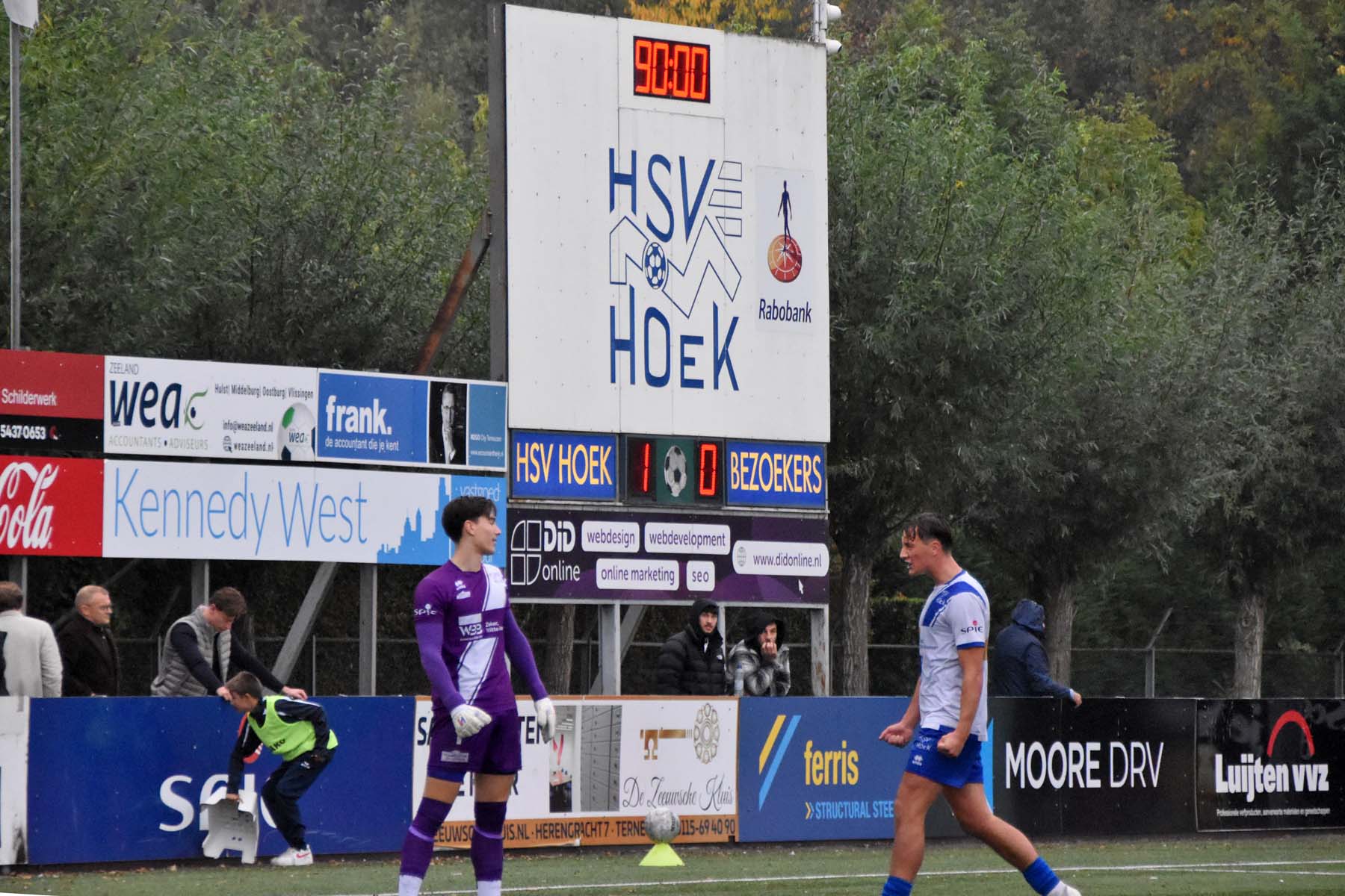 De vierde man gaf 4 minuten blessuretijd aan. Kan HSV Hoek de overwinning over de streep trekken? Trainer De Nooijer zet er voor de laatste paar minuten nog een verdediger bij. Steve Schalkwijk verlaat het veld zijn vervanger Jevairo Pengel.