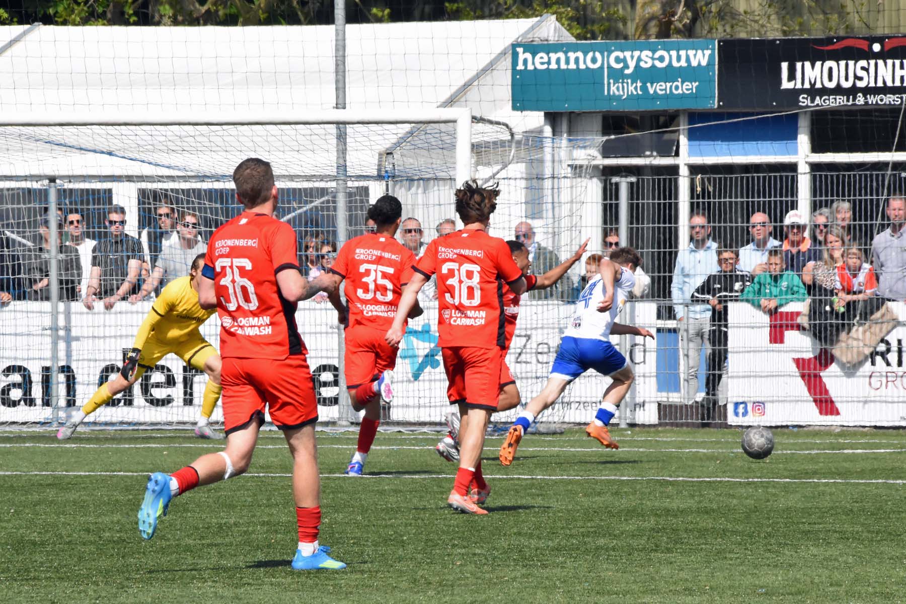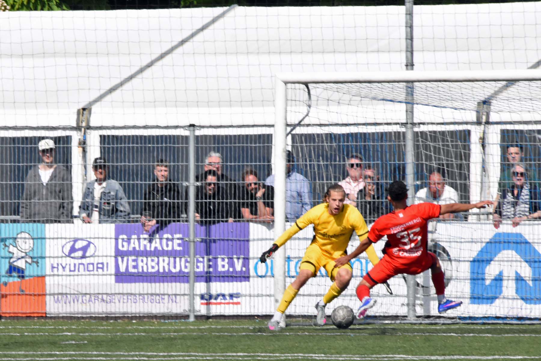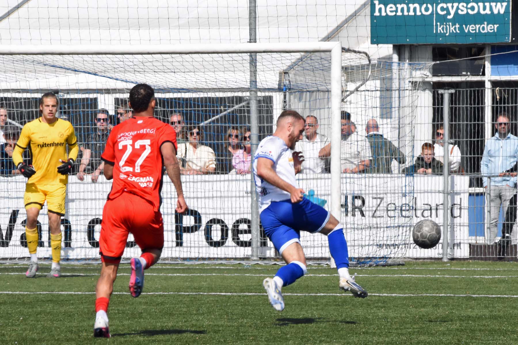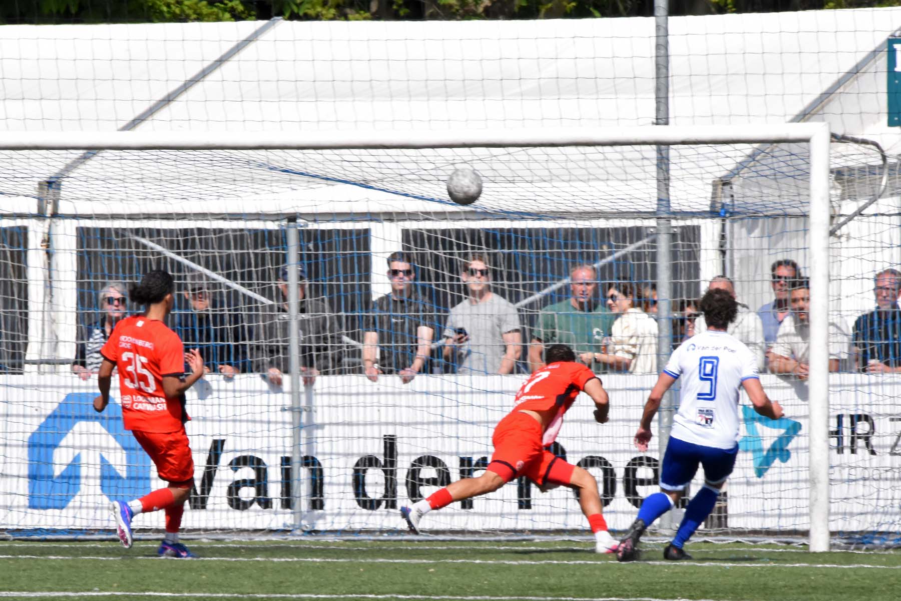 veel supporters van HSV Hoek vragen zich af "is die bal over de lijn?"