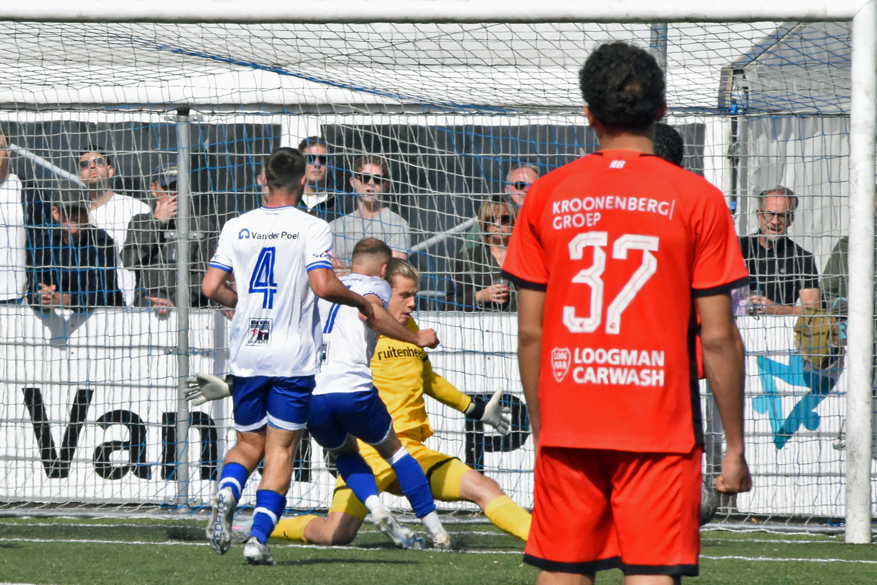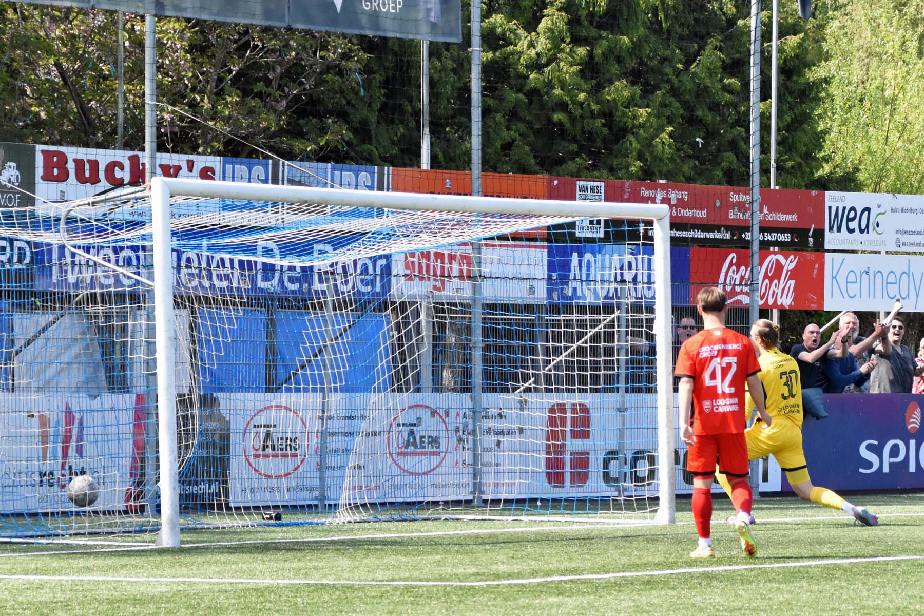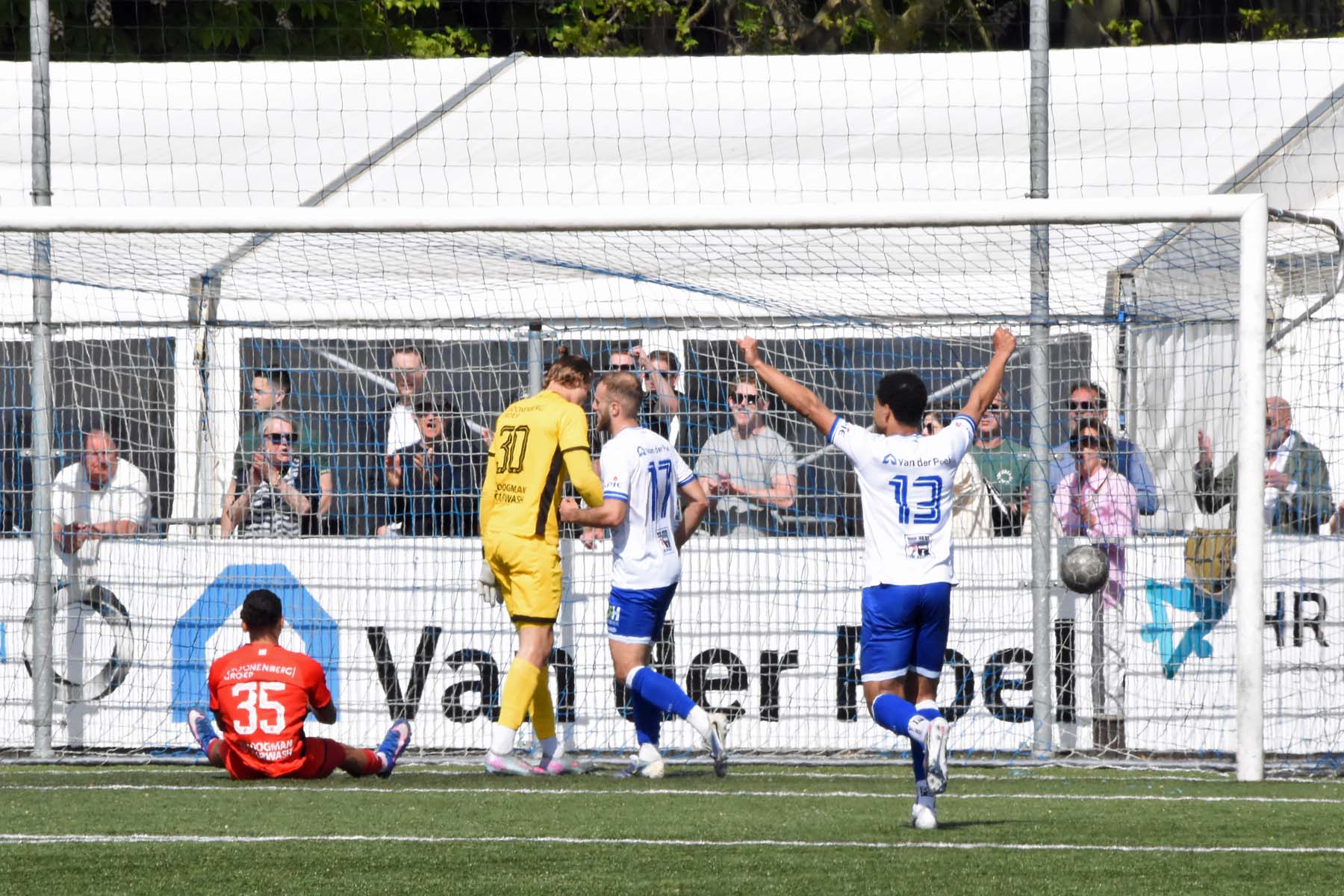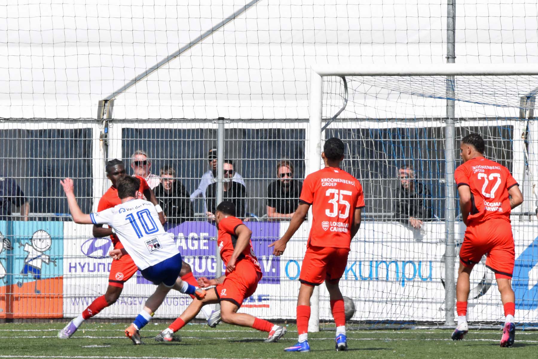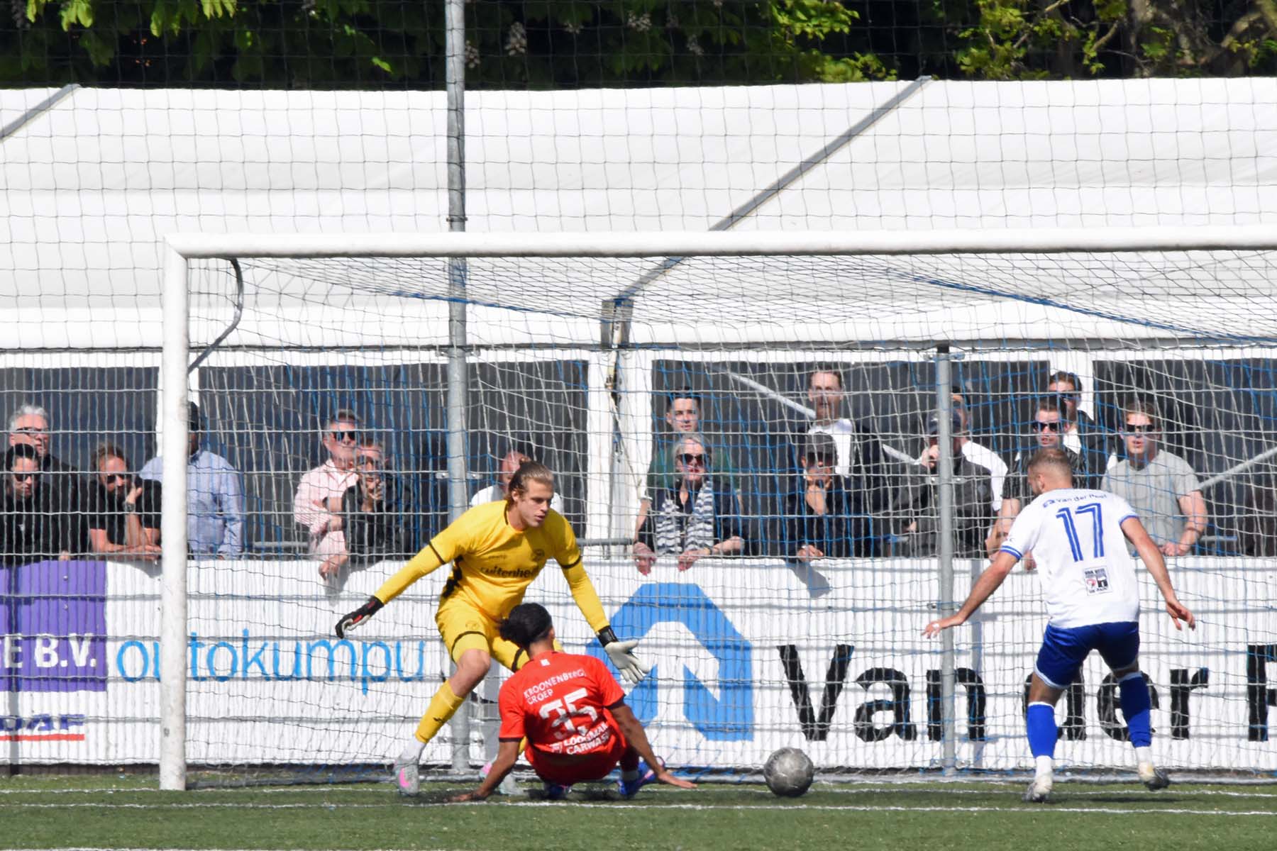 veel supporters van HSV Hoek vragen zich af "is die bal over de lijn?"