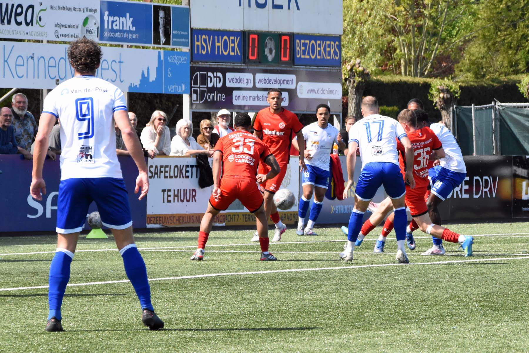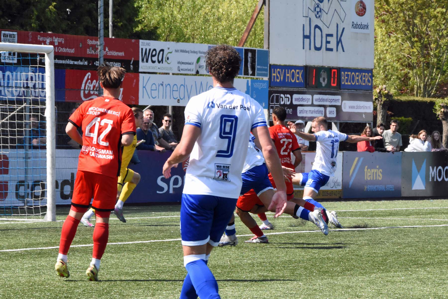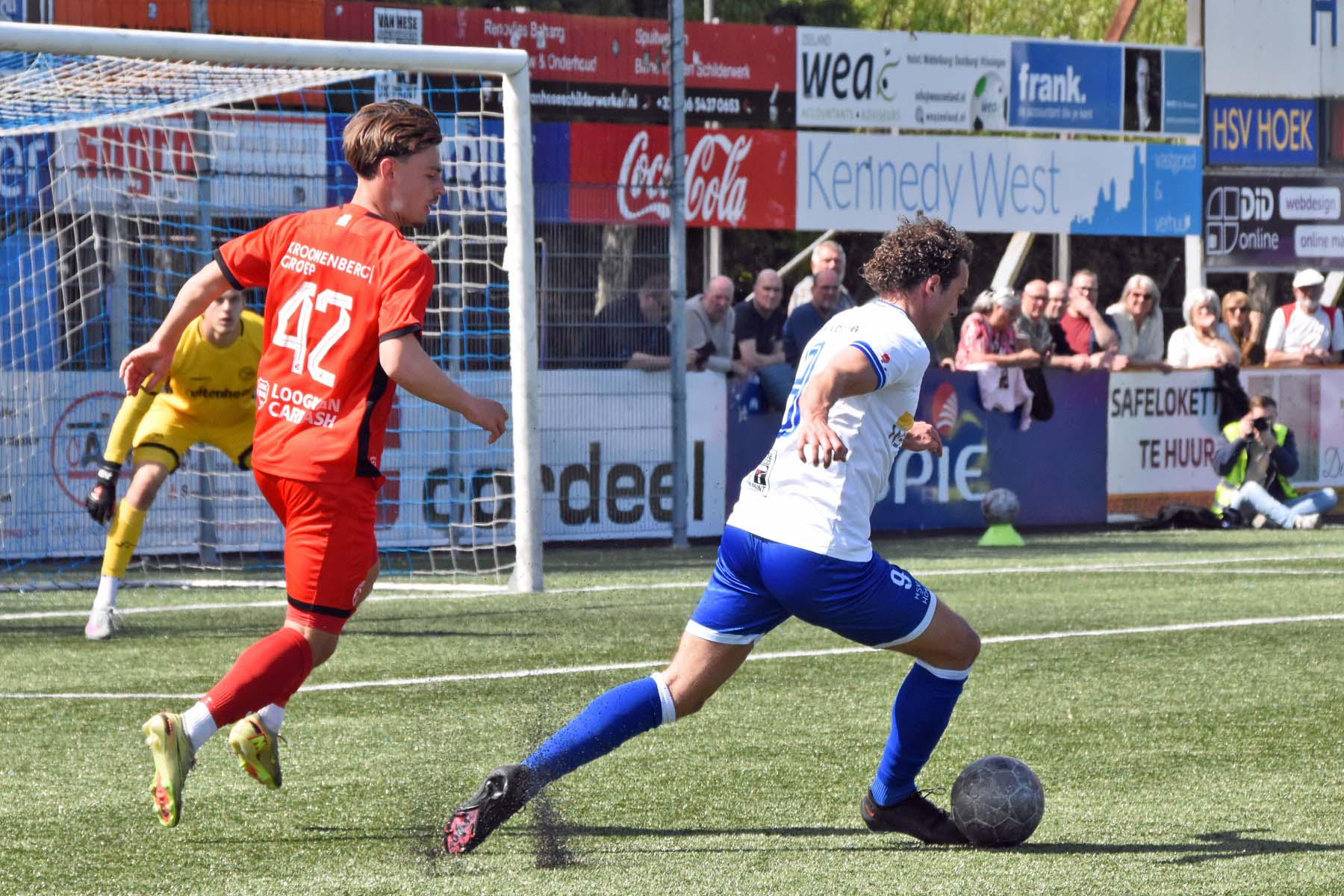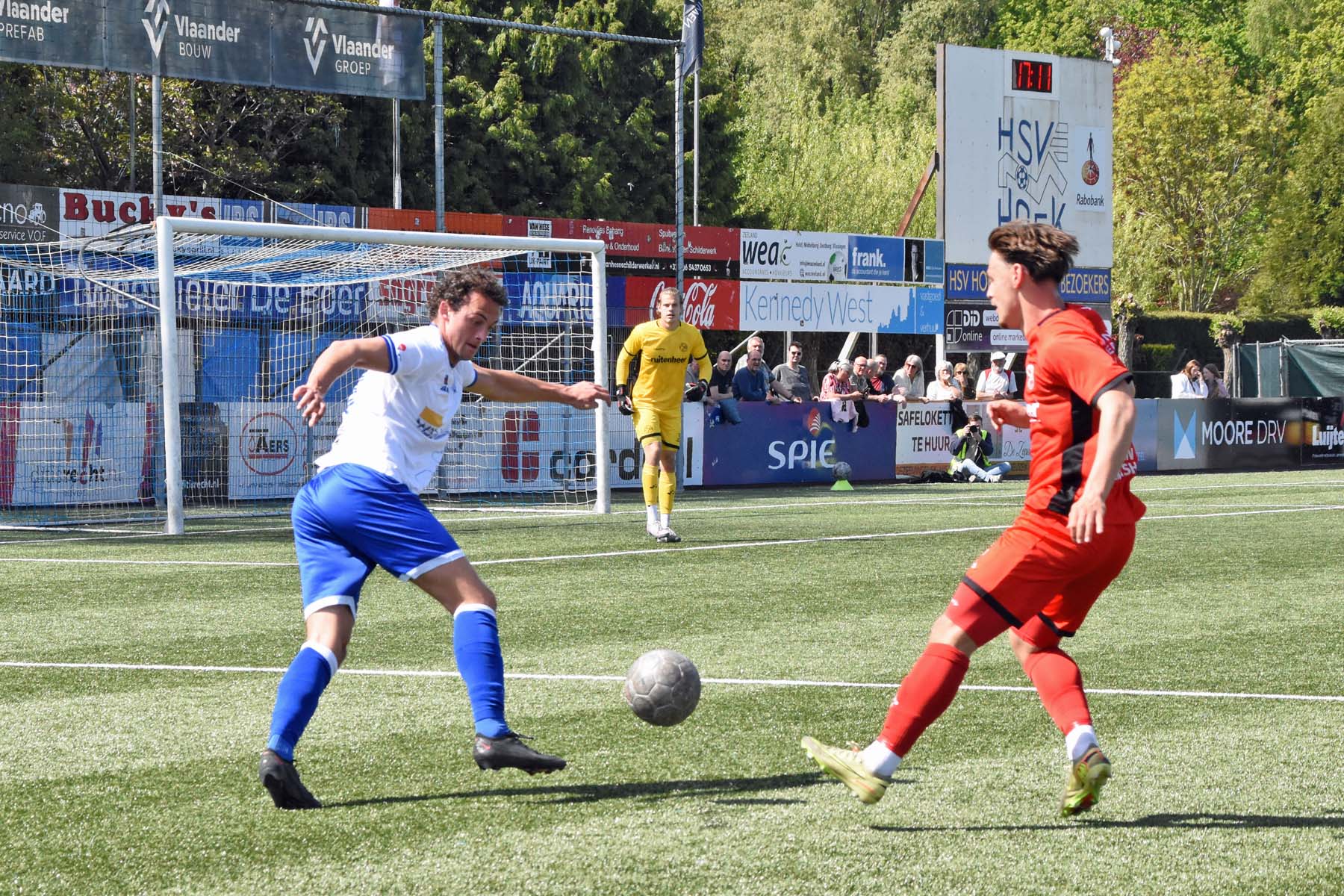 de bal breed te leggen, helaas achter spits Din Sula. De supporters van HSV Hoek vragen zich af "Waarom schoot hij niet zelf?"