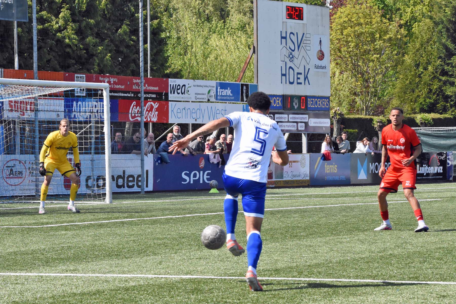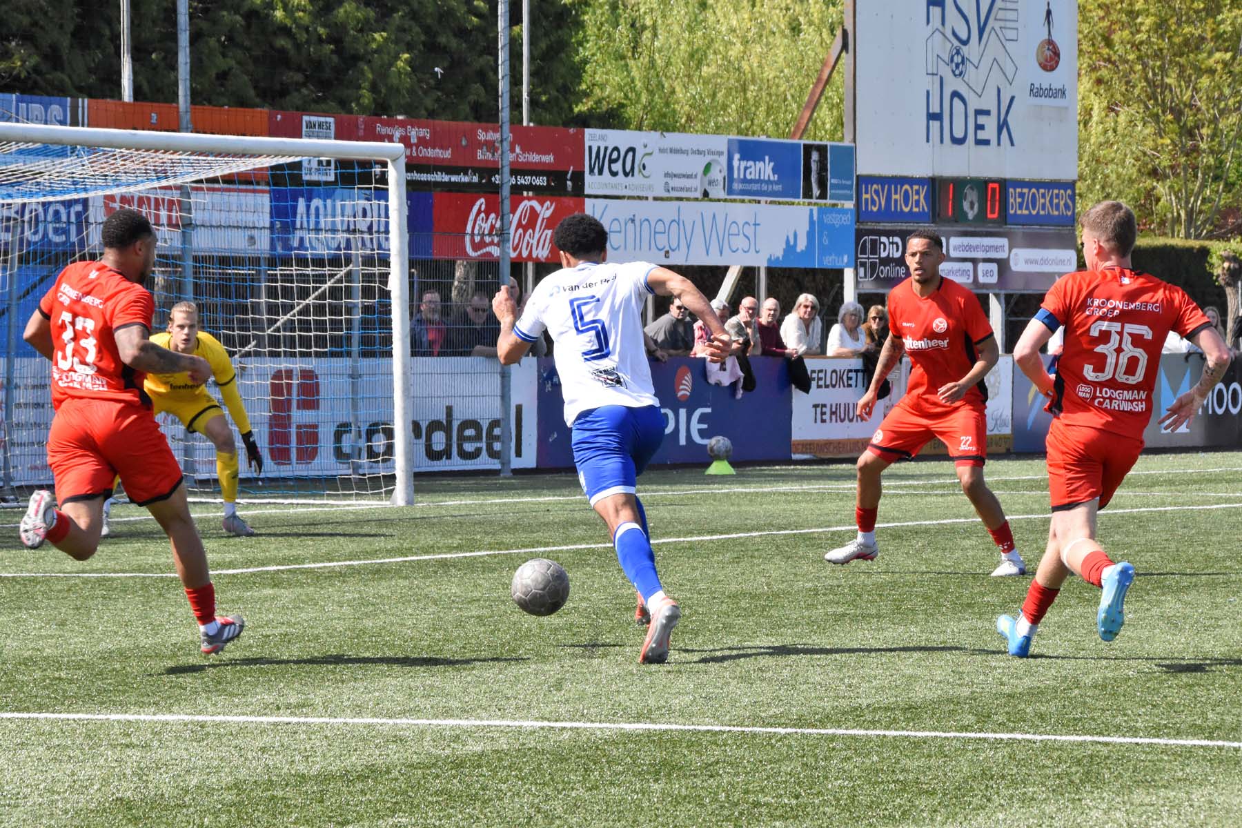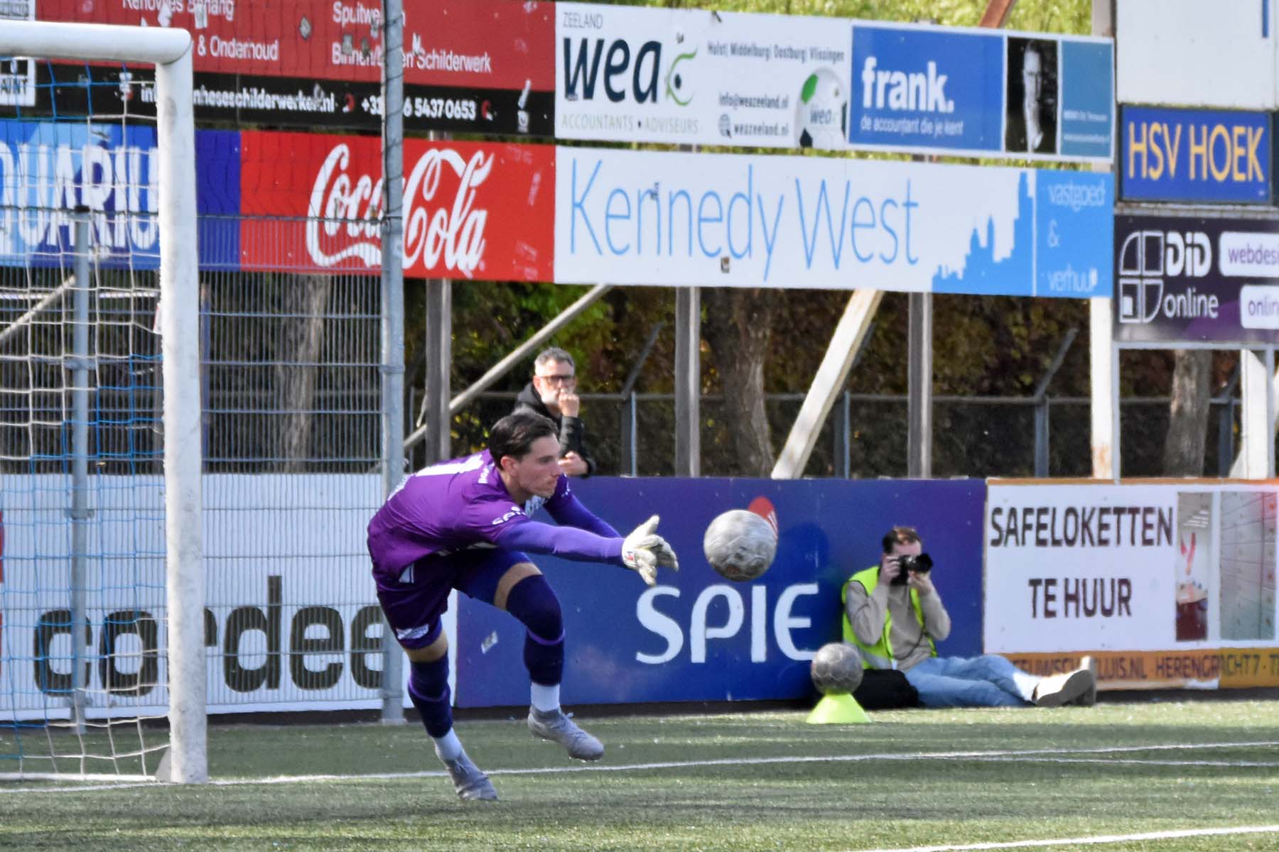de bal breed te leggen, helaas achter spits Din Sula. De supporters van HSV Hoek vragen zich af "Waarom schoot hij niet zelf?"