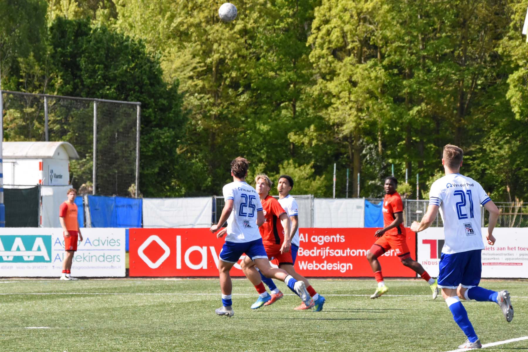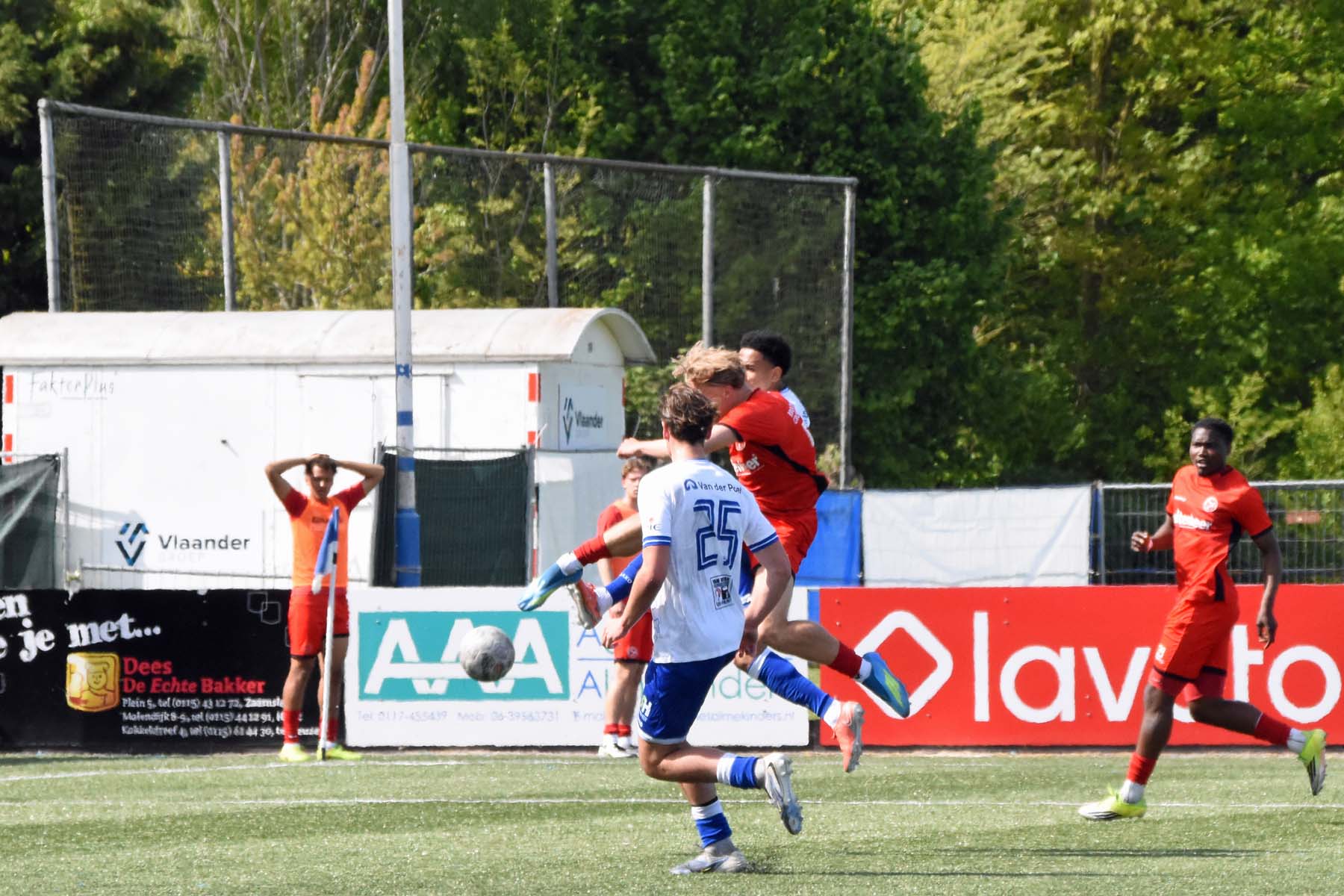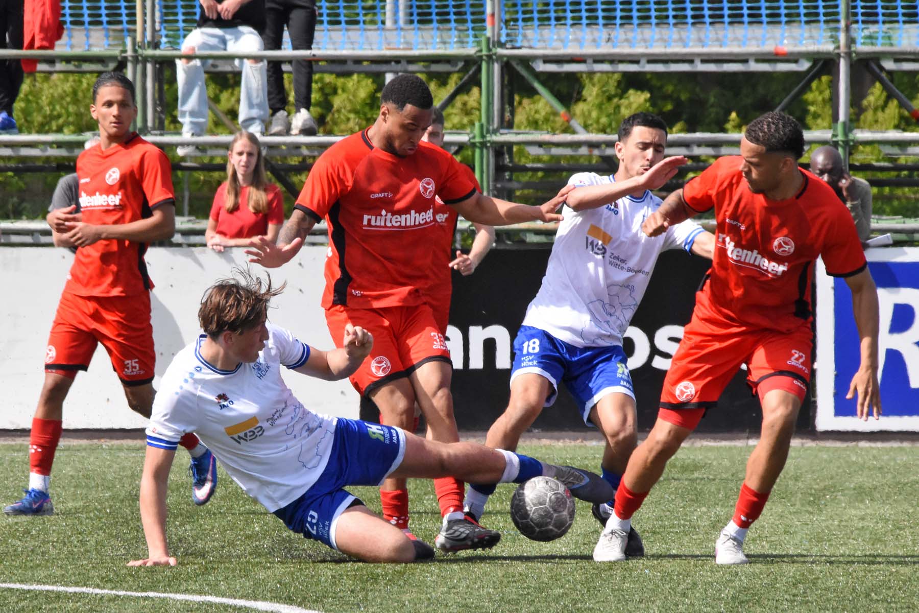 Jong Almere City probeert een keer gevaarlijk te worden. Bij HSV Hoek gooien zichzelf voor de bal.