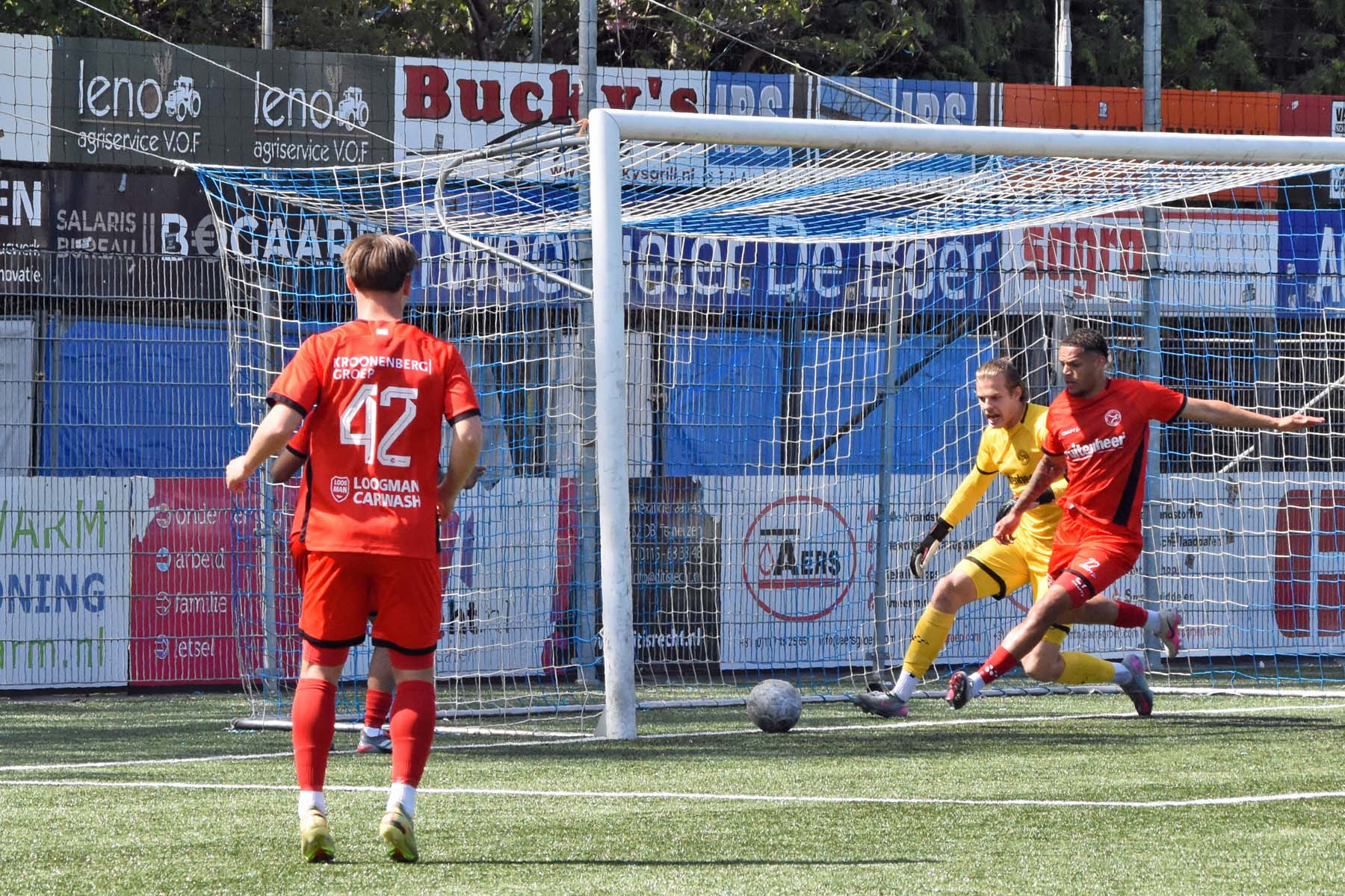 op het dak van het doel. Wat een kans.