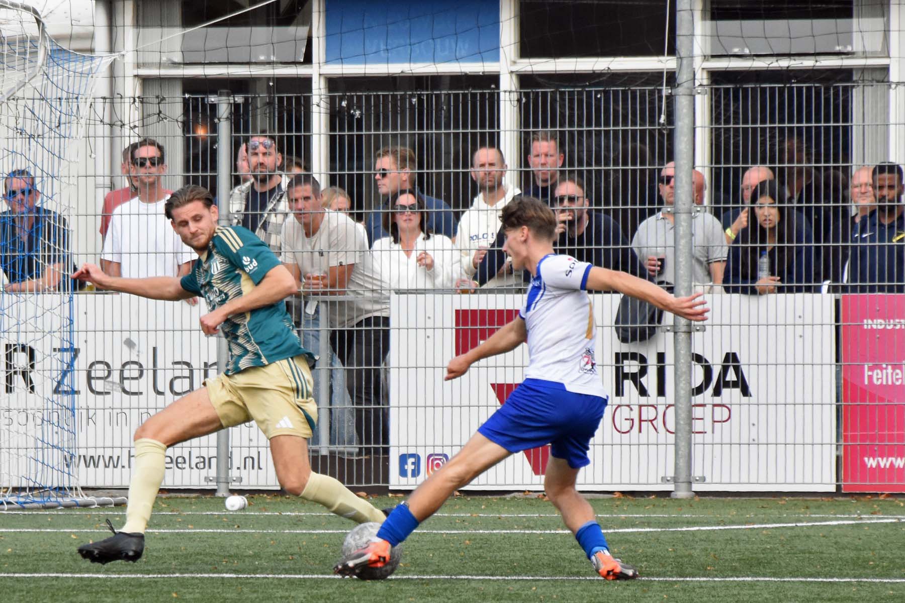 Sylvio Hage probeert het van een afstandje, de bal wordt nog aangeraakt..