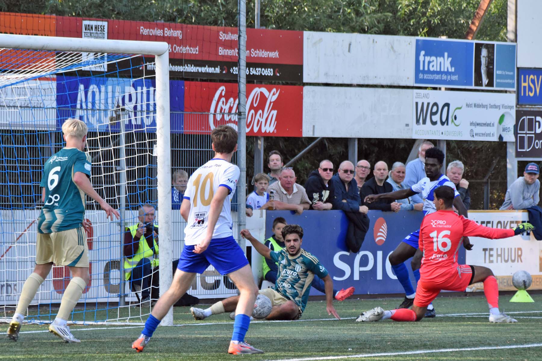 de verdediger van Excelsior Maassluis schiet de bal in eigen doel, corner rest voor HSV Hoek...