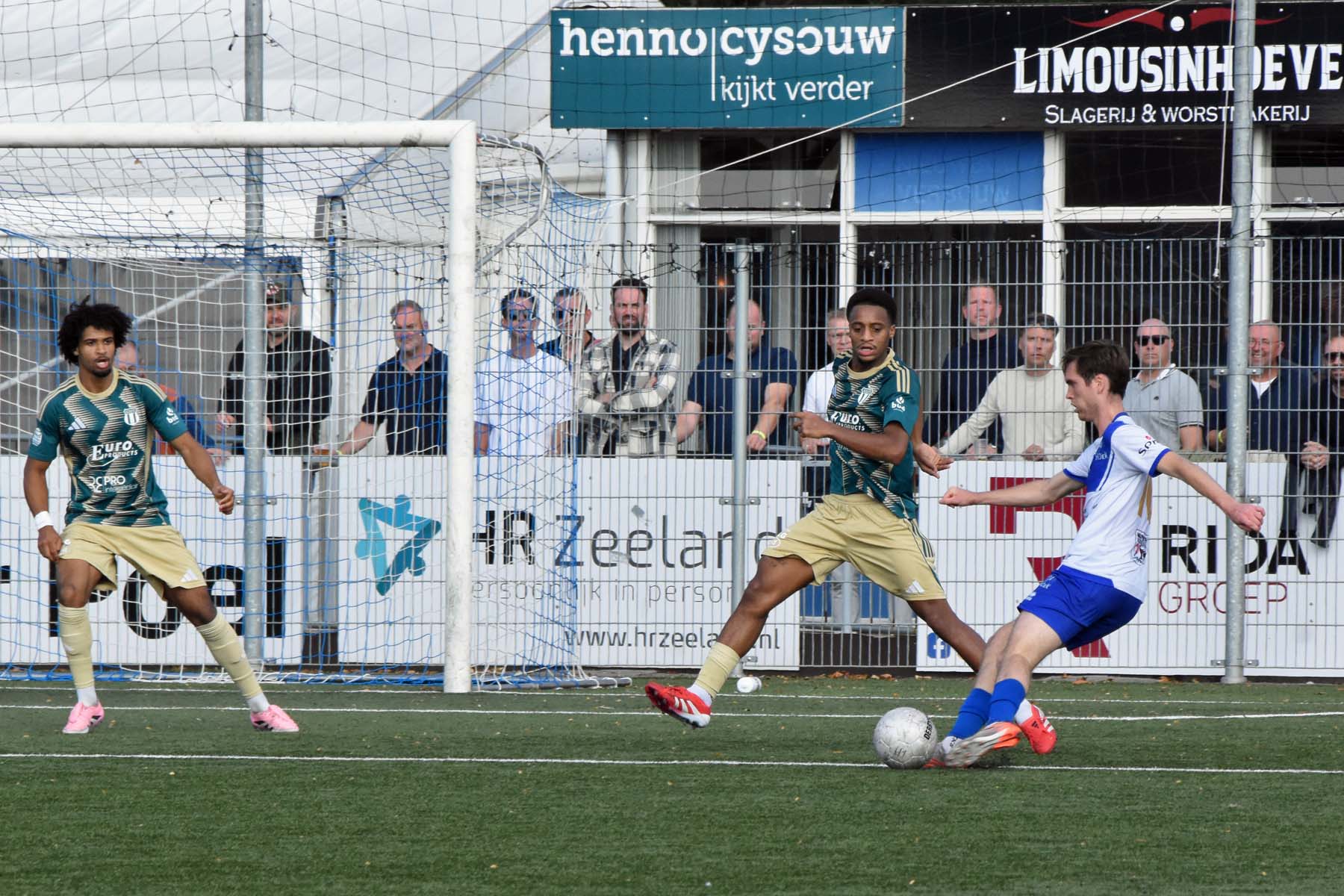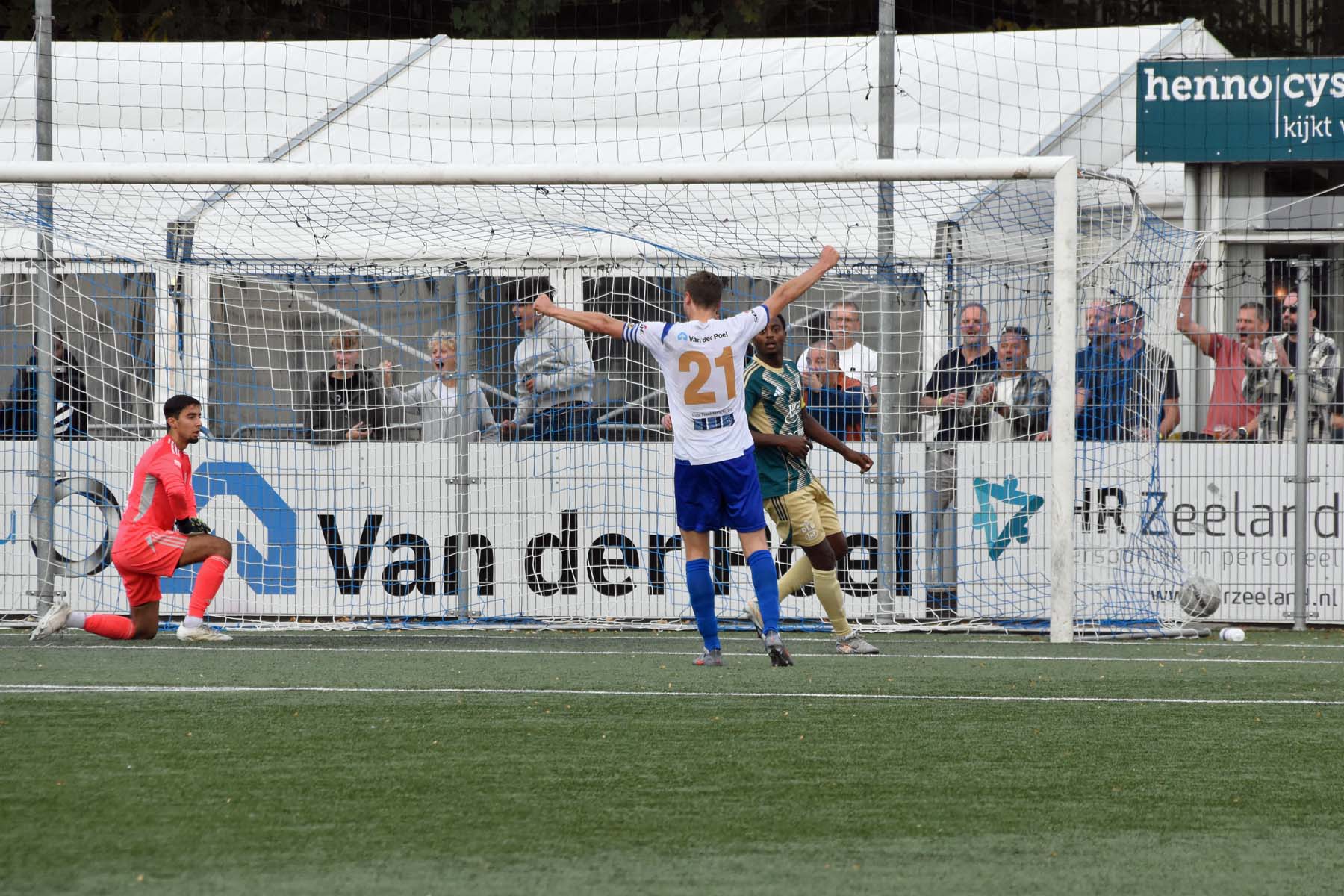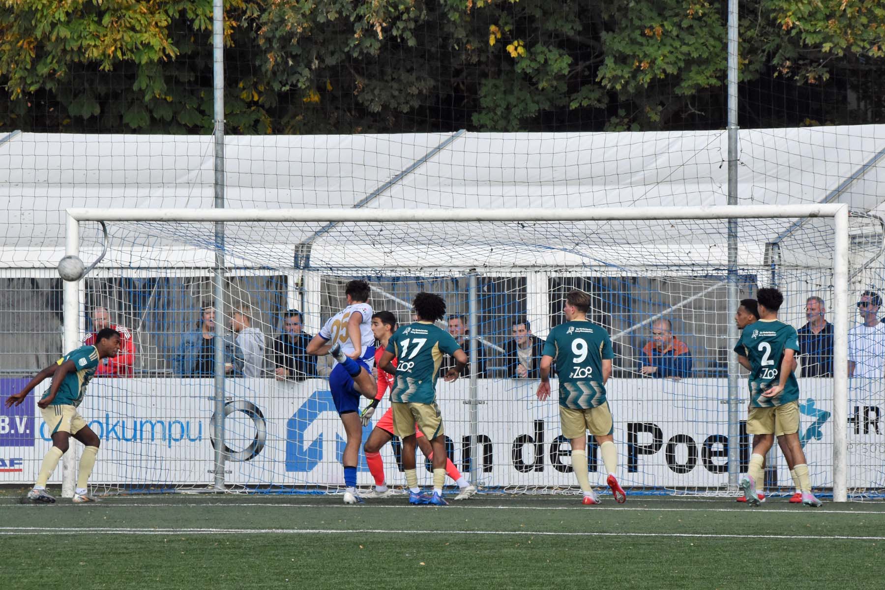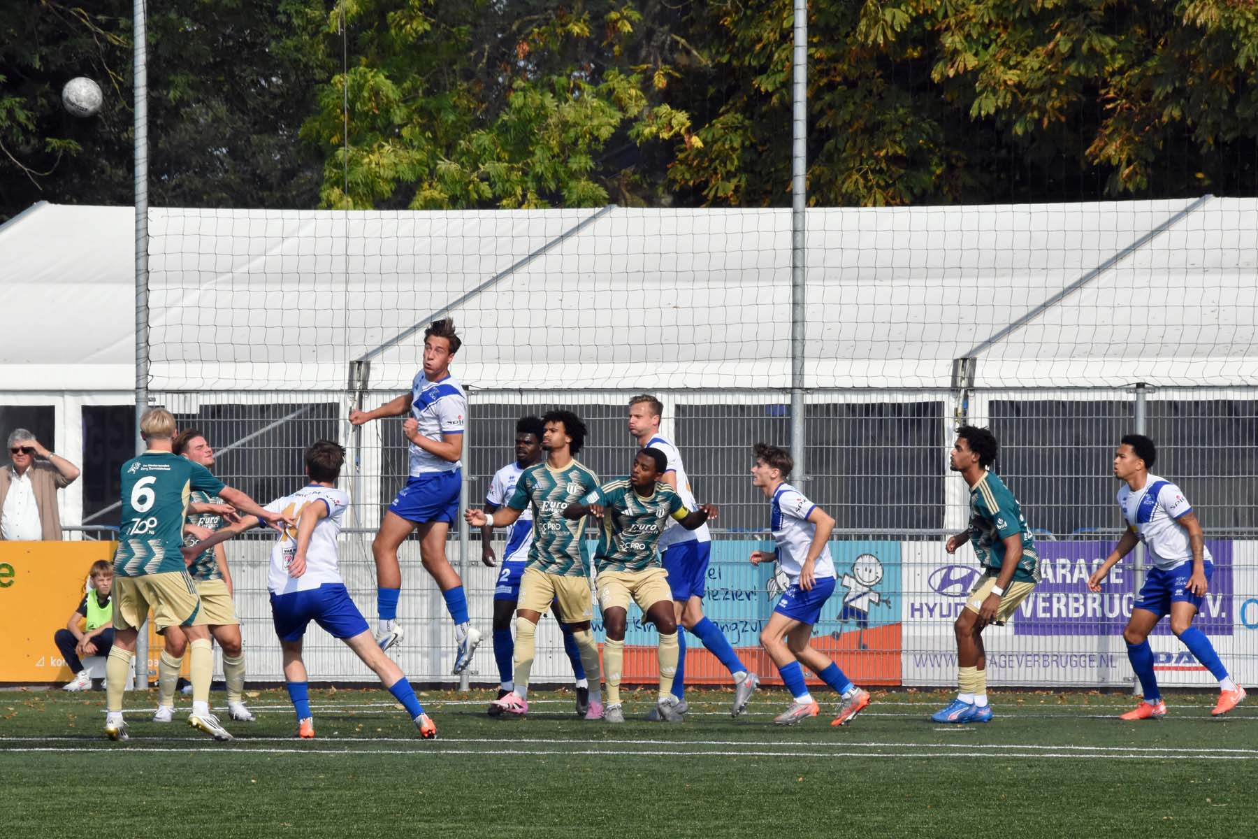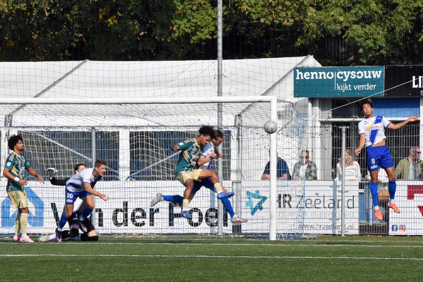 Corner voor Excelsior Maassluis. Wout den Engelsman gooit zich voor zijn directe tegenstander en kopt de bal weg.