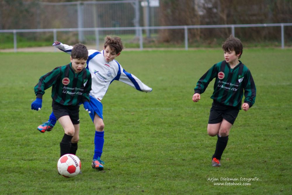 Het beste is overigens maar dat we aan de eerste helft niet teveel woorden besteden, E2 moet duidelijk zijn ritme van voor de winterstop weer te pakken krijgen en waar we voor de winterstop steeds beter gingen spelen gaat het nu bijna helemaal niet. We worden aan veel kanten voorbij gelopen door de fanatiek startende Aardenburgers, met een stand van 4-0 achter gaan we dan ook enigszins teleurgesteld de kleedkamer in. Tijd voor een motivatiespeech van de instant-coach een een dosis suiker in de vorm van sinas. De neuzen staan weer de goede kant op en ruim op tijd staan we weer klaar op het veld. Nadat de scheidsrechter fluit voor het begin van de 2e helft is het duidelijk dat de rollen nu omgedraaid zijn!! E2 is als herboren uit de kleedkamer gekomen en nu duidelijk de betere partij!! We passen weer naar elkaar, lopen weer goed vrij en op onze positie, Michiel kan vanaf het middenveld weer mooie passes versturen. Binnen korte tijd staat het door 3 goals van Michiel dan ook al 3-4, vol goede moed gaan we vooral op de aanval en wordt spits Imme weer terug in het veld gebracht. Het eerste doelpunt valt echter aan de verkeerde kant maar niet lang daarna weet Imme met een mooi geplaatst schot de 4-5 te scoren. Maar helaas helaas, na het met krachten smijten in de 2e helft moet E2 een beetje gas terugnemen waarna Aardenburg weer het initiatief heeft. En er dan ook vrij snel 2 goals weet in te prikken, 4-7 is niet de stand waar we met eindigen, ook Michel start de competitie goed met zijn eerste goal. Waardoor we de tweede helft met 5-3 winst afsluiten, jammer dat de 1e helft niet zo lekker ging maar een groot compliment voor de 2e helft was na afloop wel op zijn plaats!! Op naar de volgende wedstrijd mannen, thuis tegen Sluis.