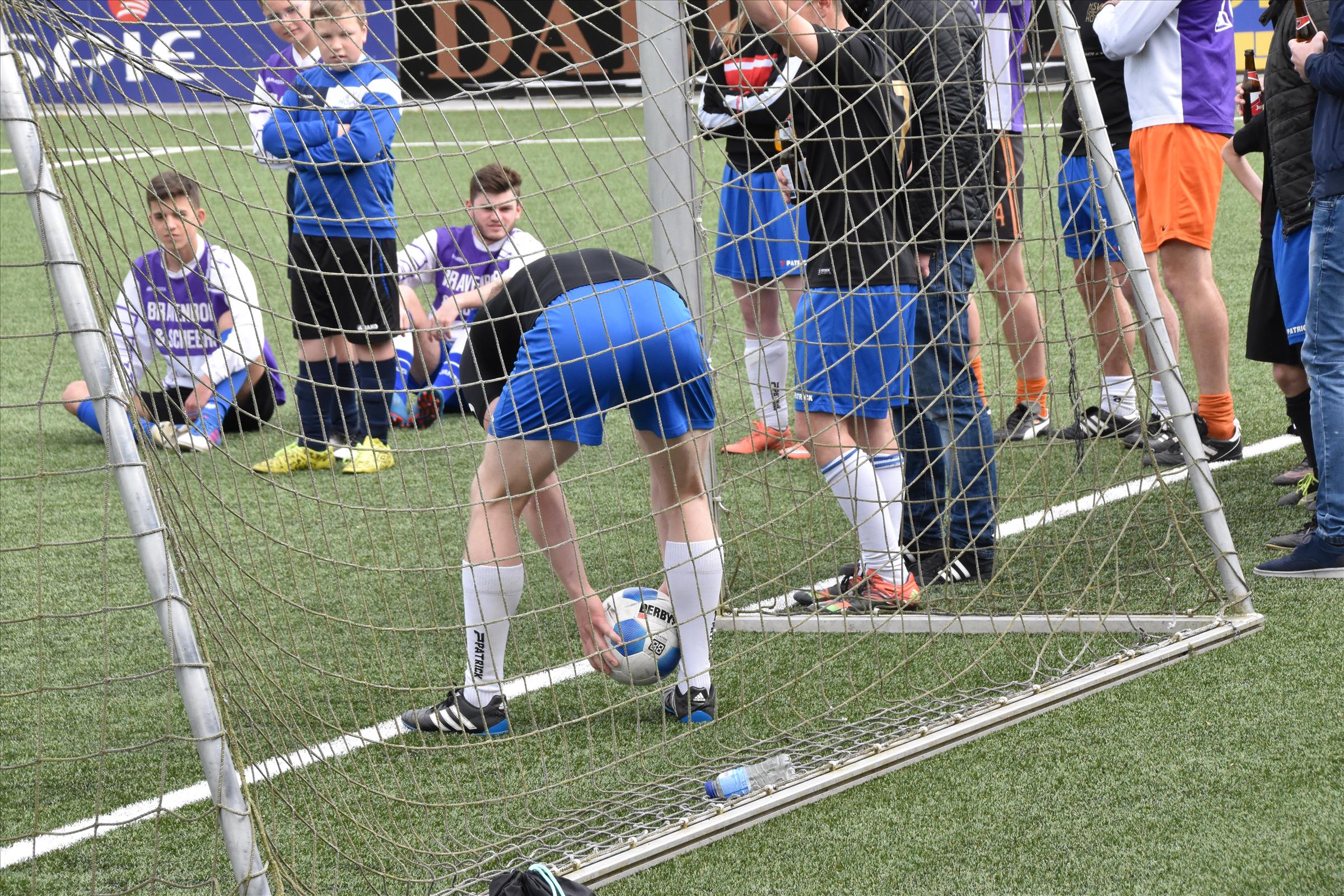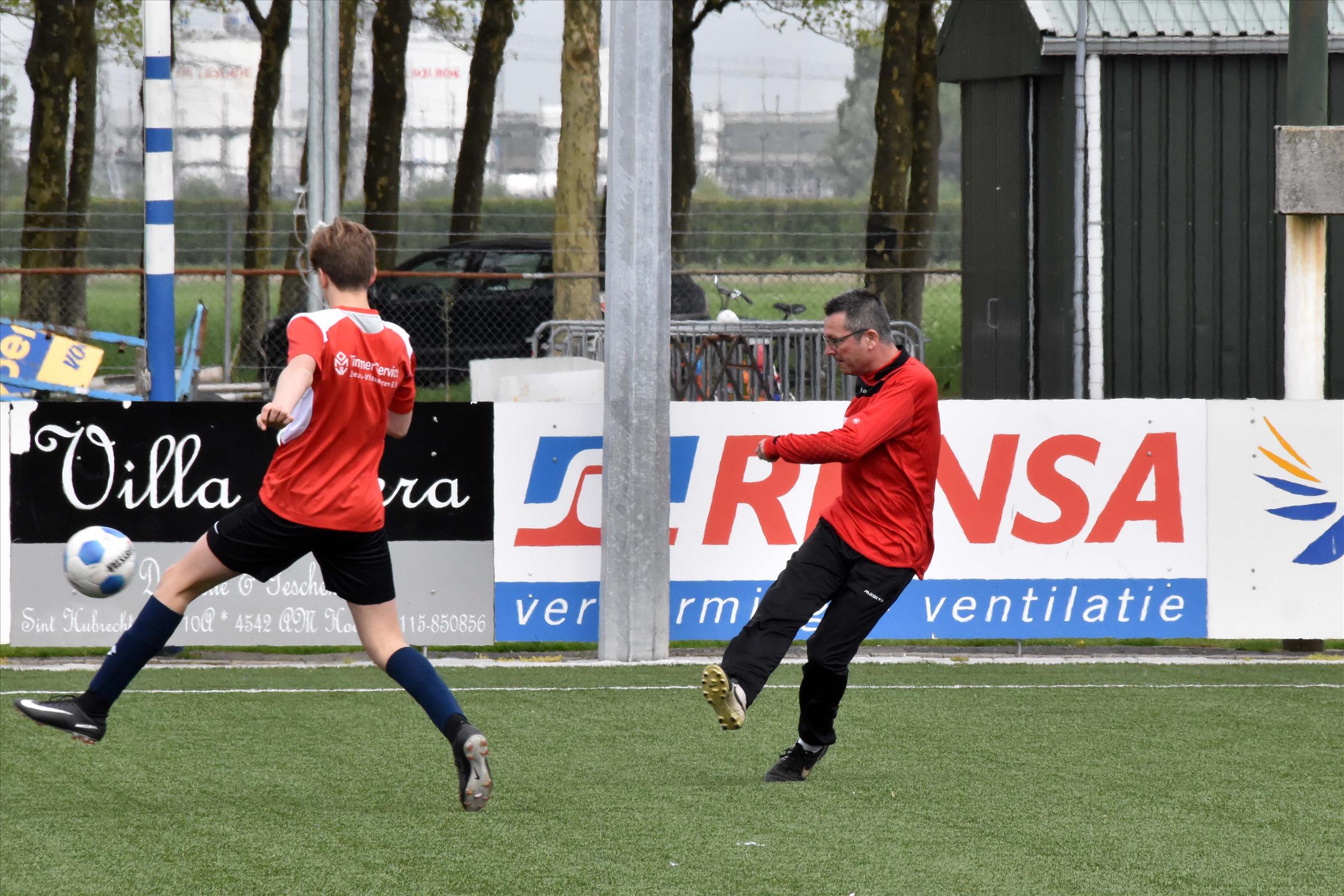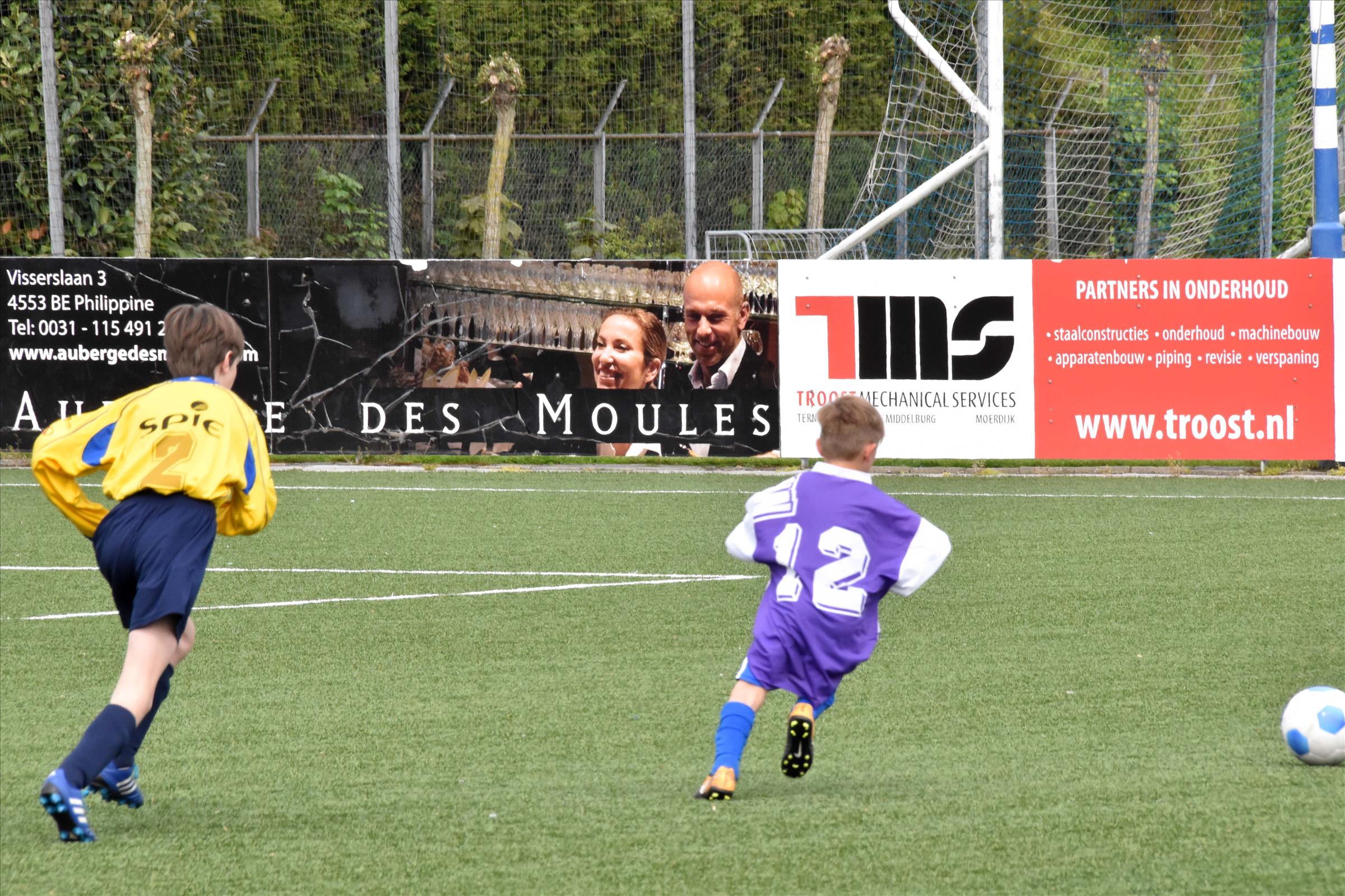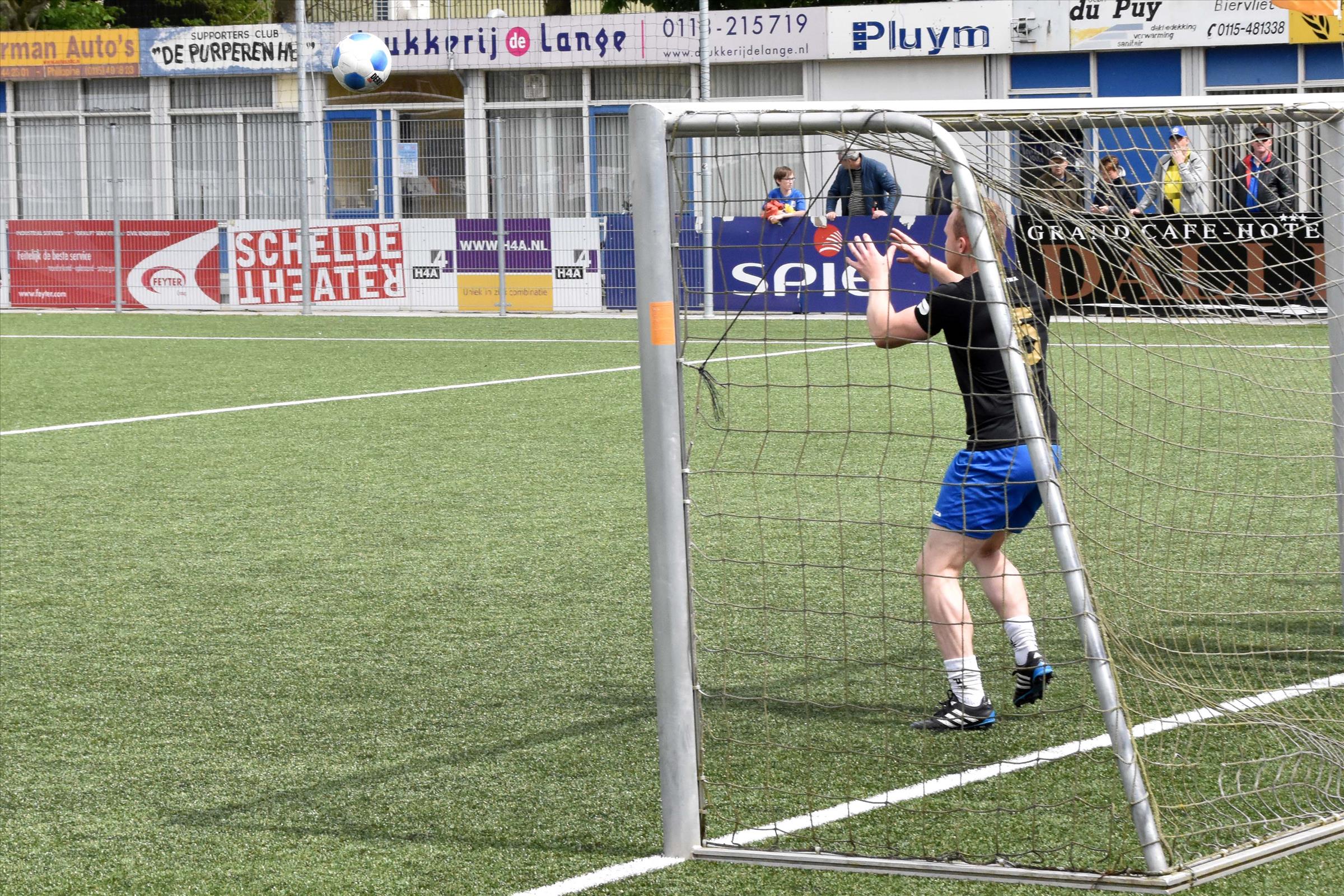 De finale gaat tussen Bloemenbuurt 1 en Moraleniehof 2. Mieras schiet van een afstandje...