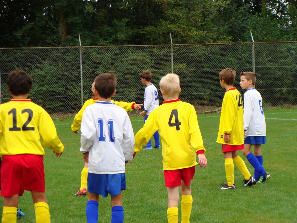De gehele selectie, behalve Thimo, was aanwezig. Thimo was mee met E2. De basis opstelling bestond uit; Samir in de goal, Floris Jan laatste man, Karim en Déjan links & rechts achter, Jarno de controleur op het middenveld, Thomas & Stinus als linker en rechter aanvallende middenvelders en Stijn H als spits. Thymen & Daphne begonnen als reserve en hebben later Déjan & Karim afgelost. Thymen heeft in de 2e helft ook nog even op de plek van Stinus gespeeld. Na een minuut of 10 had Koewacht E1 er al een stuk of 7 in liggen, het was dweilen met de kraan open. Ergens niet eens zo verwonderlijk als je tegen een team moet spelen met alleen maar 2e jaars E-tjes die al 4 jaar bij elkaar lopen. Koewacht gaat net als ons in de 2e klas spelen en het krachtsverschil was wel even schrikken. Duidelijk werd wel dat het opzetten van de verdediging de prioriteit van de trainers is. Een aantal jongens liep op een plek die ze niet gewend waren, maar ondanks dit hebben ze het goed gedaan. Doelpunten maken is natuurlijk geweldig, maar verdedigen doe je ook met z’n allen en daar ligt een mooie uitdaging. Positief was ook dat ondanks de afstraffing er geen verwijten aan elkaar gemaakt werden. Bovendien werden er een aantal mooie aanvallen op de mat gelegd, die helaas maar met 1 ere treffer werd beloond en onze keeper heeft ons voor een nog grotere afstraffing behoed.