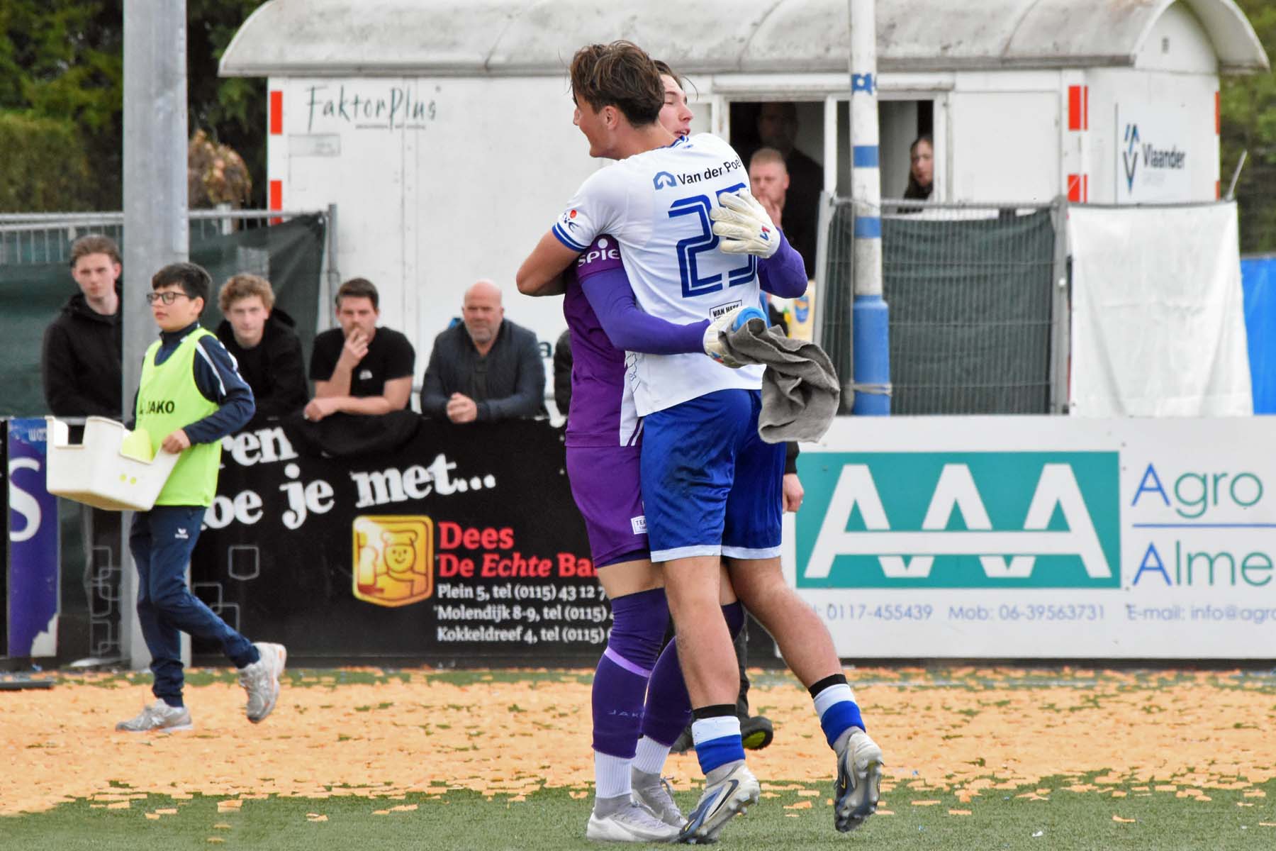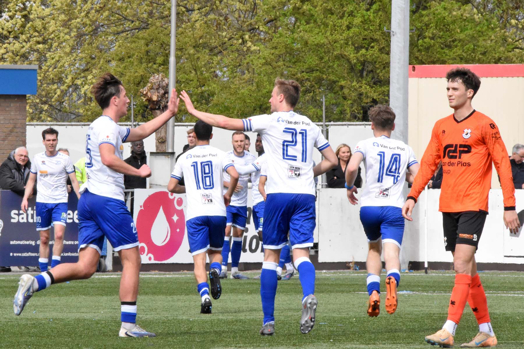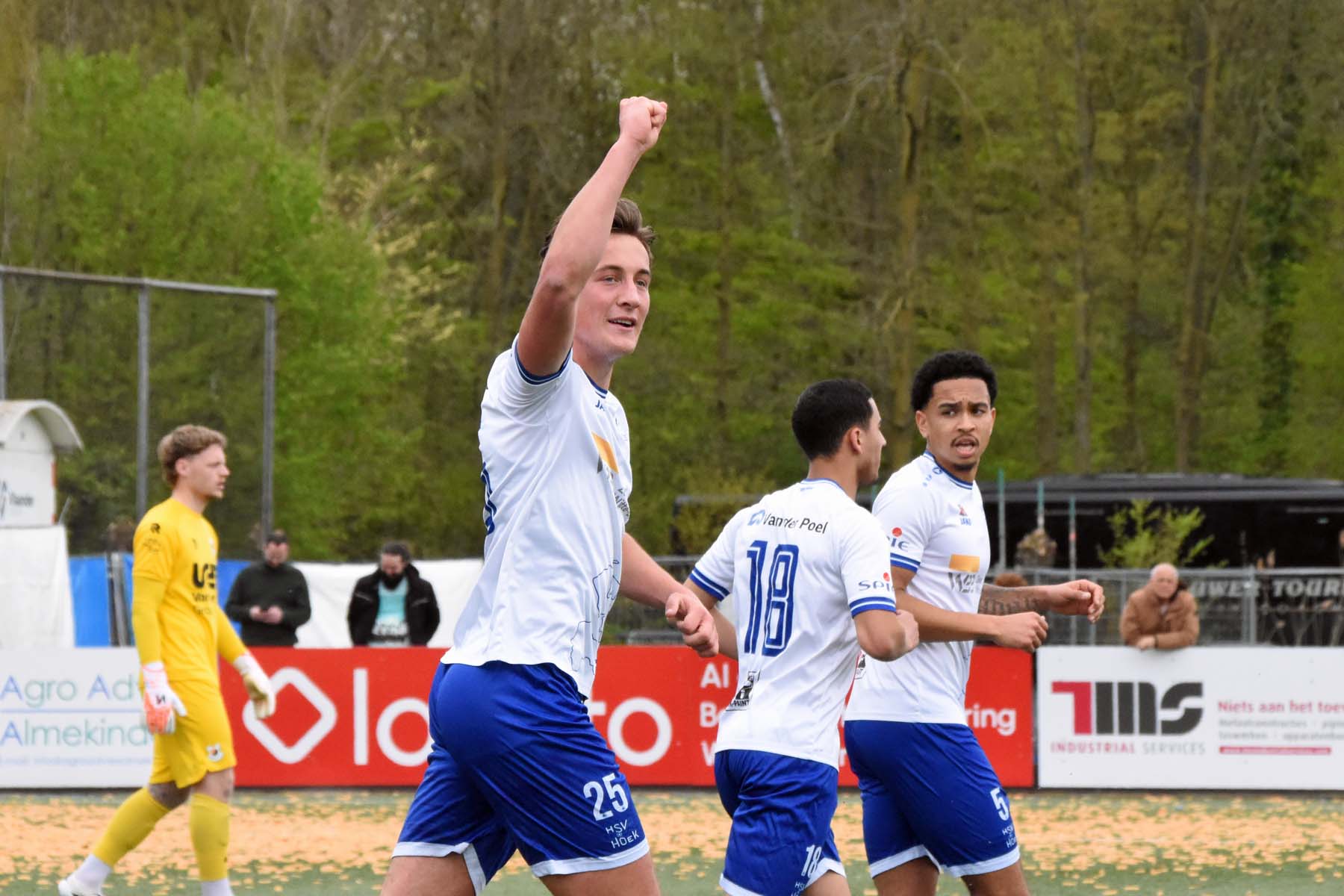 De gewisselde Sylvio Hage deelt mee in de vreugde. 2-0 Din Sula.