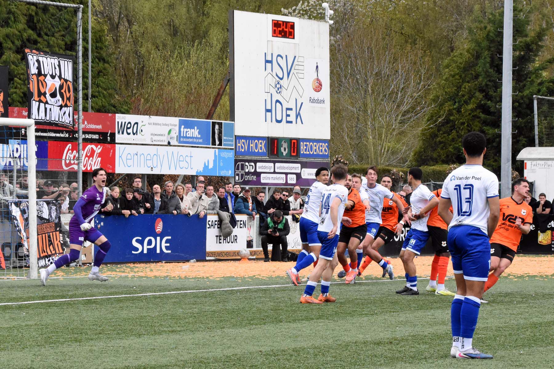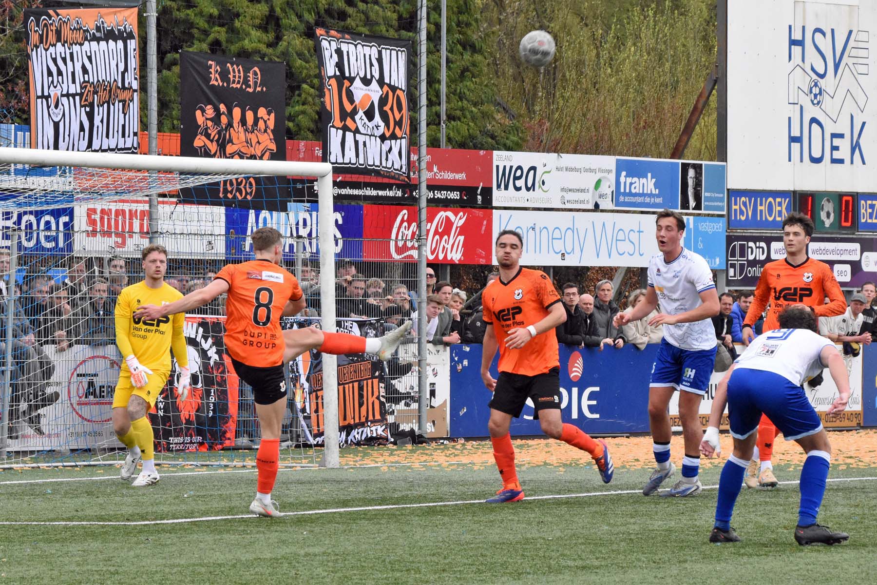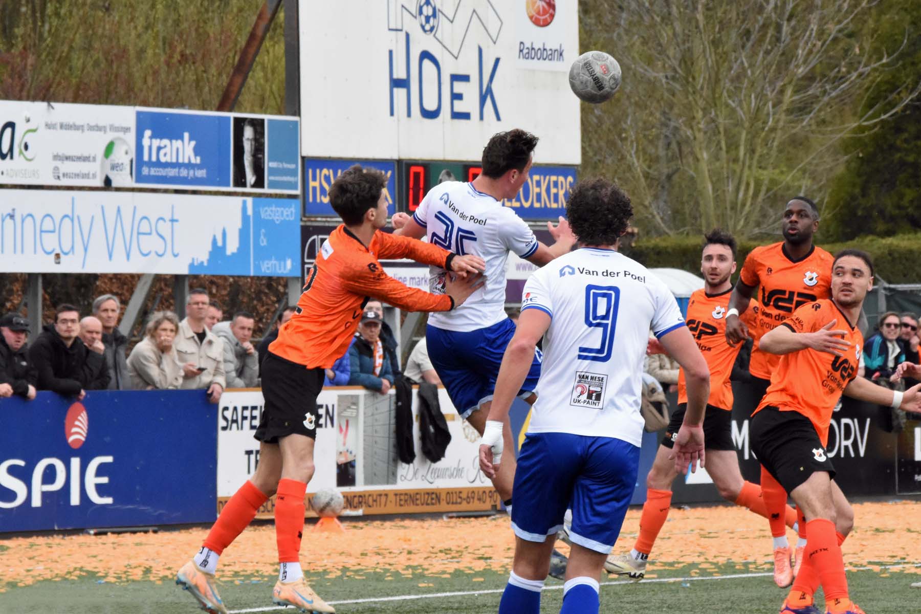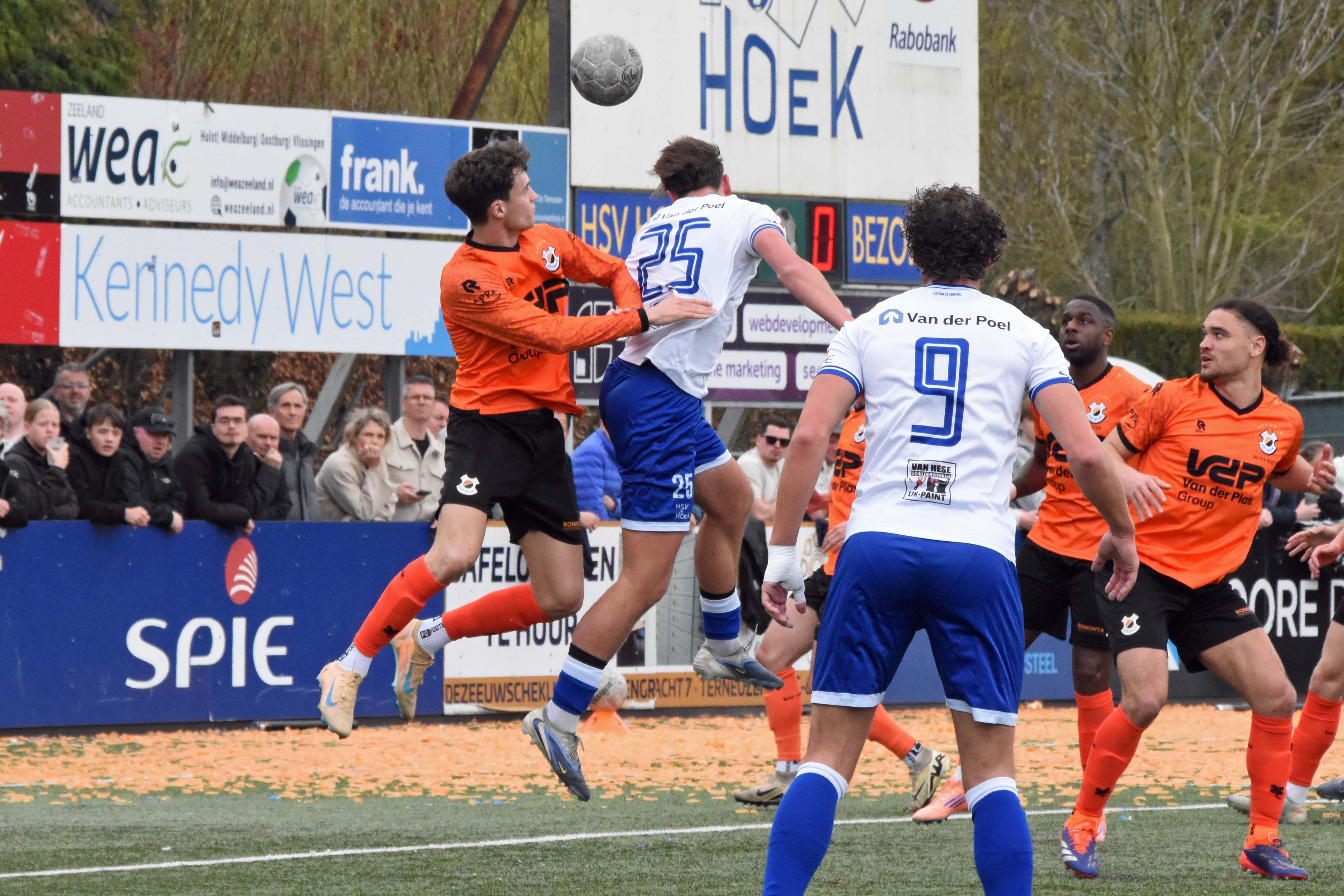 Vrije trap voor HSV Hoek. Wout den Engelsman mee naar voren, de lange verdediger toornt boven iedereen uit..