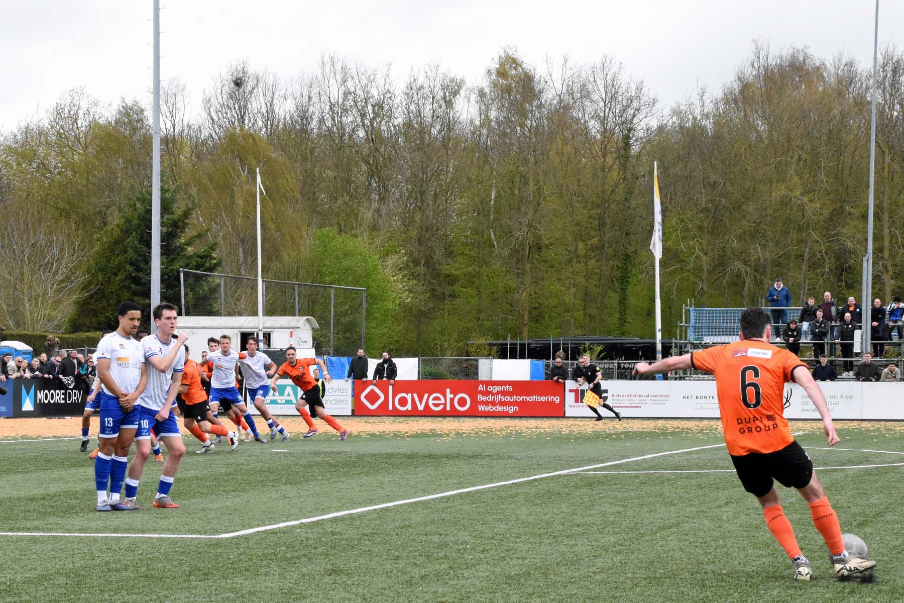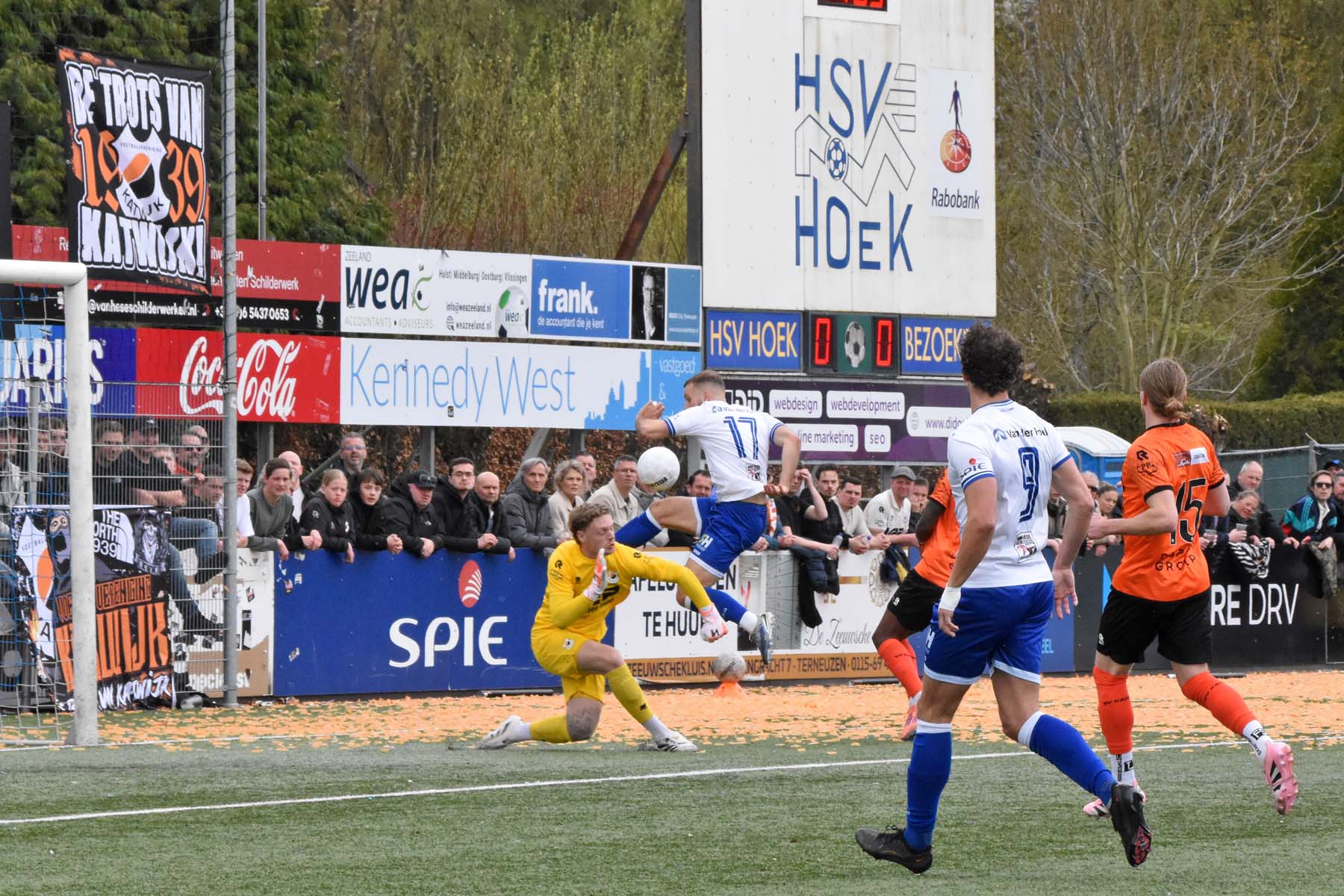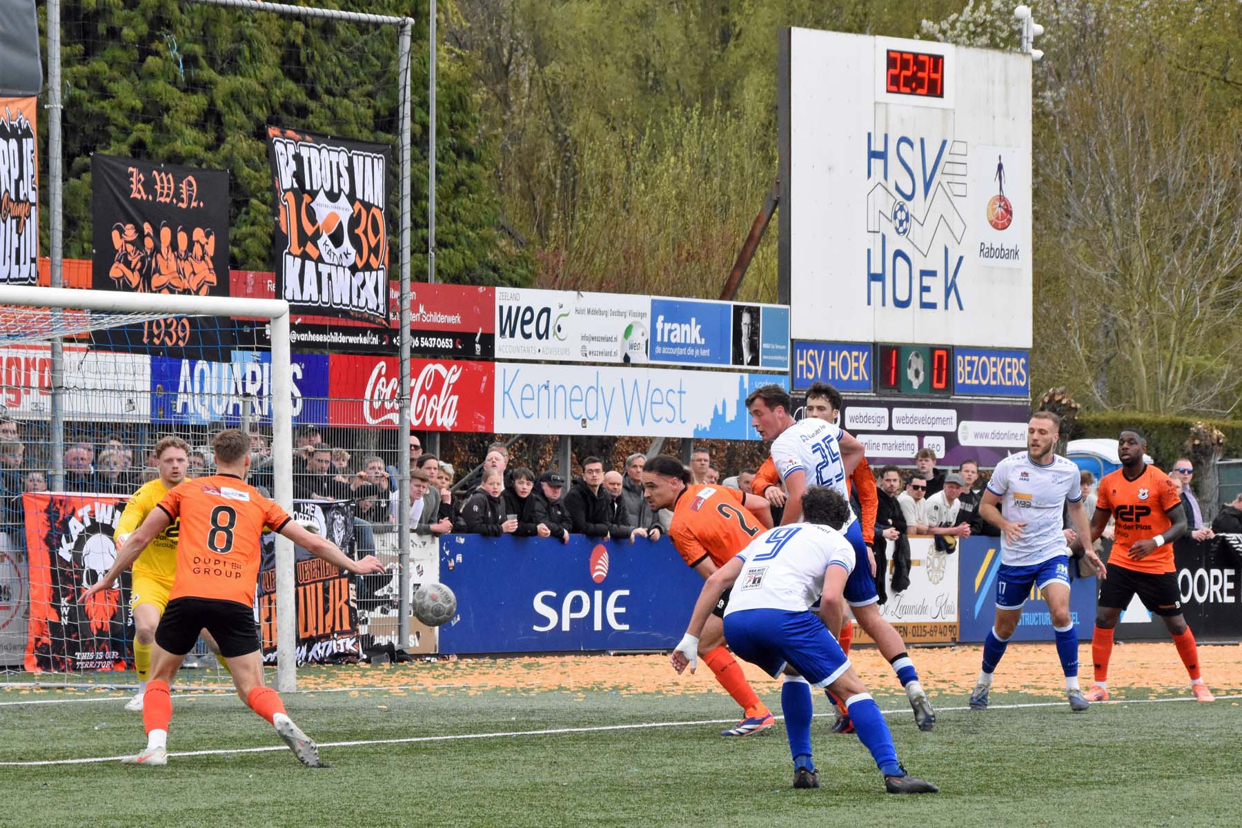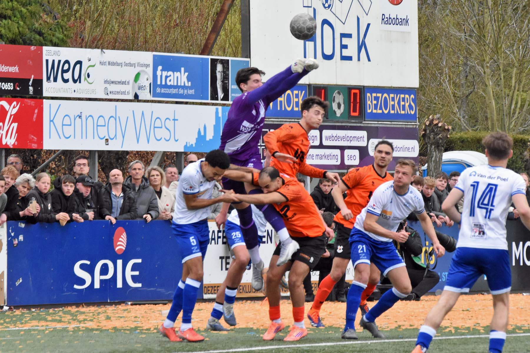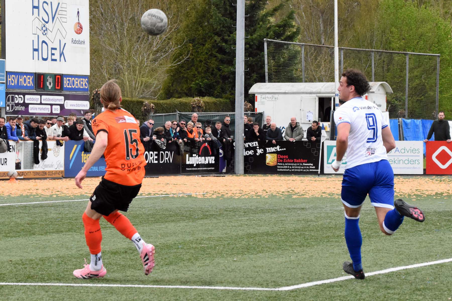 Vrije trap voor HSV Hoek. Wout den Engelsman mee naar voren, de lange verdediger toornt boven iedereen uit..