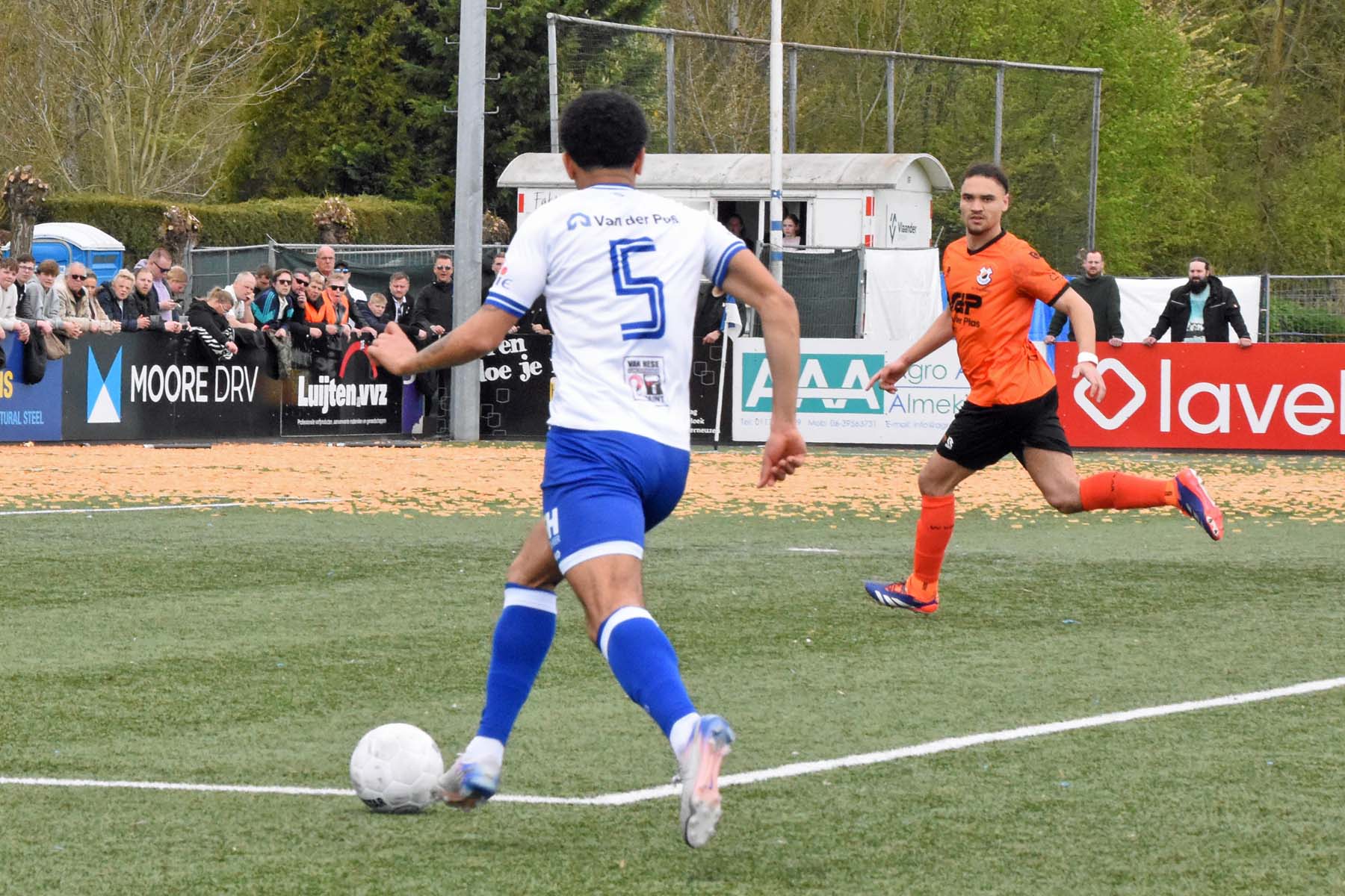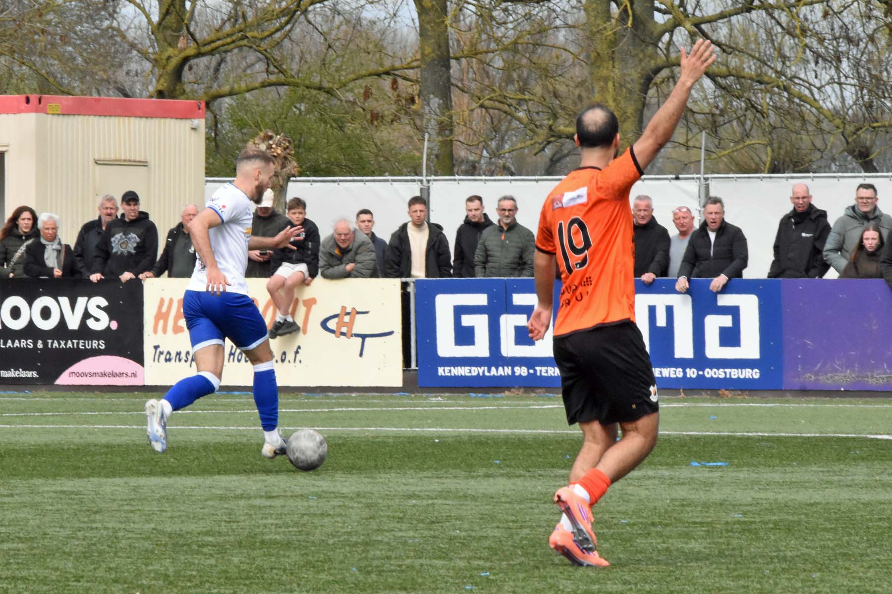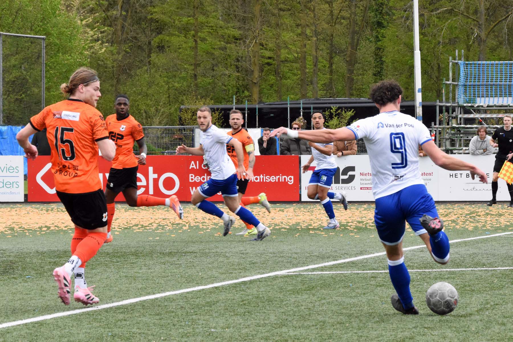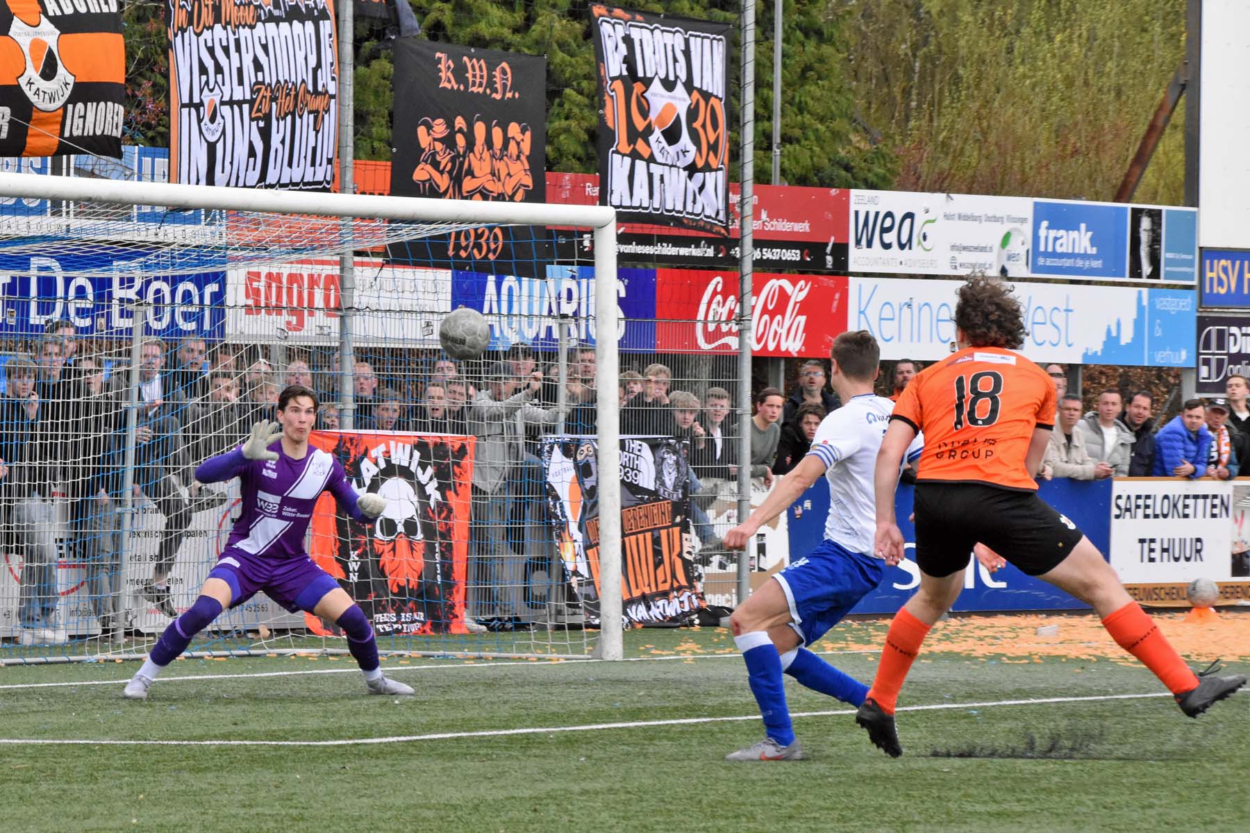 VV Katwijk blijft maar de aanval zoeken. Rousseau De Poorter stapt goed uit, geeft de bal een lel naar voren...