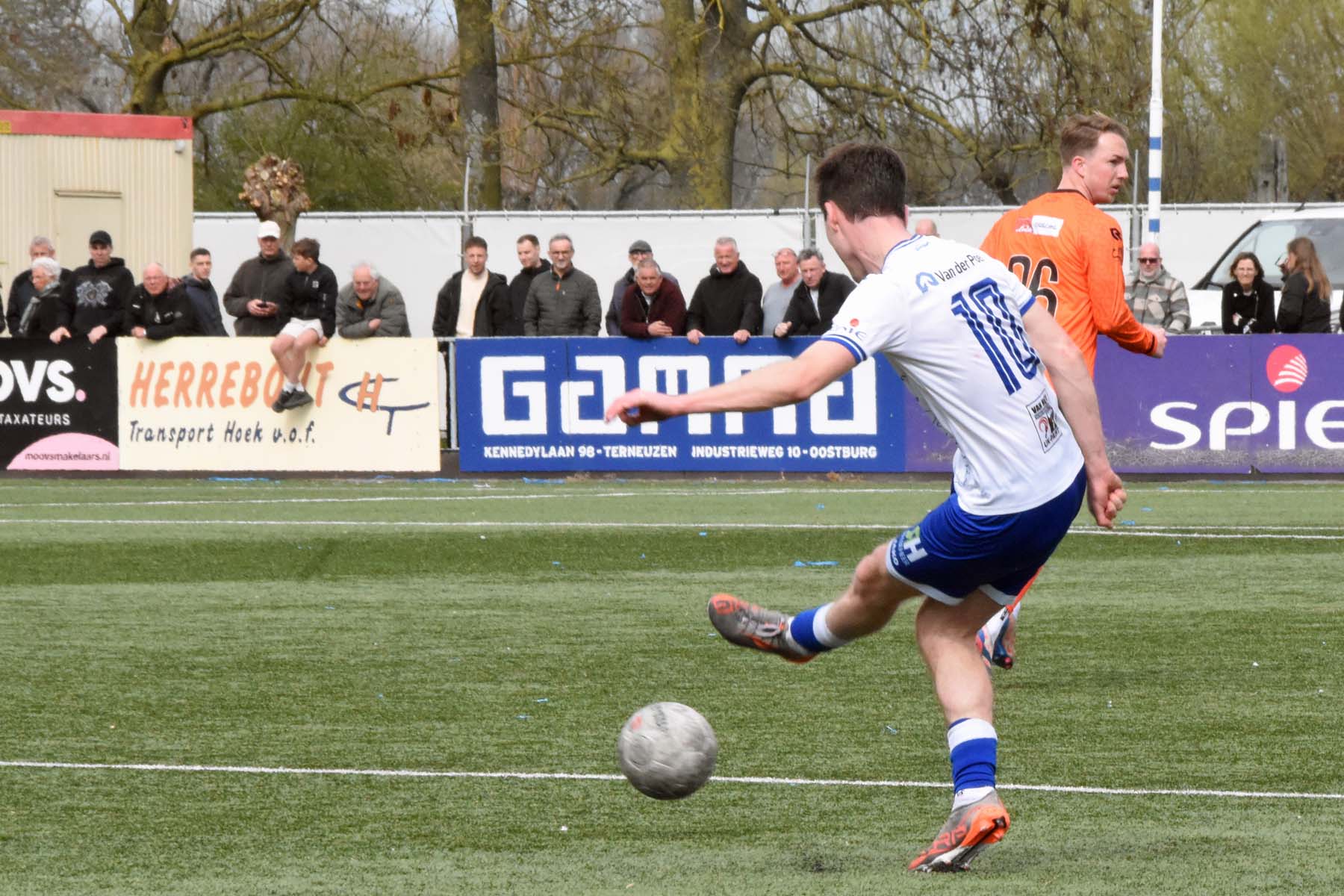 de keeper van VV Katwijk kan alleen nog naar de bal kijken. 1-0 Wout den Engelsman.