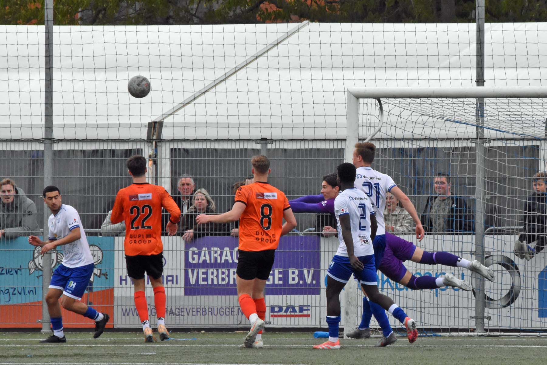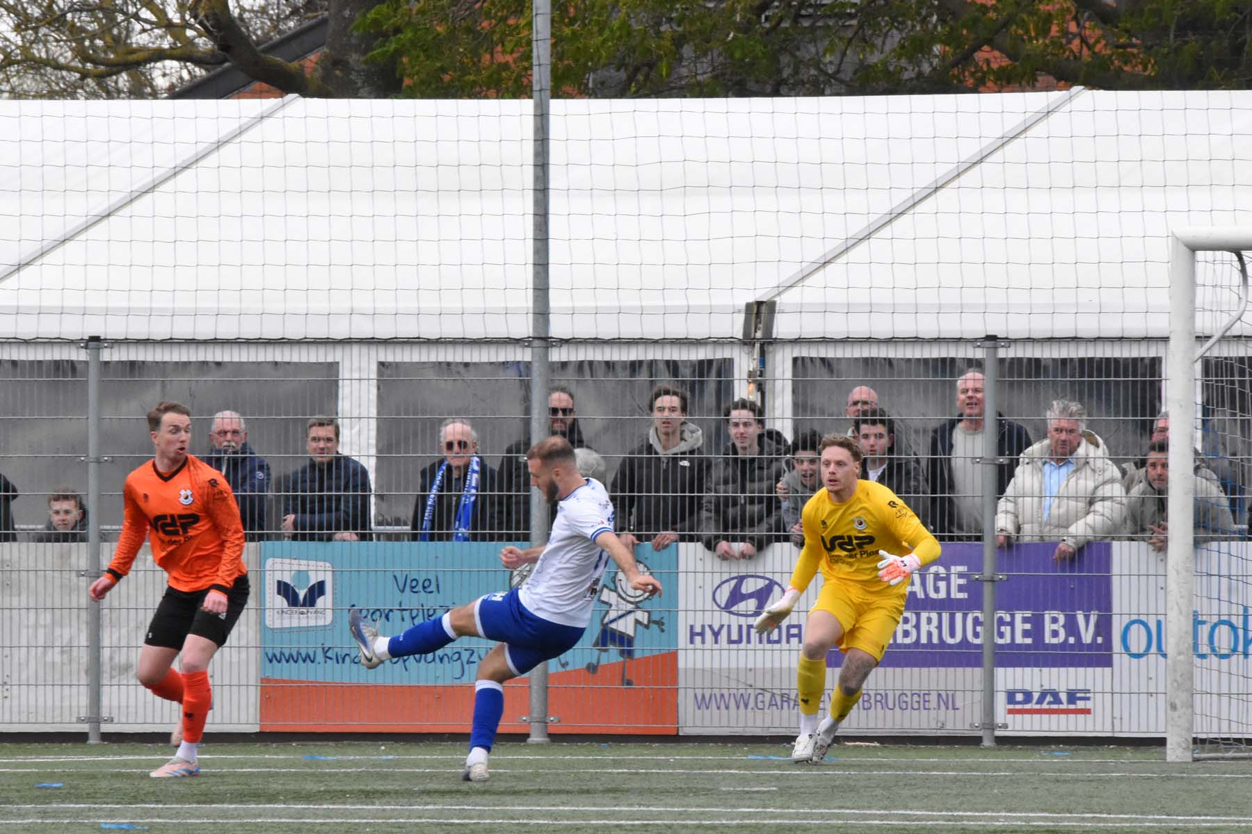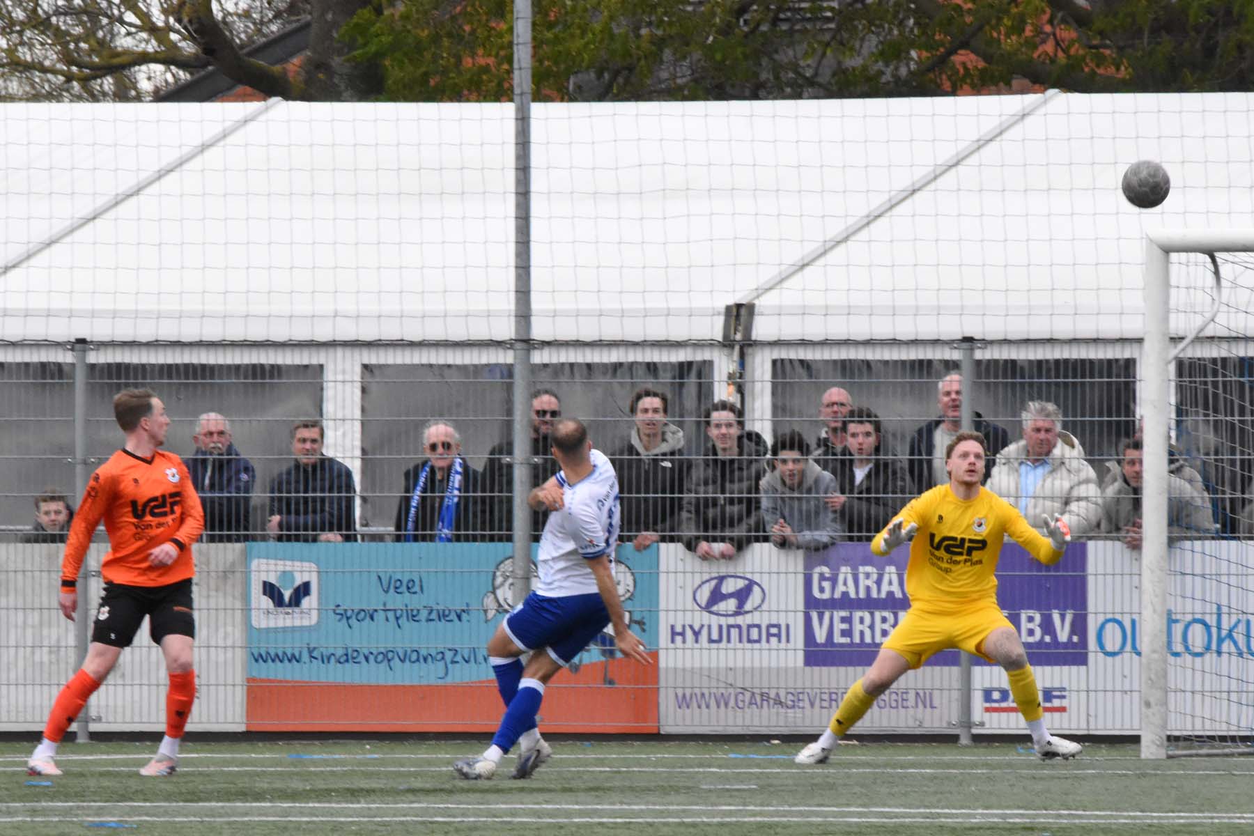 Sylvio Hage kijkt, staat er een medespeler voor het doel?..