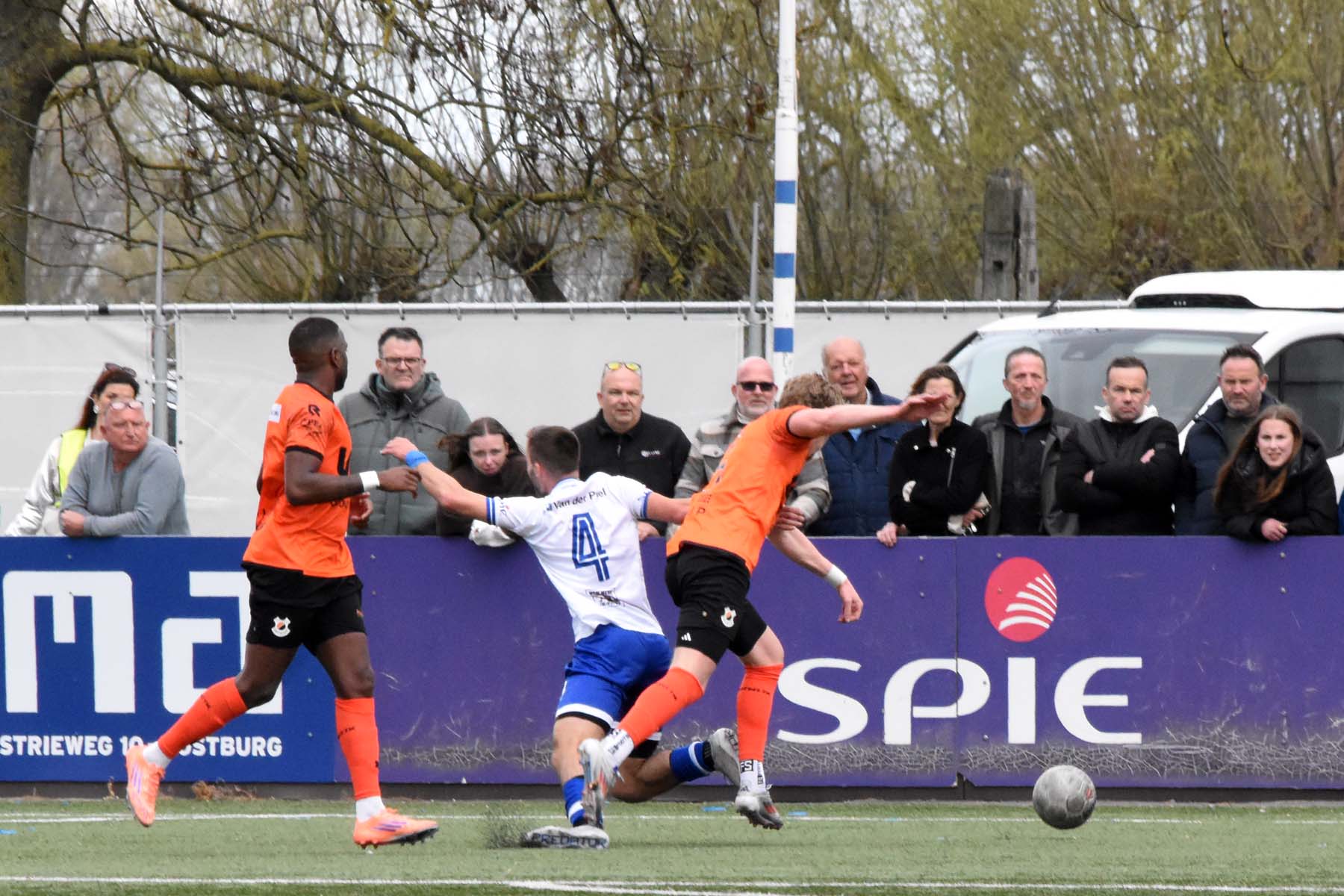 Paniek in de verdediging van VV Katwijk. Weg is weg.