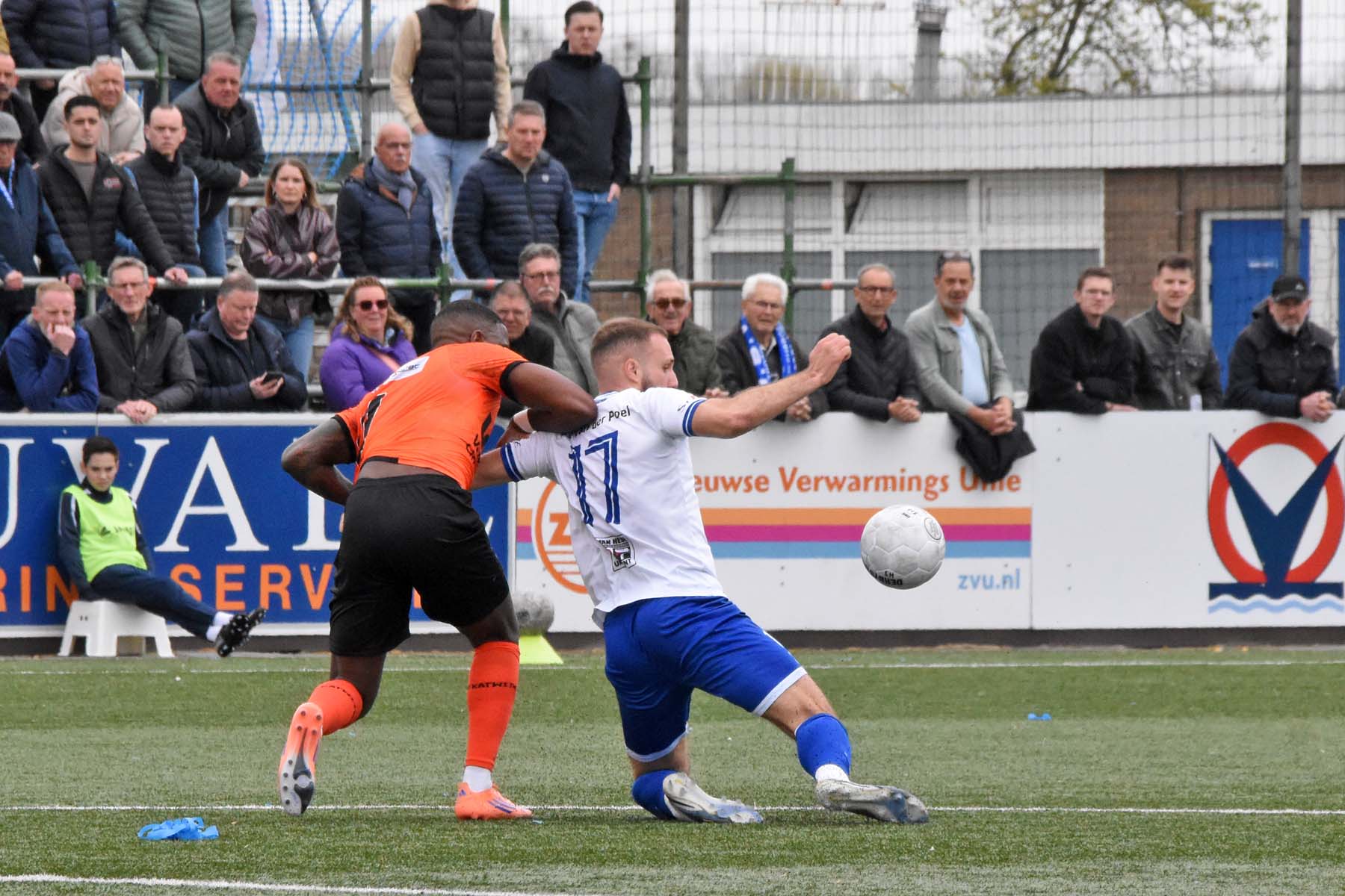 de verdediger van VV Katwijk probeert uit te verdedigen...