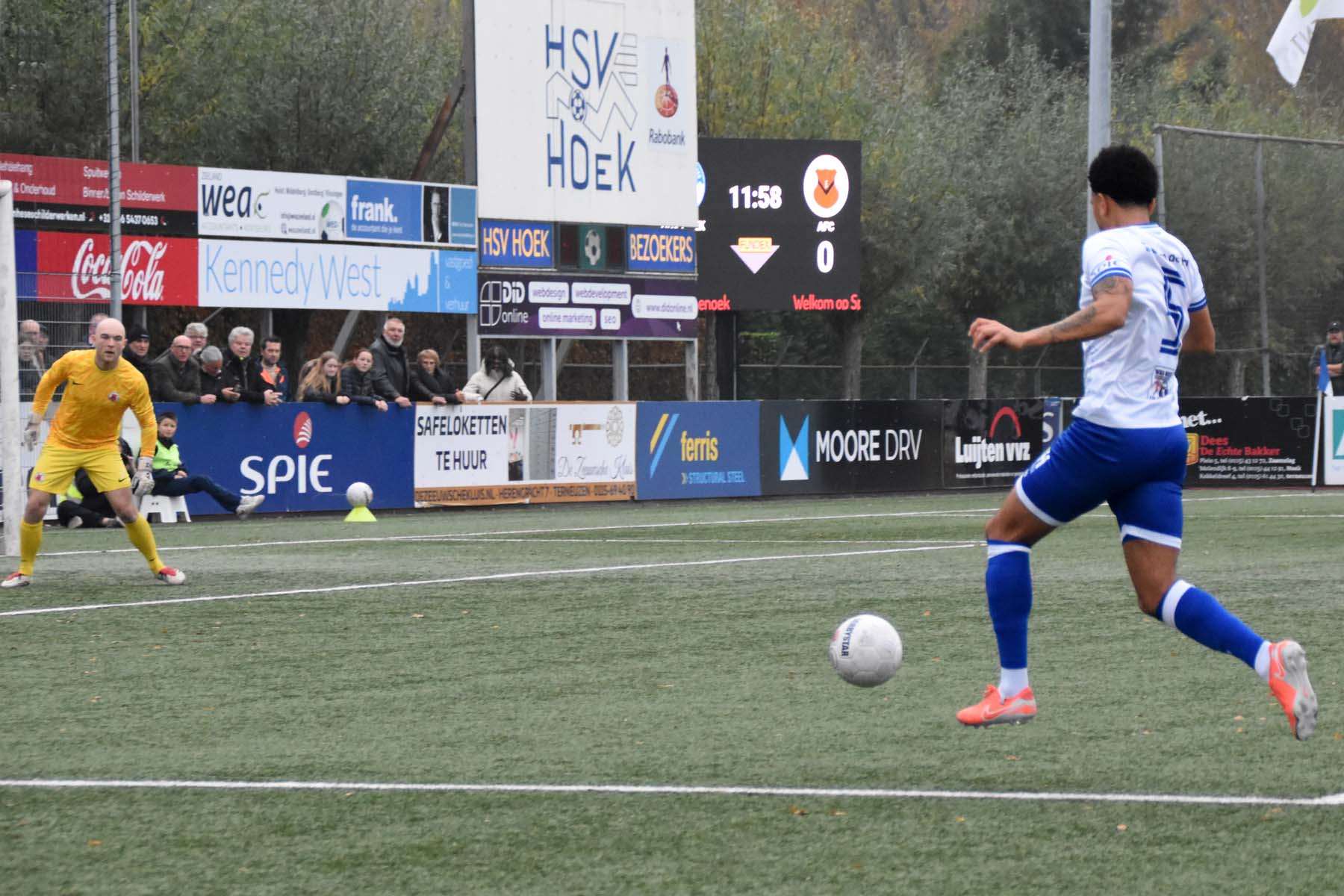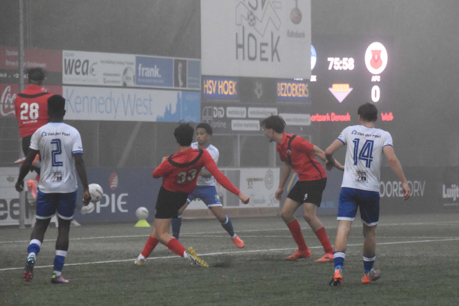 Op sportpark Denoek leek Hoek af te stevenen op een solide overwinning tegen AFC. De Zeeuwse koploper was in de eerste helft de betere ploeg, met spits Din Sula als het grootste gevaar. Ondanks dat hij het lastig had tegen de ervaren Ricardo van Rhijn, bleef Hoek aandringen. Pas vlak voor rust viel de verdiende 1-0. Na een vlotte combinatie tussen Bouirouchane en De Nooijer tikte Jarno Lion beheerst binnen. Na de pauze voerde Hoek de druk verder op. Hoewel het spel slordig bleef, kwam de 2-0 er toch: Steenpoorte hield een diepe bal knap binnen en Sula rondde zijn voorzet koel af. Op dat moment leek er geen vuiltje aan de lucht.