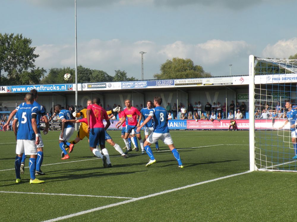 Siereveld kan nog net die bal raken, waardoor de spits van GVVV met nummer 9 er net voorbij is. Genoeg...