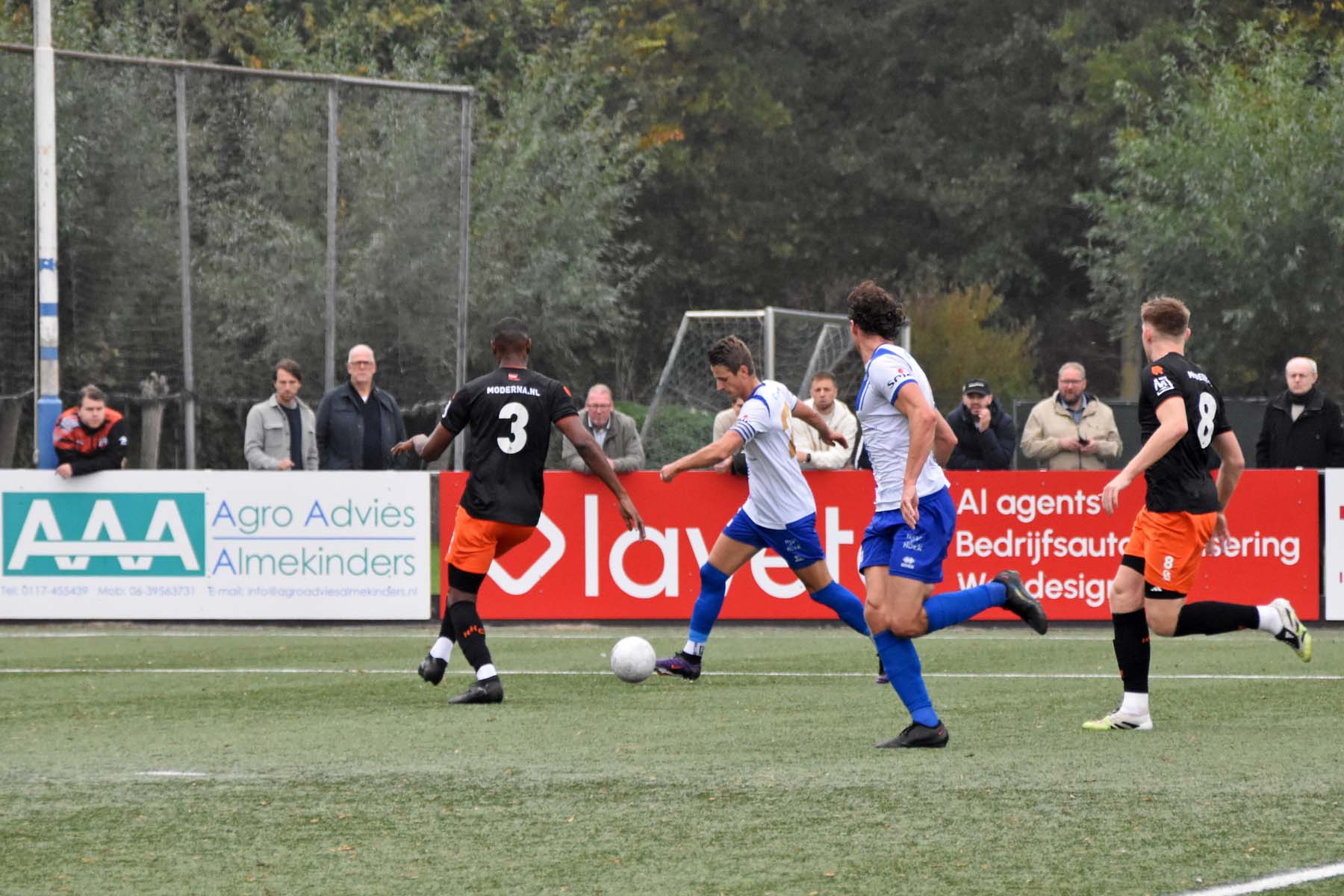 Robbie van Hauter. GertJan Martens zoekt zijn plek weer op voor het doel. Robbie van Hauter geeft voor..