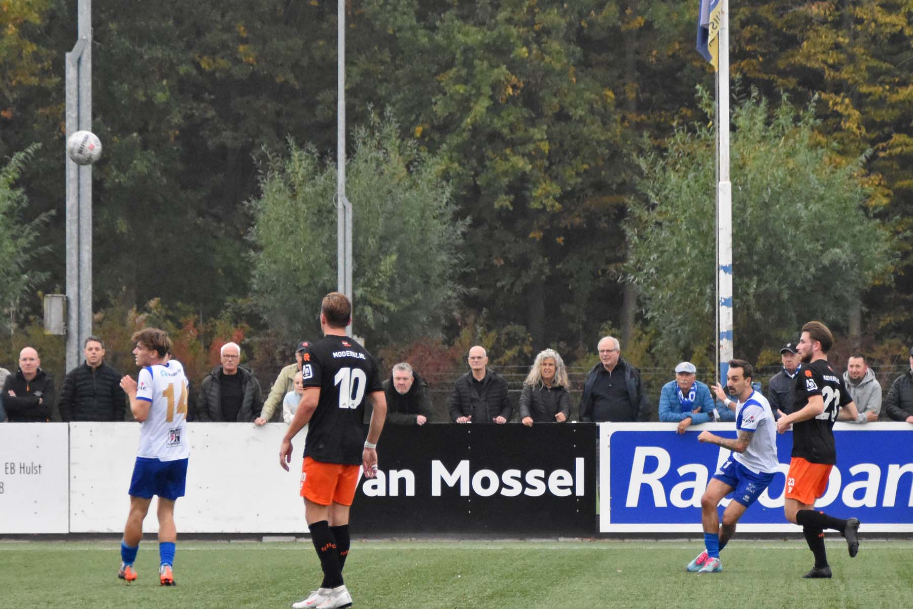 door het vroeg druk zetten van HSV Hoek raken ze bij HHC Hardenberg in paniek. De verdediger van HHC schiet de bal over de zijlijn..