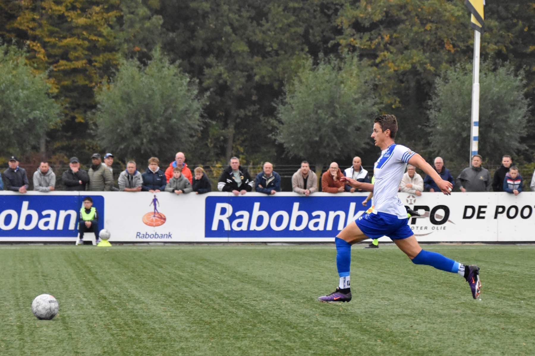buitenkant voet legt Sylvio Hage de bal terug op...