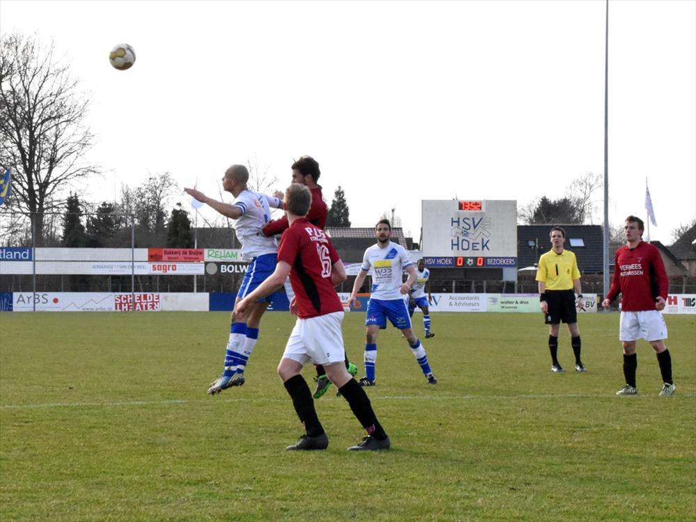 Hoek speelde vanmiddag tegen de nummer drie van de ranglijst, FC Rijnvogels, een moeizame wedstrijd. De ploeg van Jannes Tant was de bovenliggende partij maar kon dit niet uitdrukken in doelpunten. Het eerste doelpunt van de wedstrijd kwam een minuut voor tijd van FC Rijnvogels. De bezoekers dachten de overwinning te vieren maar dat was buitenom Guillaume Clinckemaillie gerekend. In blessuretijd kapte de Belg zich vrij en krulde de bal in de verre hoek. Hoewel er meer in zat mocht Hoek toch blij zijn met een gelijk spel.