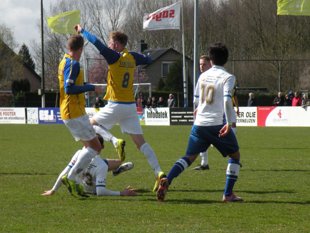 In de stromende regen maakte Hoek in blessuretijd nog 3-0. Guillaume Clinckemaillie wilde in de zestien uithalen maar de bal werd door een verdediger weggetikt richting de doelman. Deze pakte de bal op waarna scheidsrechter van de Vrande oordeelde dat het een terugspeelbal was die doelman Mark de Vries niet had mogen pakken.