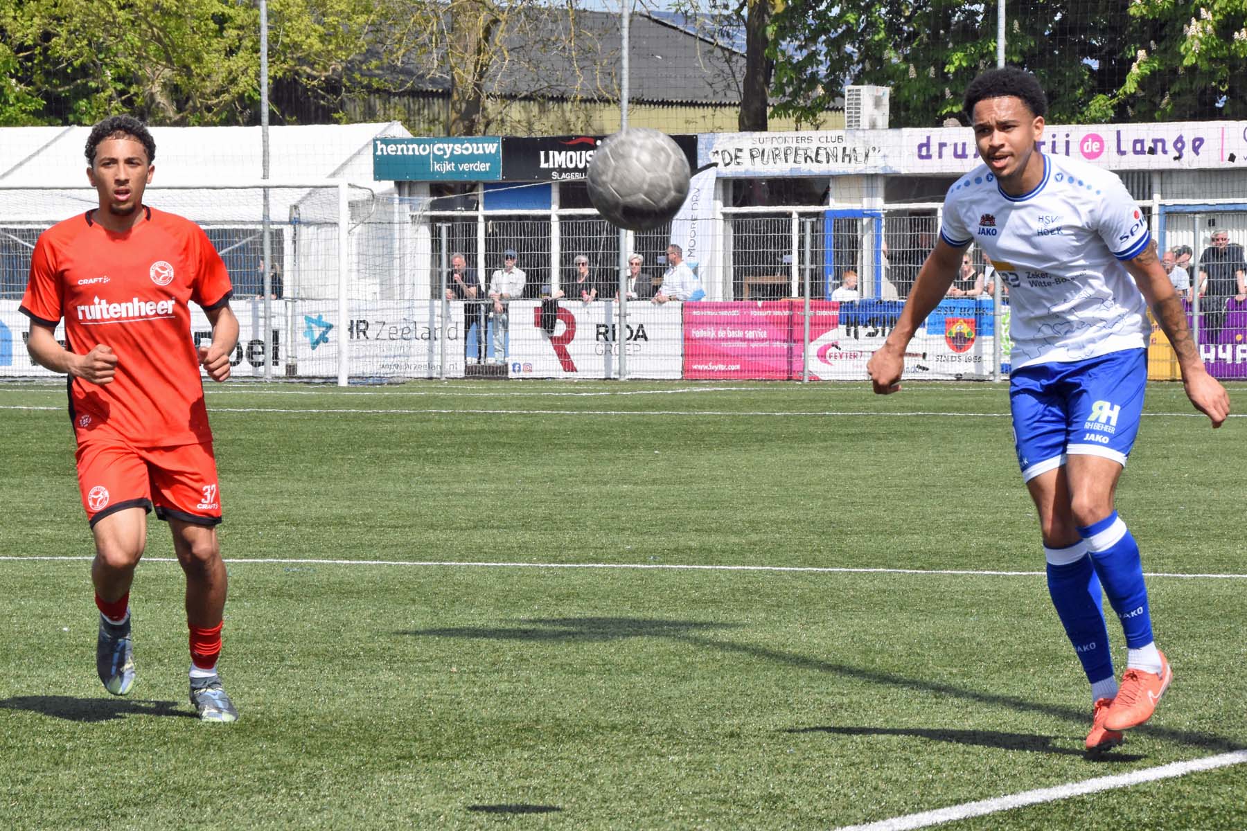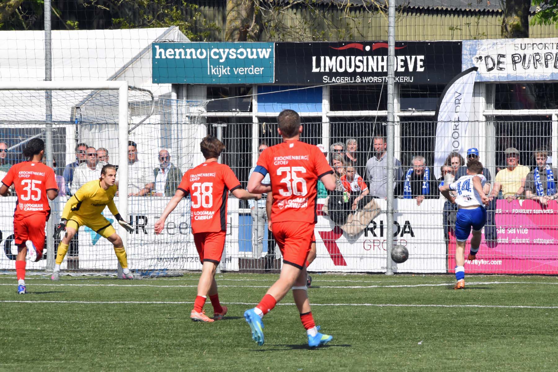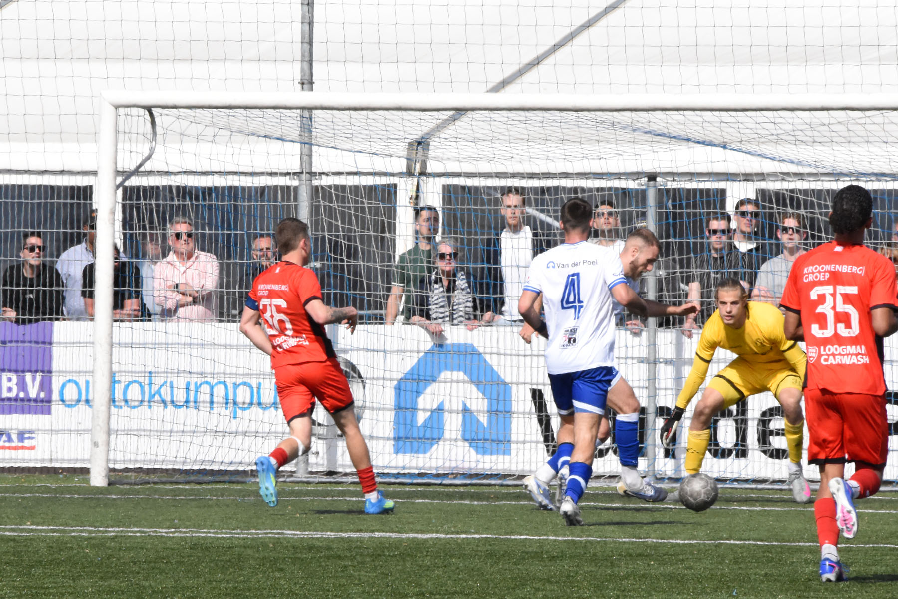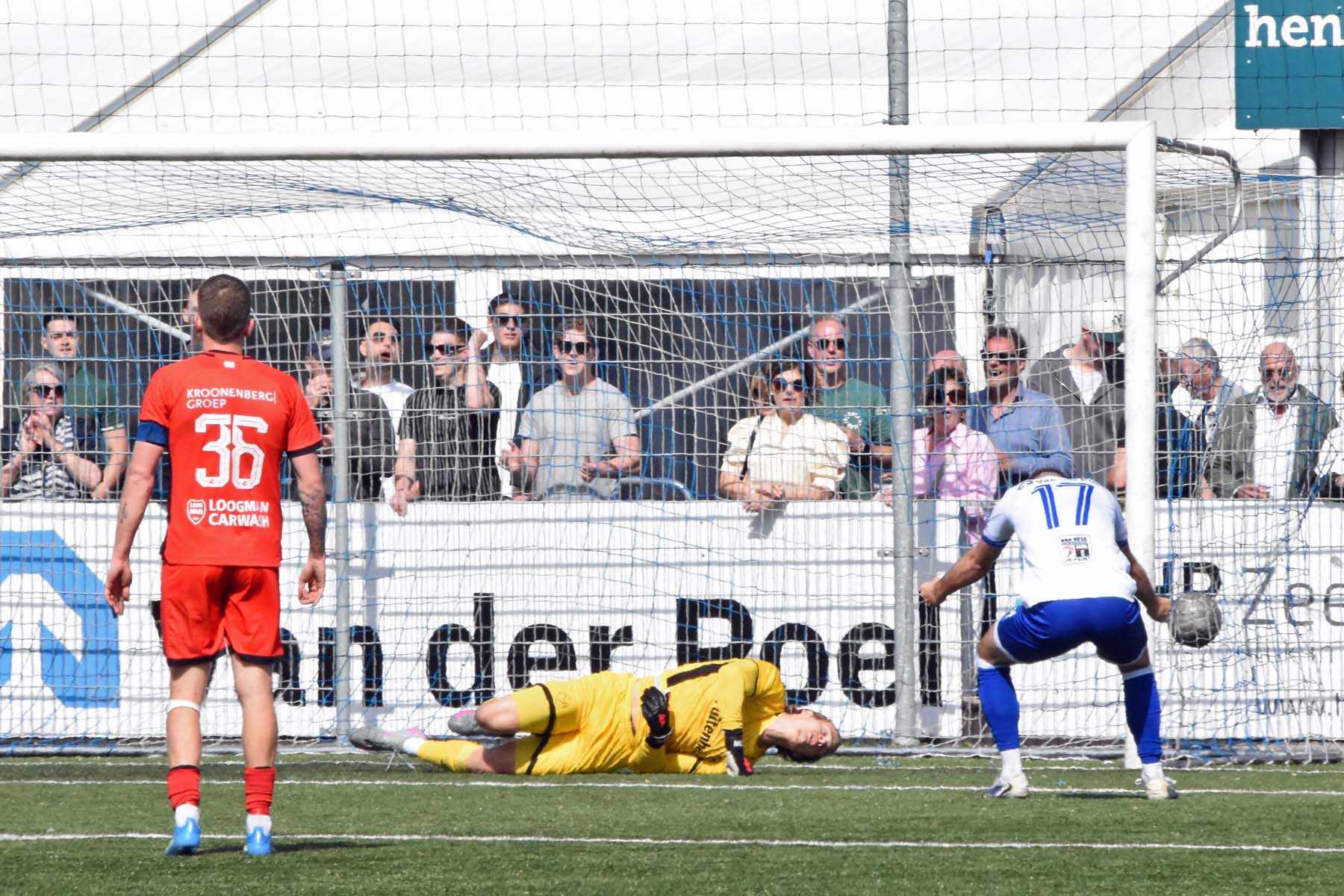 veel supporters van HSV Hoek vragen zich af "is die bal over de lijn?"