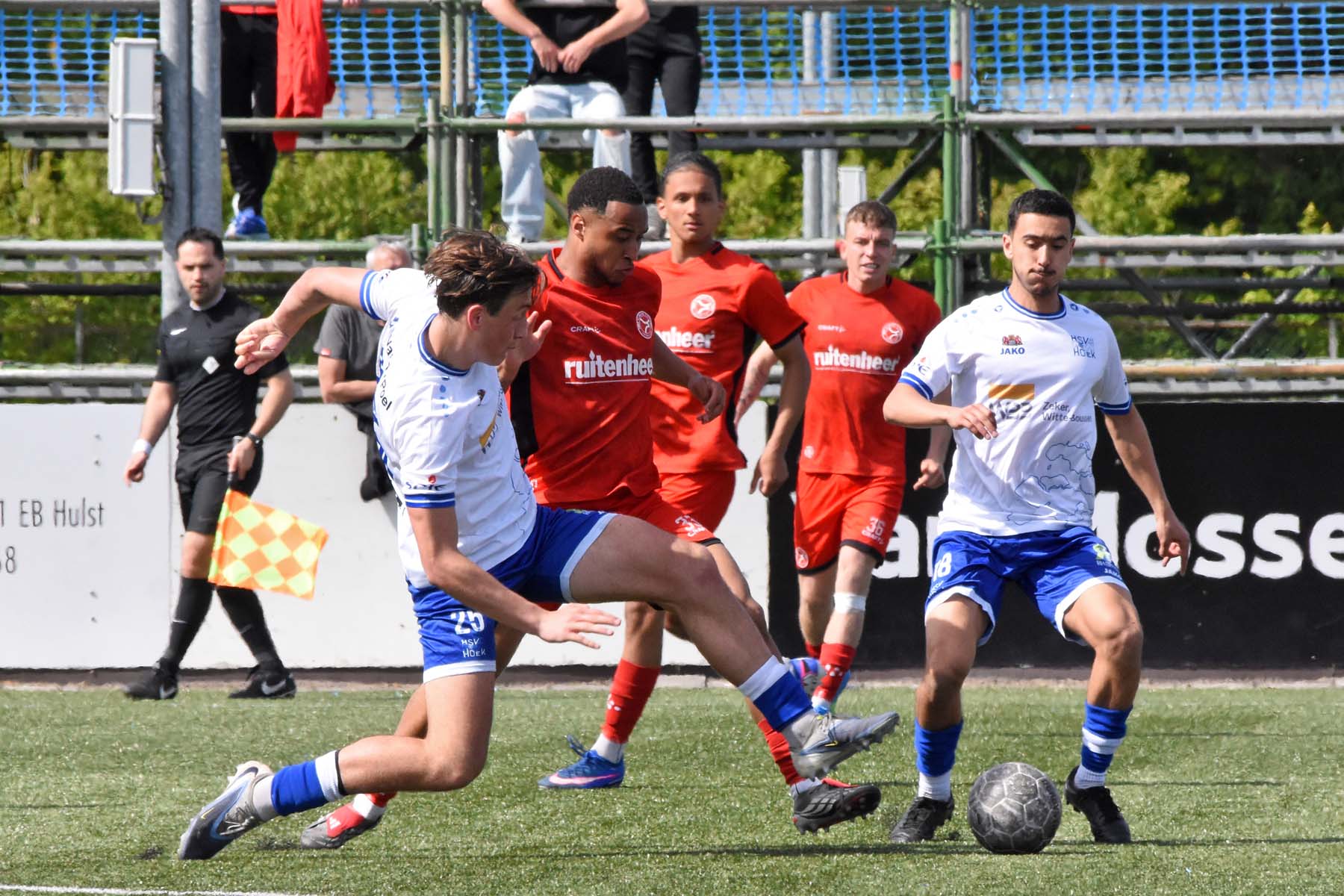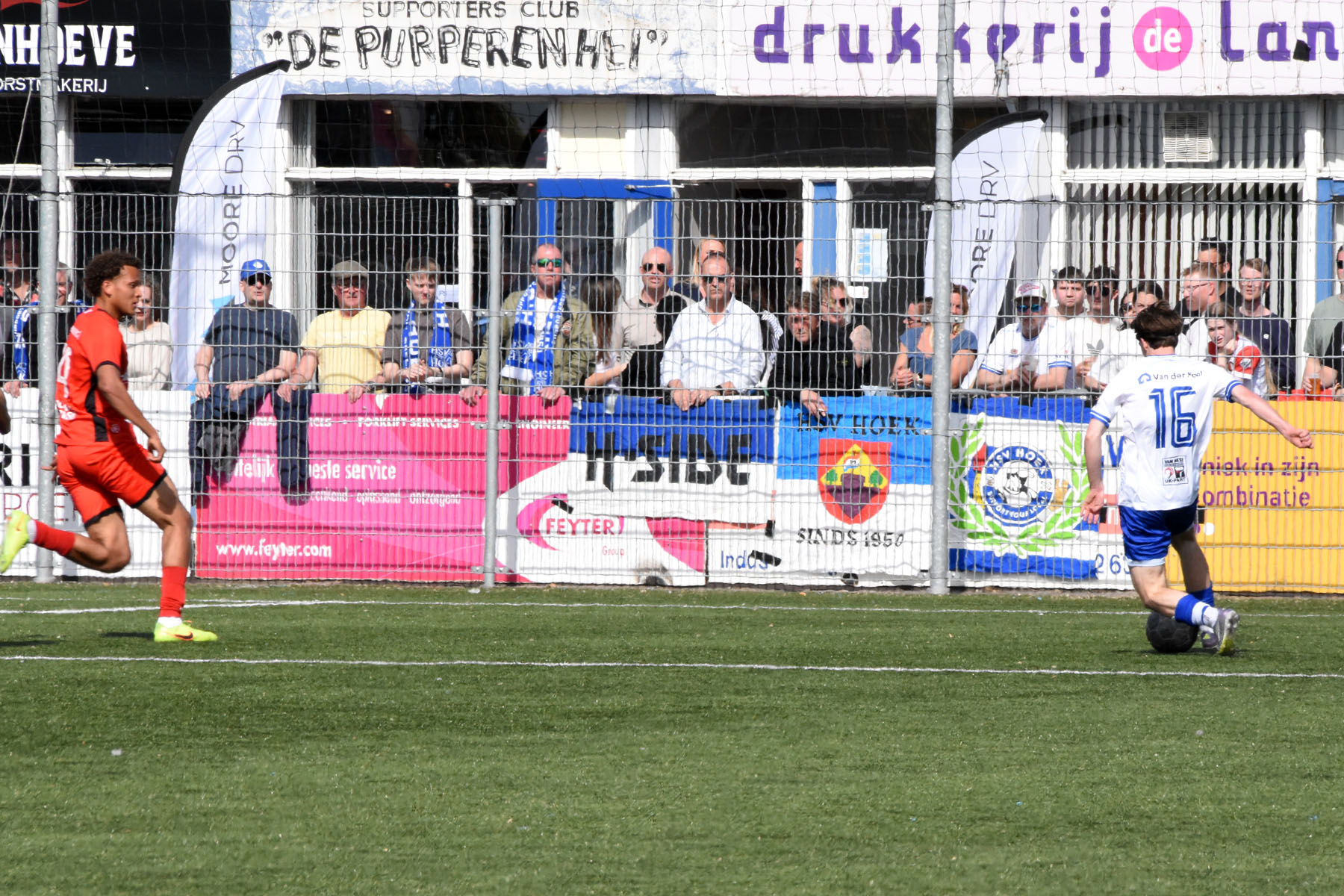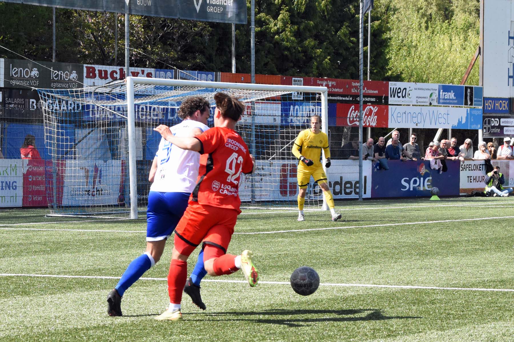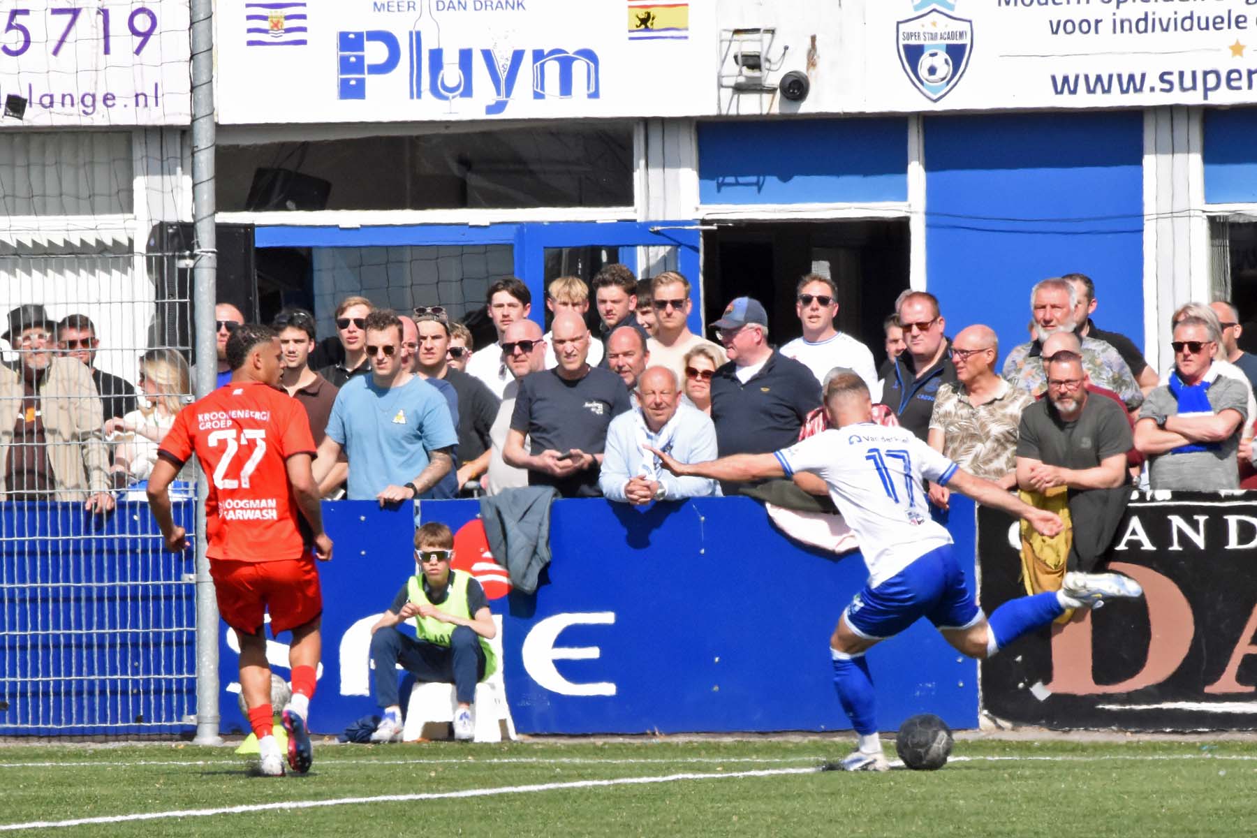 de bal breed te leggen, helaas achter spits Din Sula. De supporters van HSV Hoek vragen zich af "Waarom schoot hij niet zelf?"