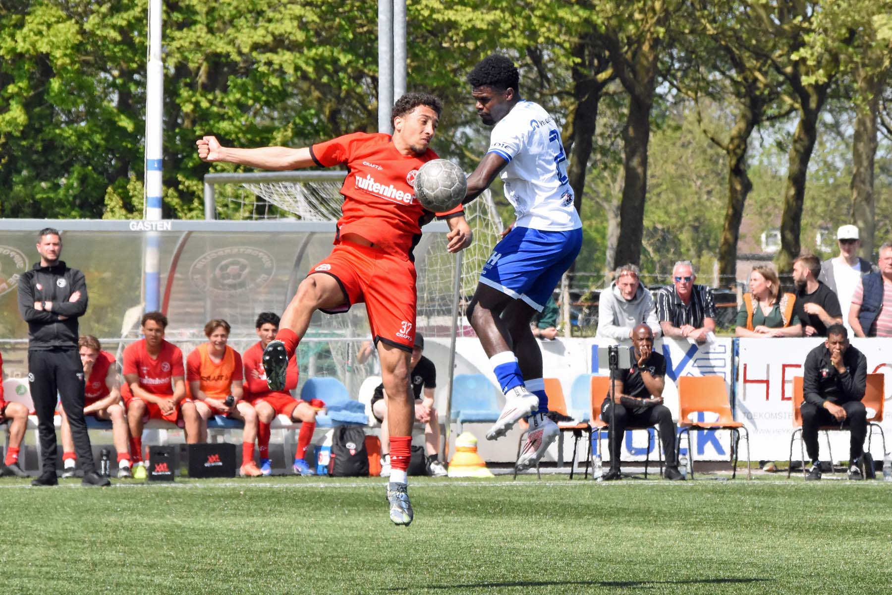 Tweede helft. Is 1-0 genoeg of kan HSV Hoek de score uitbouwen? Jong Almere City komt fel uit het kleedlokaal. Wout den Engelsman zet de tackle op de bal in..