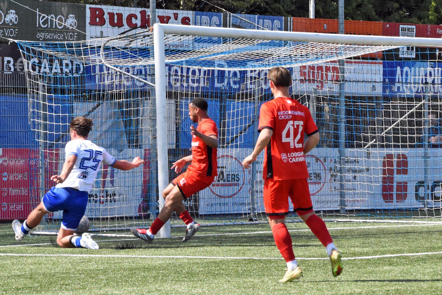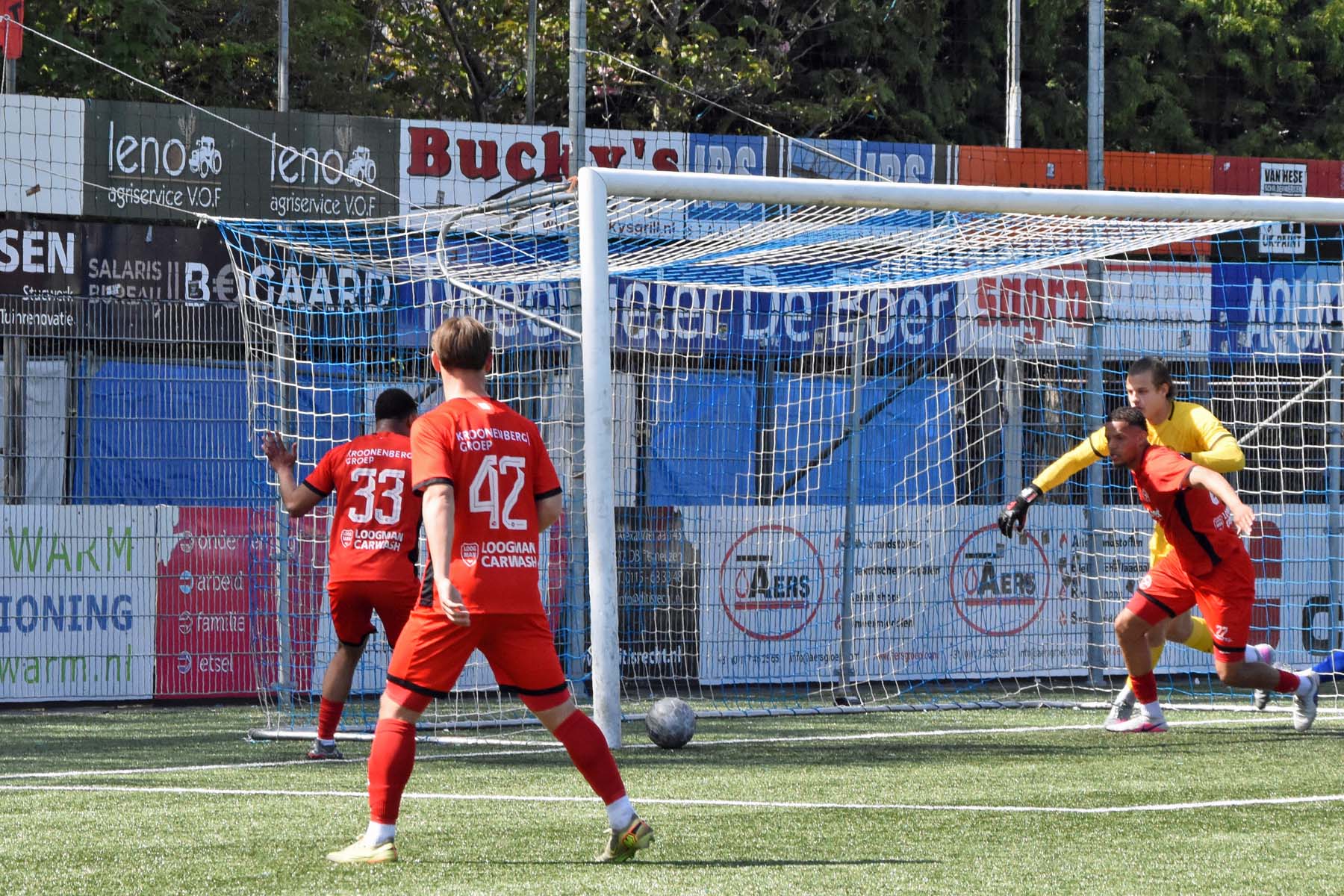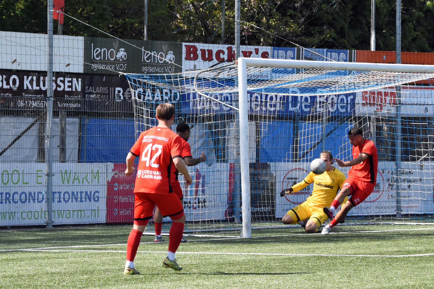 op het dak van het doel. Wat een kans.