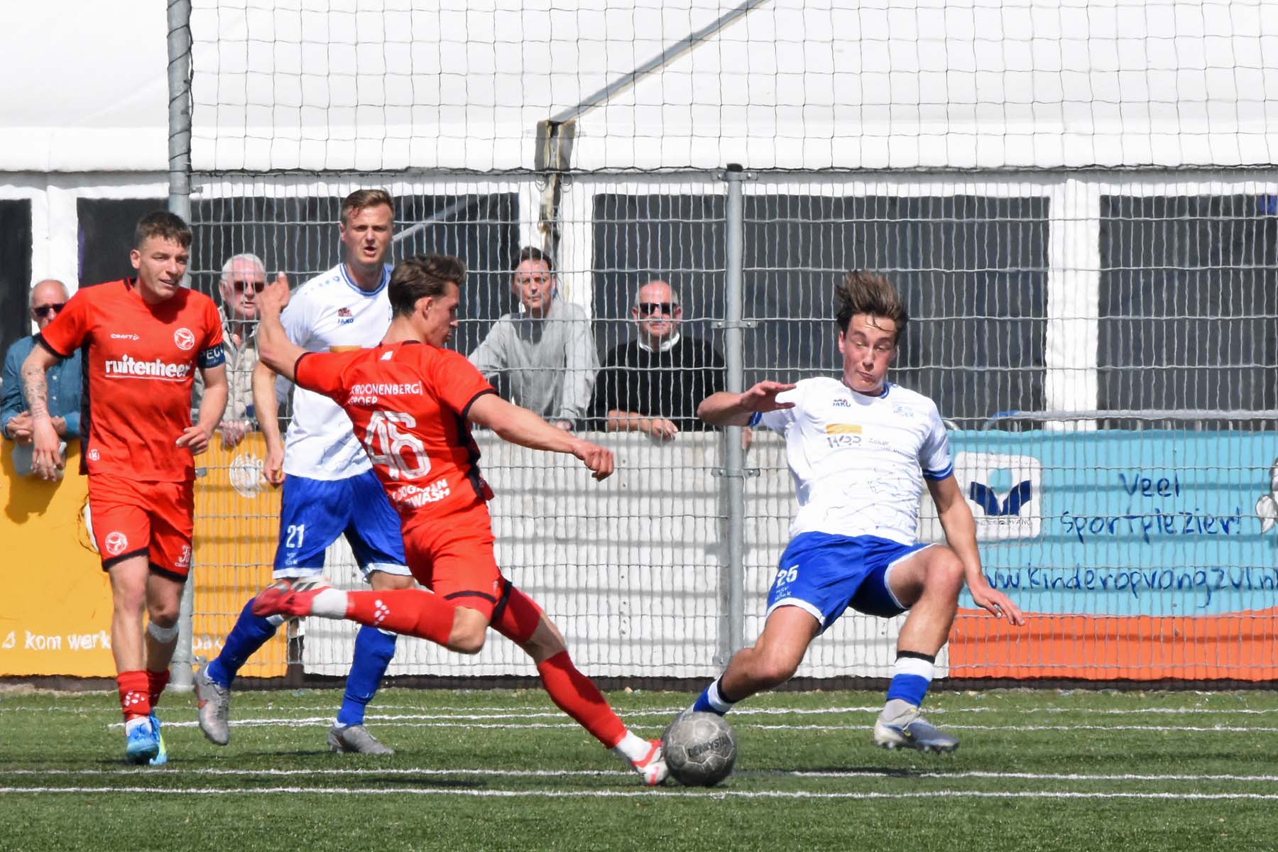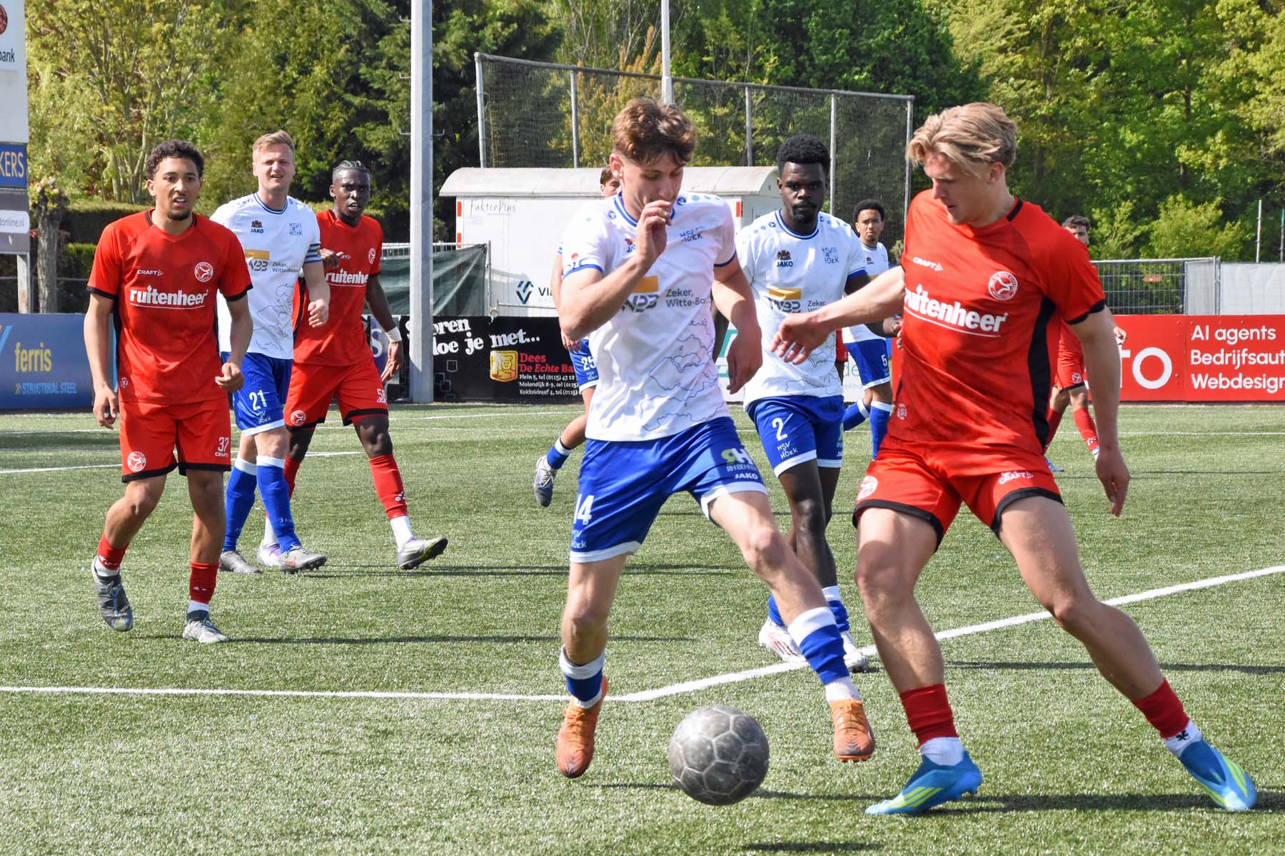 Jong Almere City probeert een keer gevaarlijk te worden. Bij HSV Hoek gooien zichzelf voor de bal.