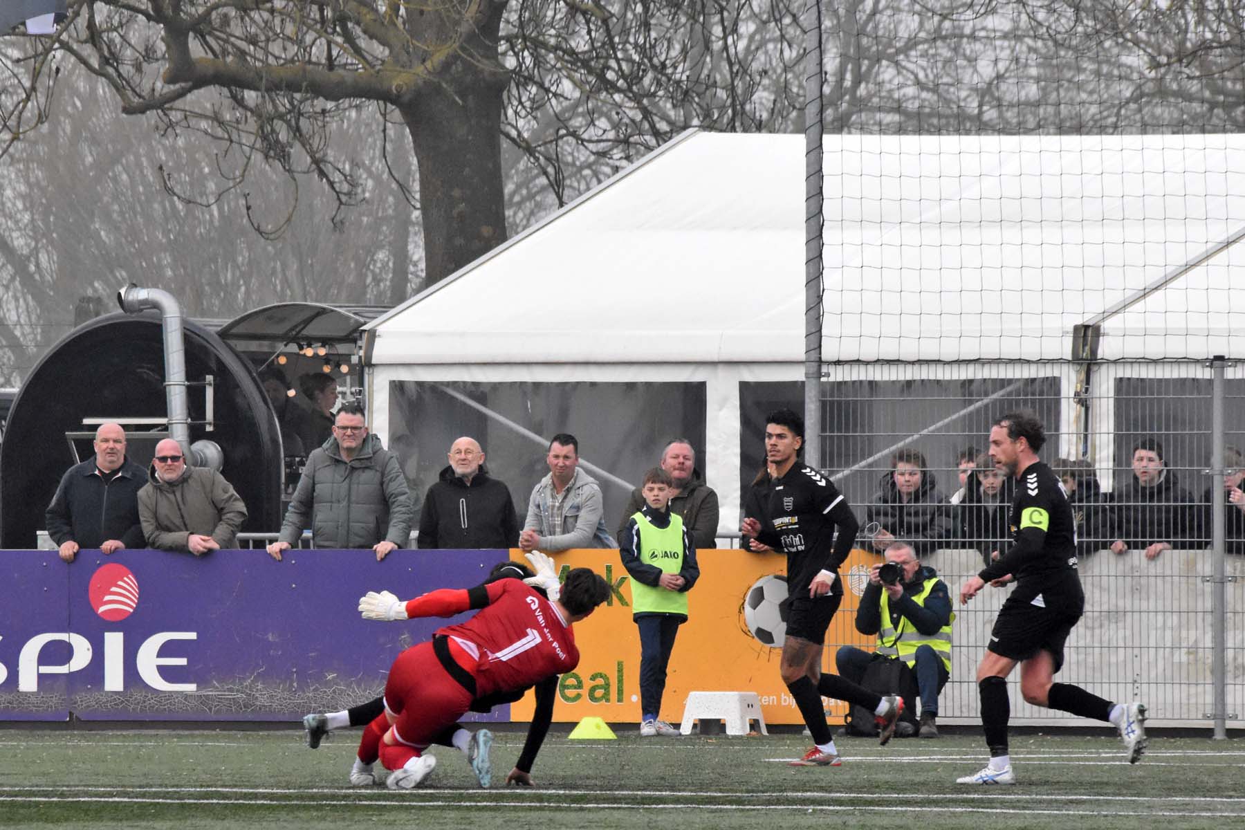 Uit het niets viel rond de twintigste minuut de 0-1. GVVV ontsnapte via een counter en Arwin van Soest dwong Finn Murre tot een knappe redding. Bij de daaropvolgende hoekschop ging het alsnog mis. Murre bokste de bal bij de eerste paal ongelukkig tegen Justin Spies aan, waarna de bal het doel in rolde.