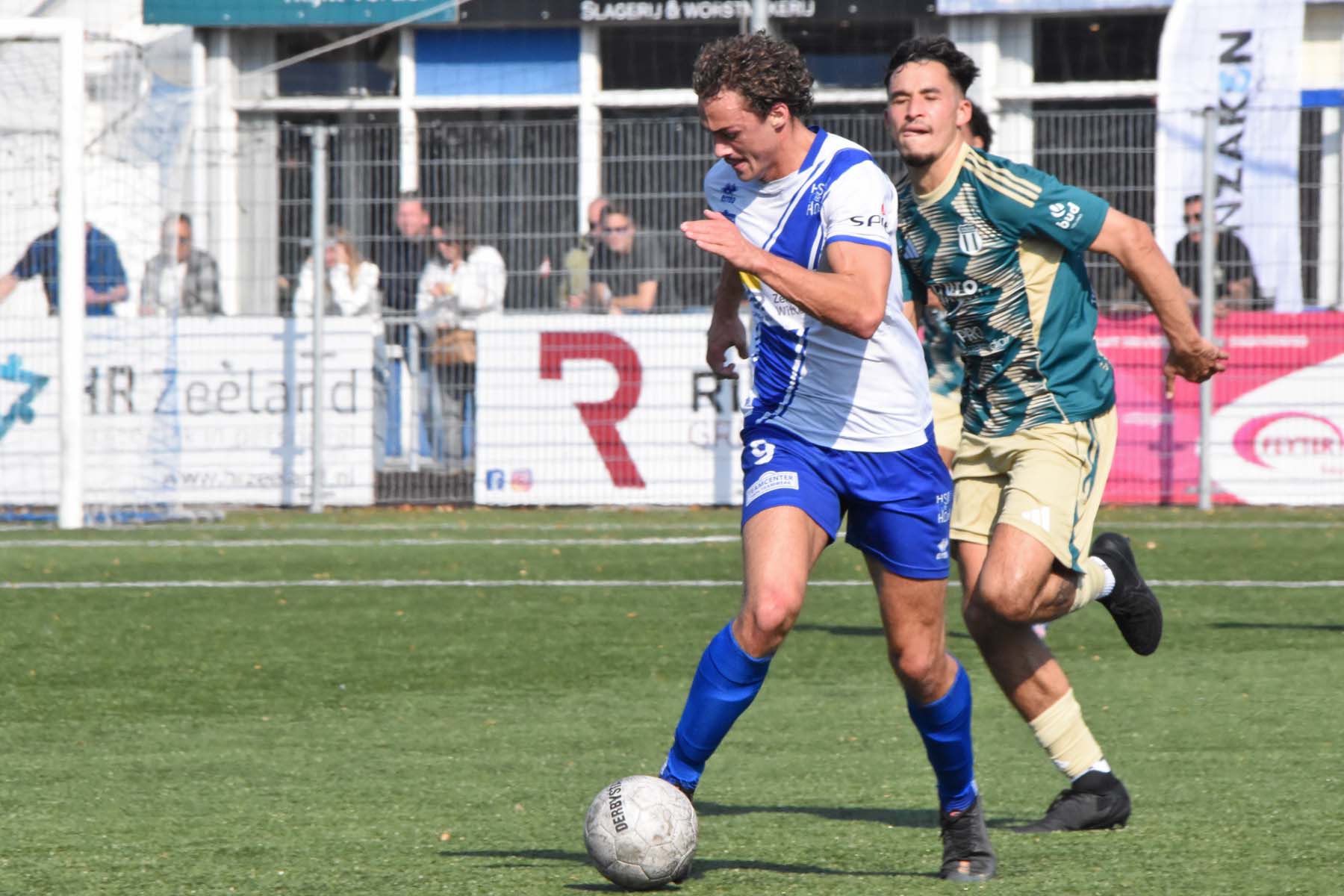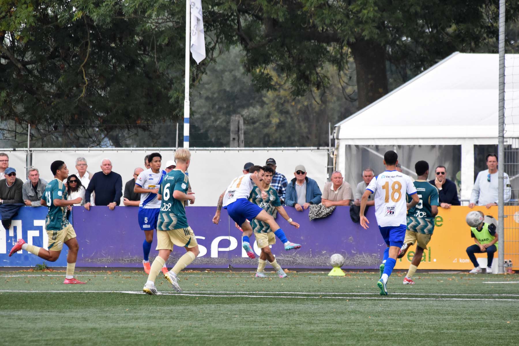 Corner voor Excelsior Maassluis. Wout den Engelsman gooit zich voor zijn directe tegenstander en kopt de bal weg.