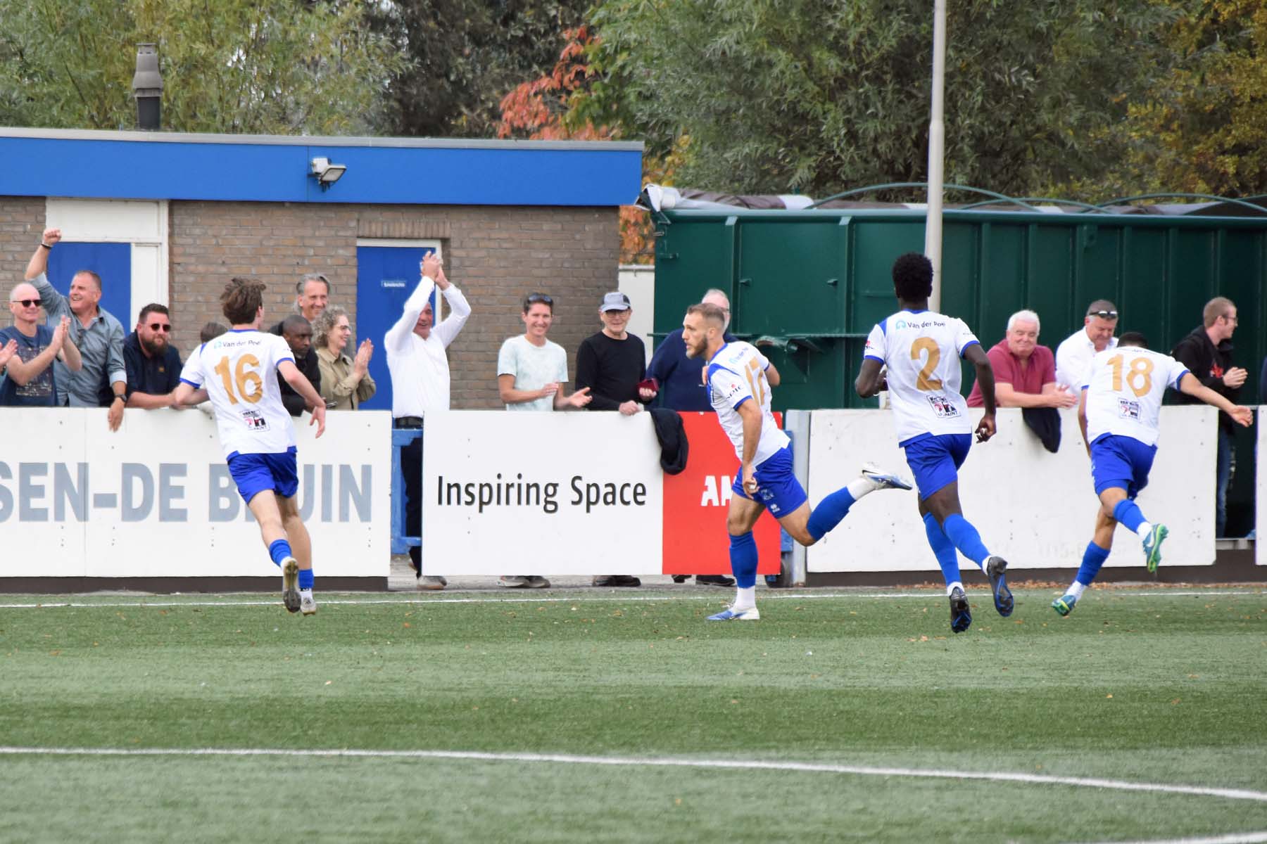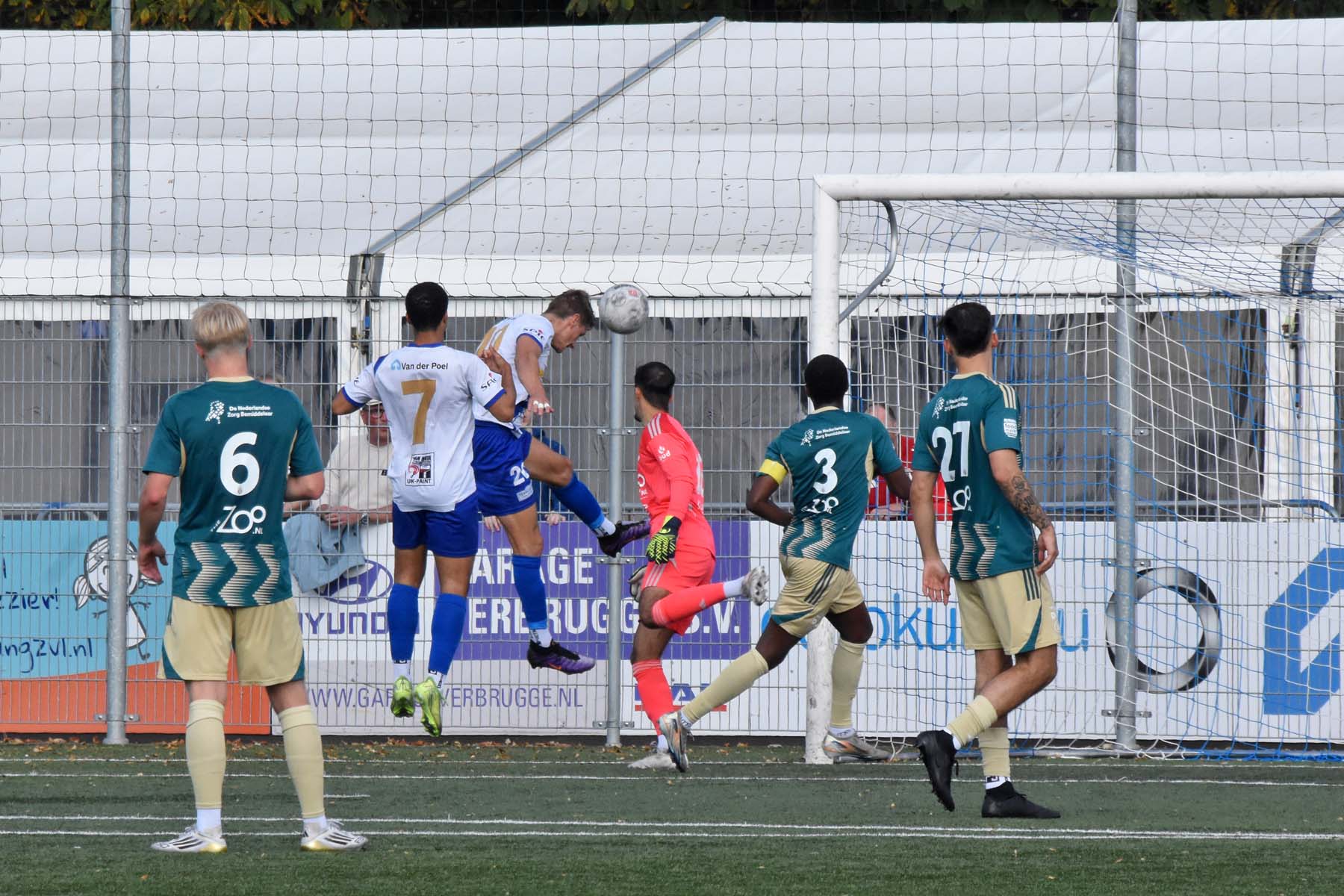 Wout den Engelsman kopt weg voordat Excelsior Maassluis gevaarlijk kan worden.