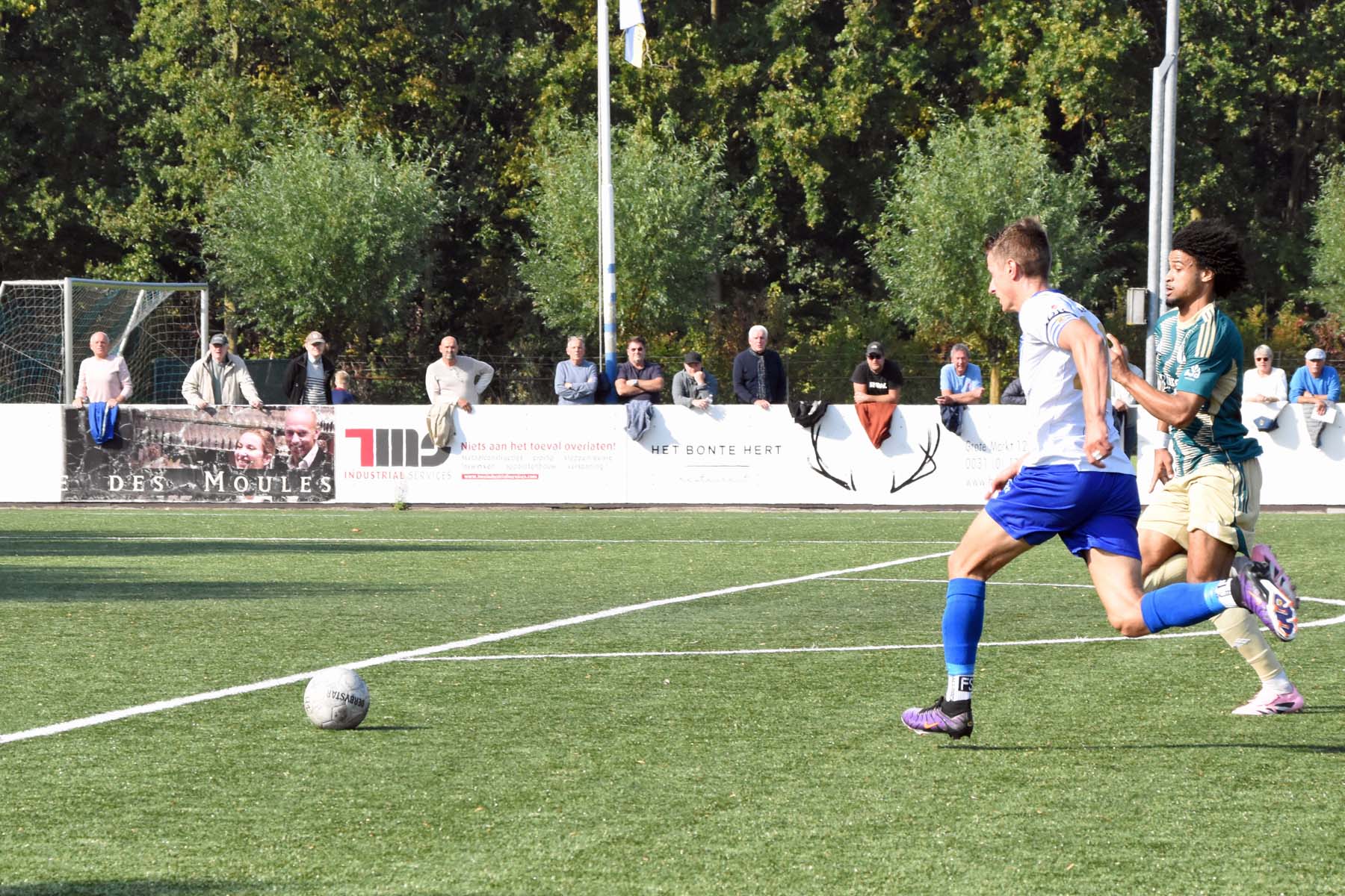 Sylvio Hage probeert het van een afstandje, de bal wordt nog aangeraakt..