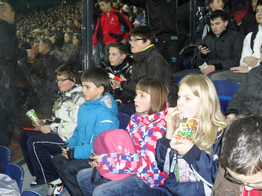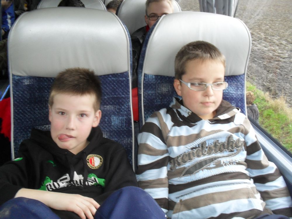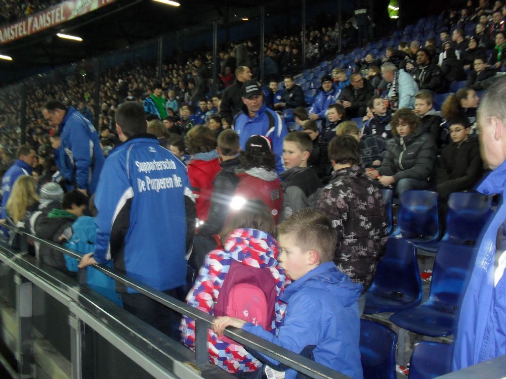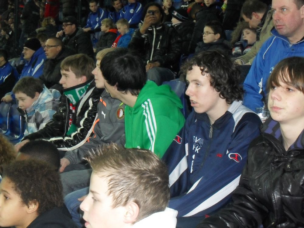 Op wat regen na onderweg verliep de heenreis perfect en waren we rond kwart over zeven in Rotterdam. Iedereen kreeg een pakje drinken mee en er was ook chips. Per team verzamelen en daarna op het gemakje naar dat prachtige stadion De Kuip. In vak G zaten ook veel jeugdvoetballers van andere verenigingen. Heel gezellig. De proppen papier vlogen om je oren.